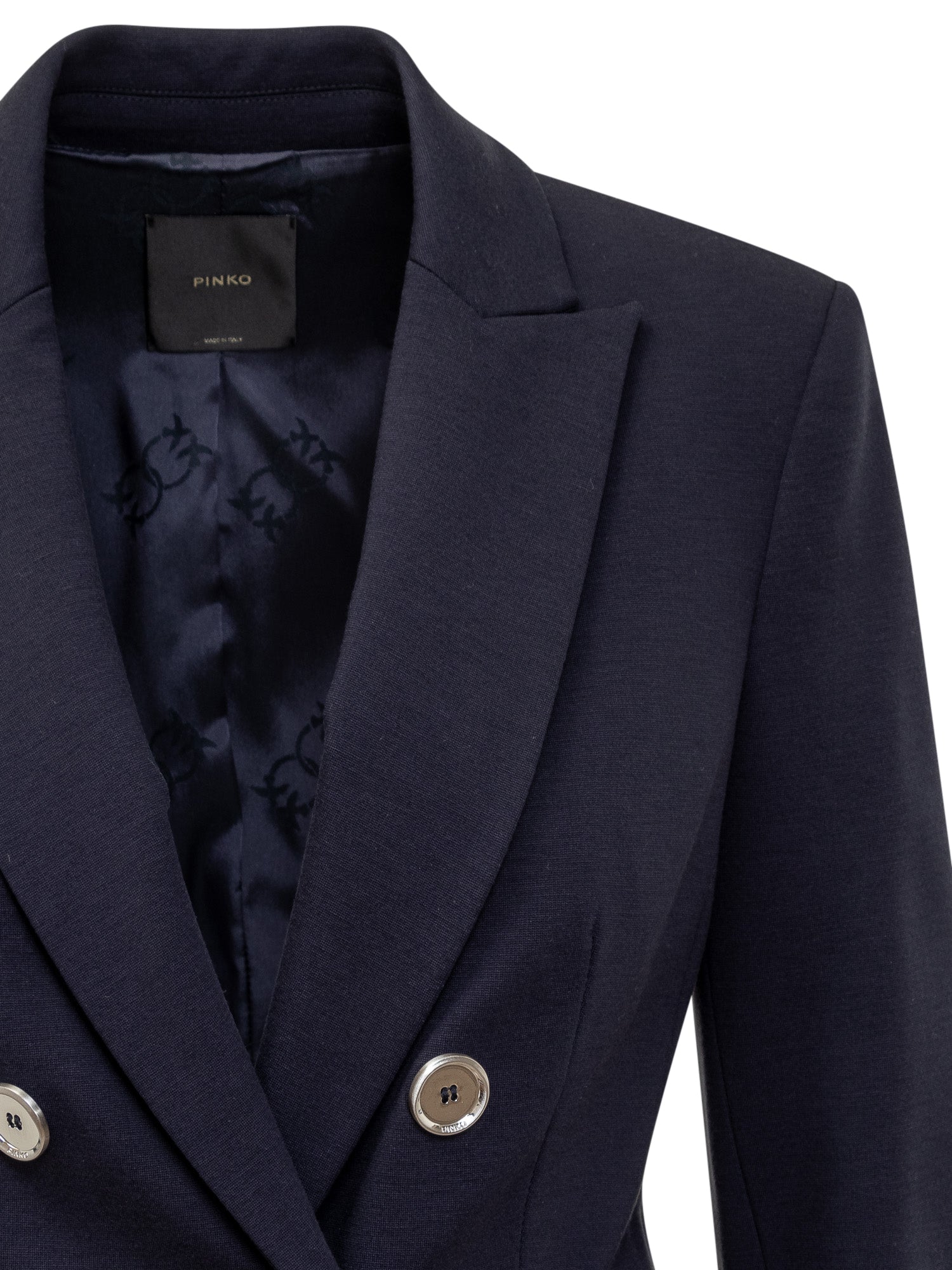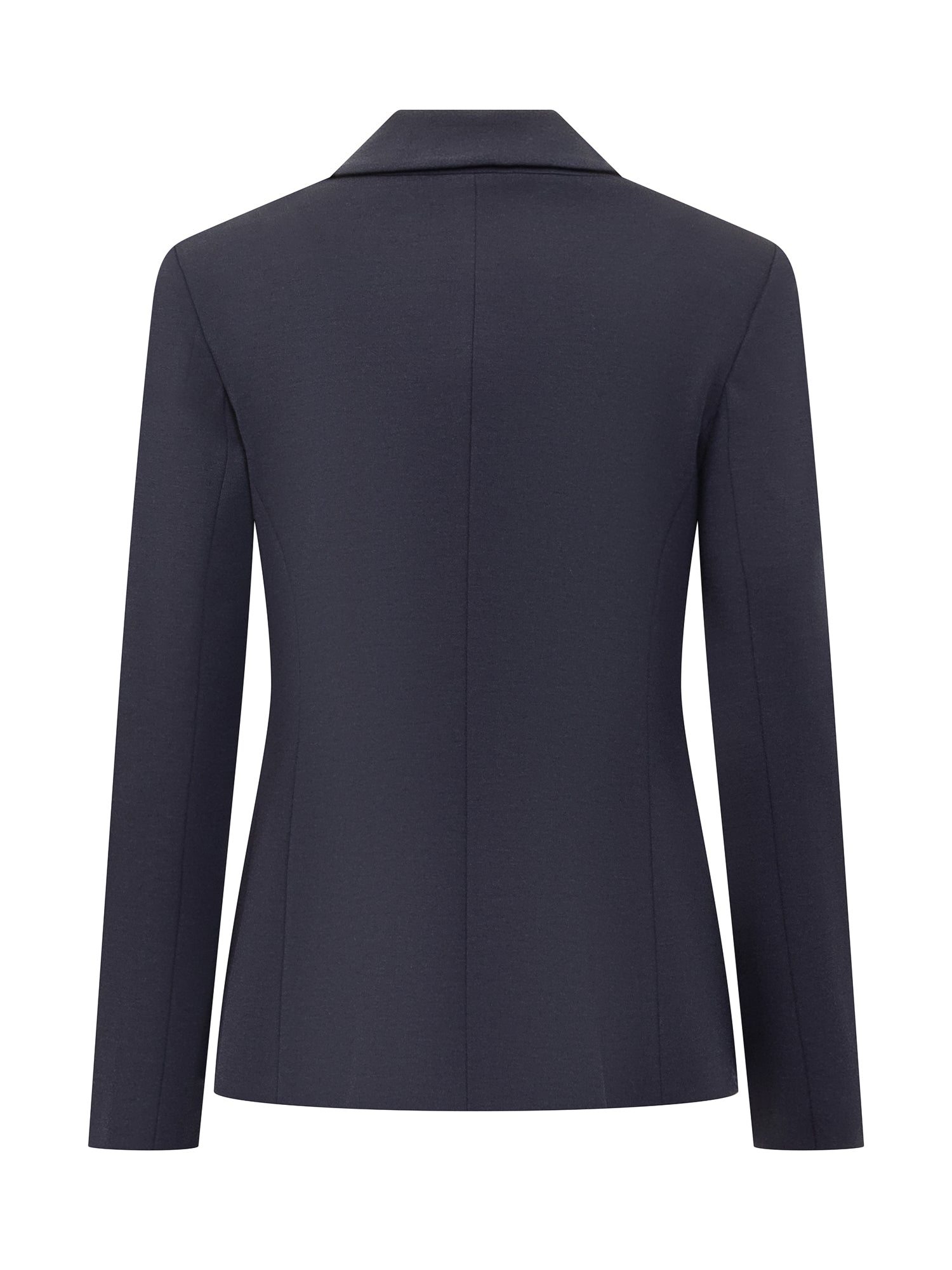 Blazer a maniche lunghe in tessuto tecnico di viscosa stretch lavorata a punto stoffa. Collo revers. Chiusura doppiopetto con bottoni in metallo. Due tasche a filetto sui fianchi. Foderata.