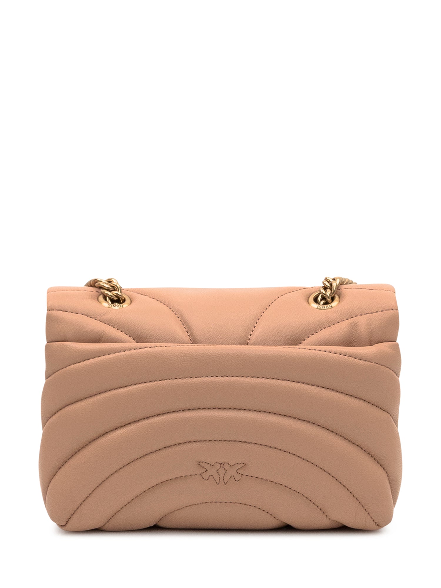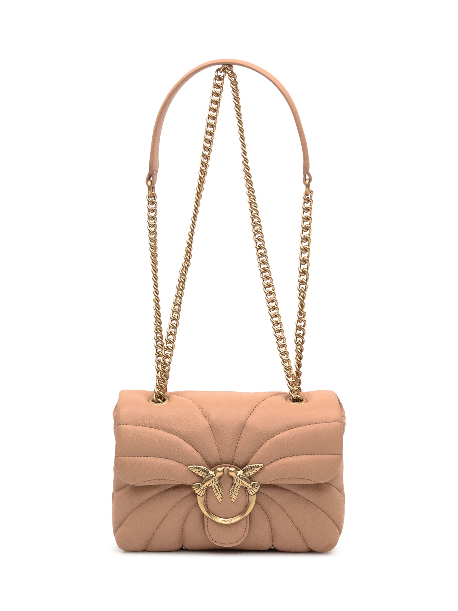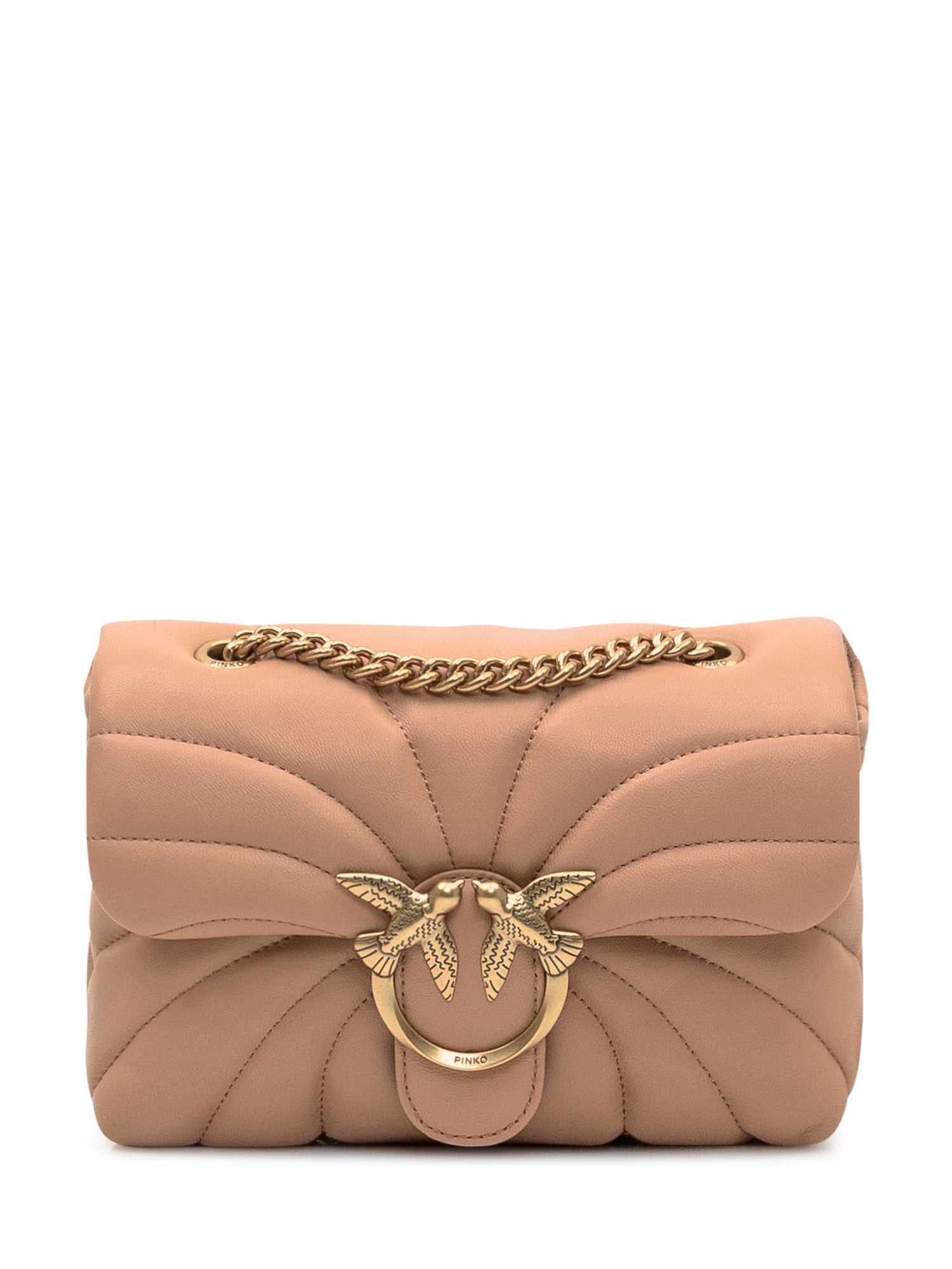 Borsa Pinko Love Classic Puff in pelle trapuntata color nude con motivo a raggiera. Chiusura con iconiche rondini dorate, catena metallica e silhouette morbida.