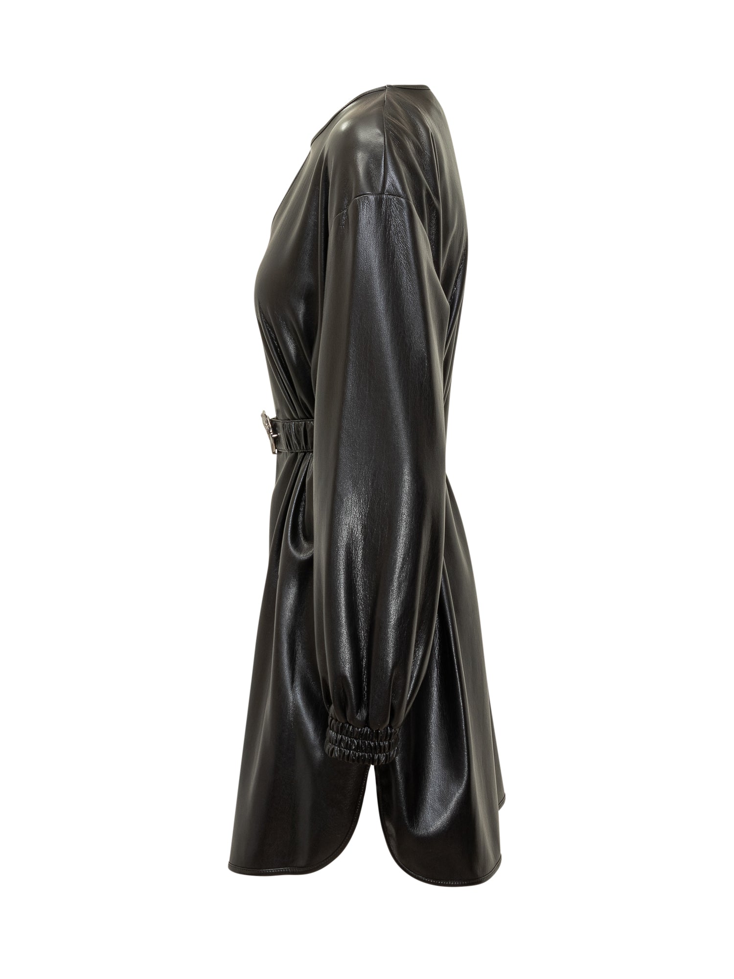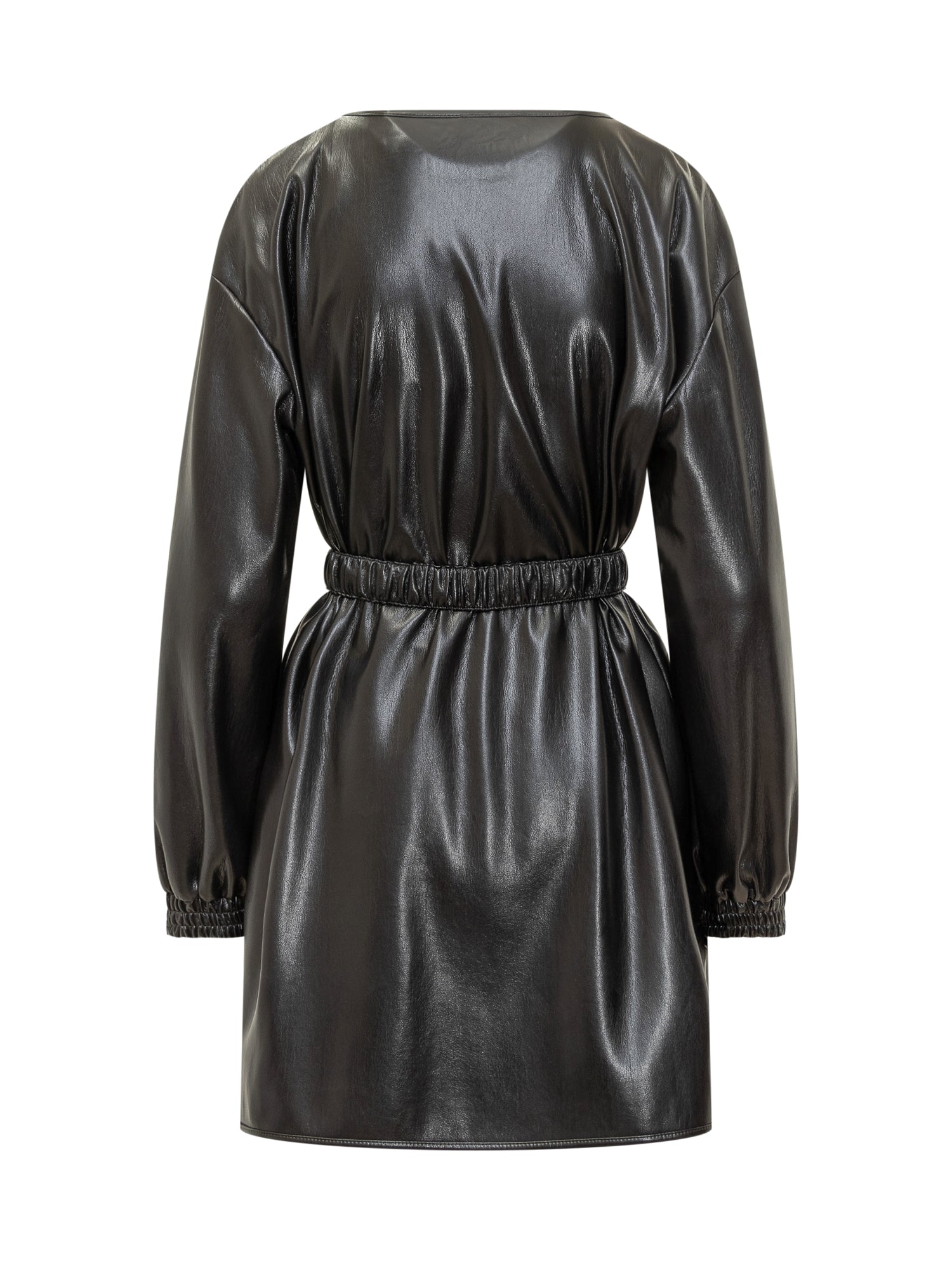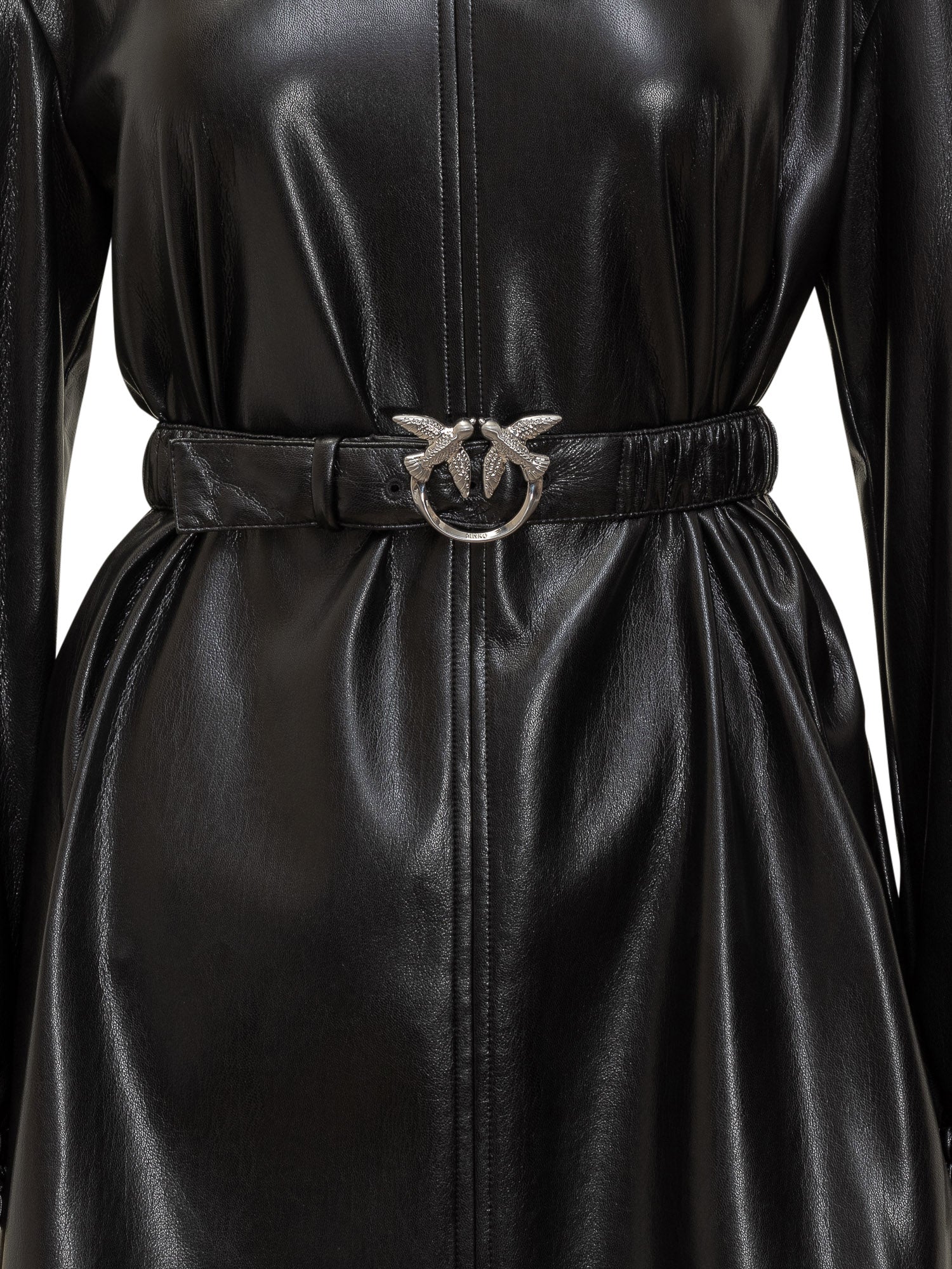 Abito corto Pinko in ecopelle nera con scollo a goccia e cintura in vita con fibbia logo gioiello.