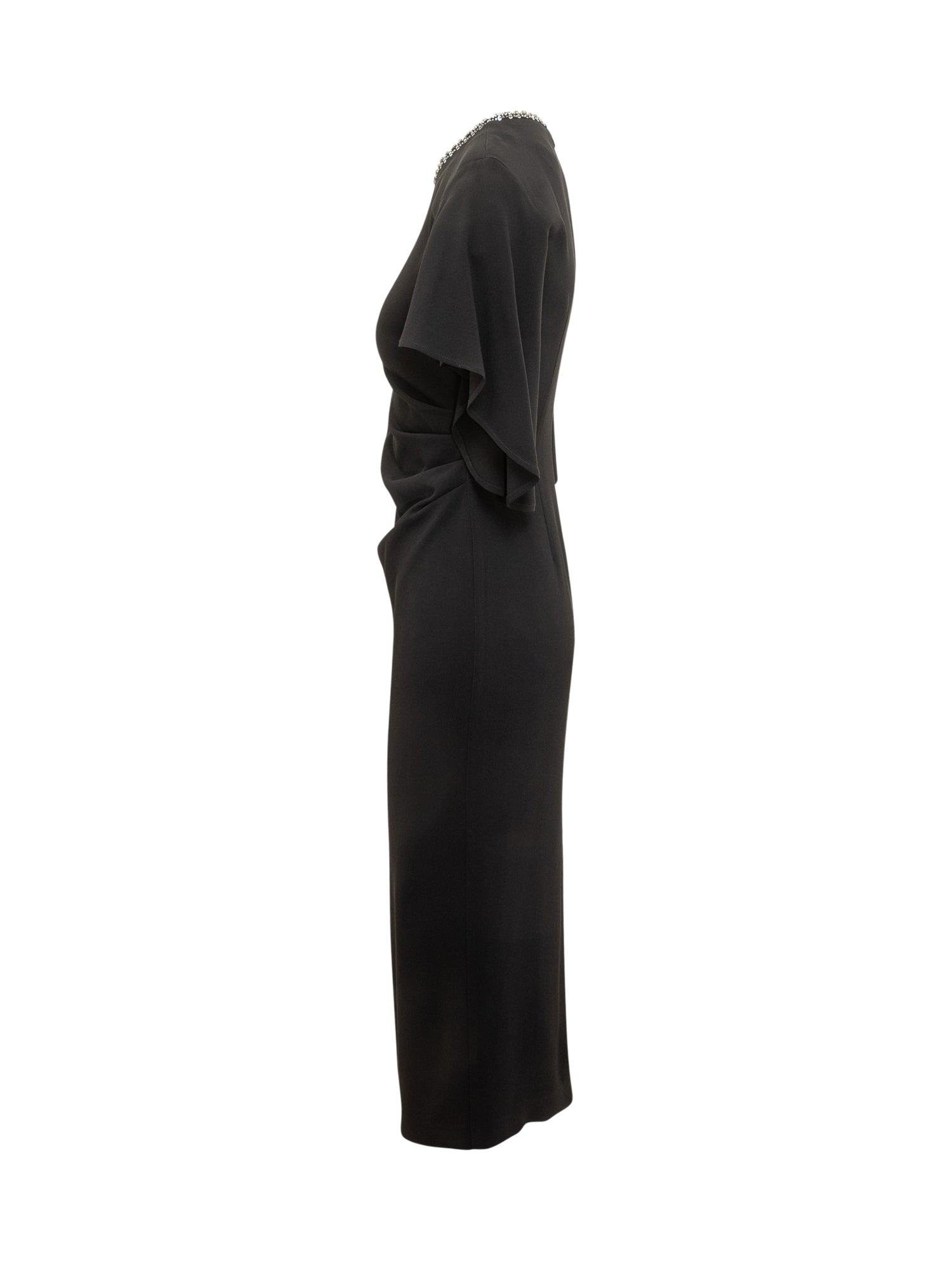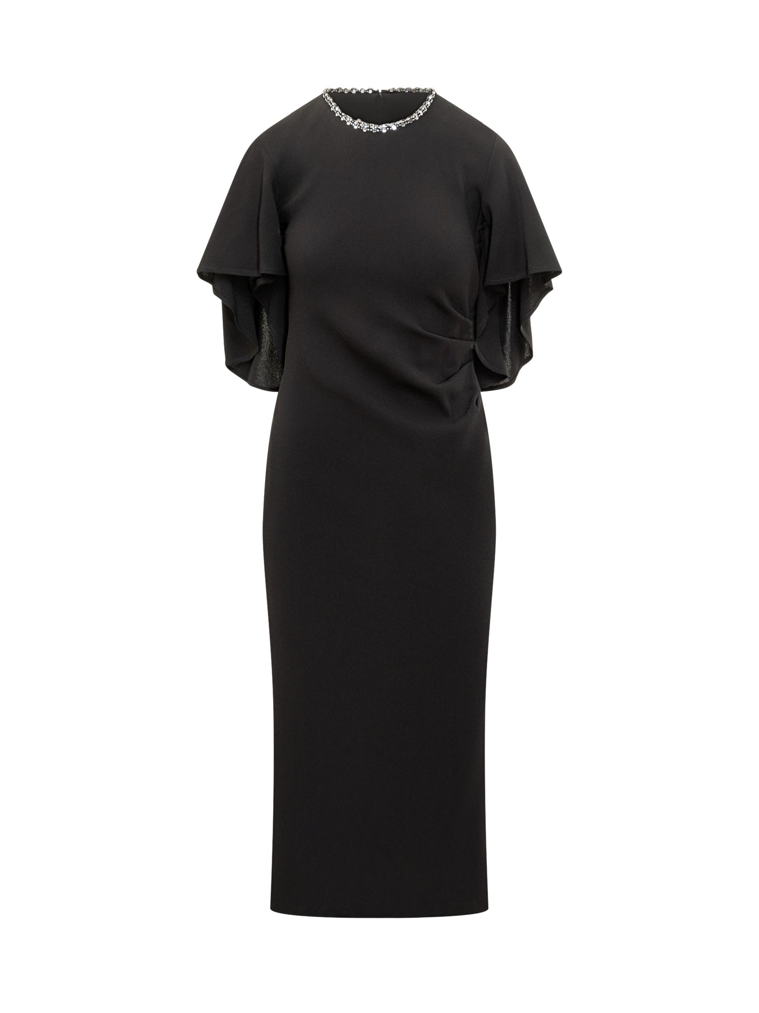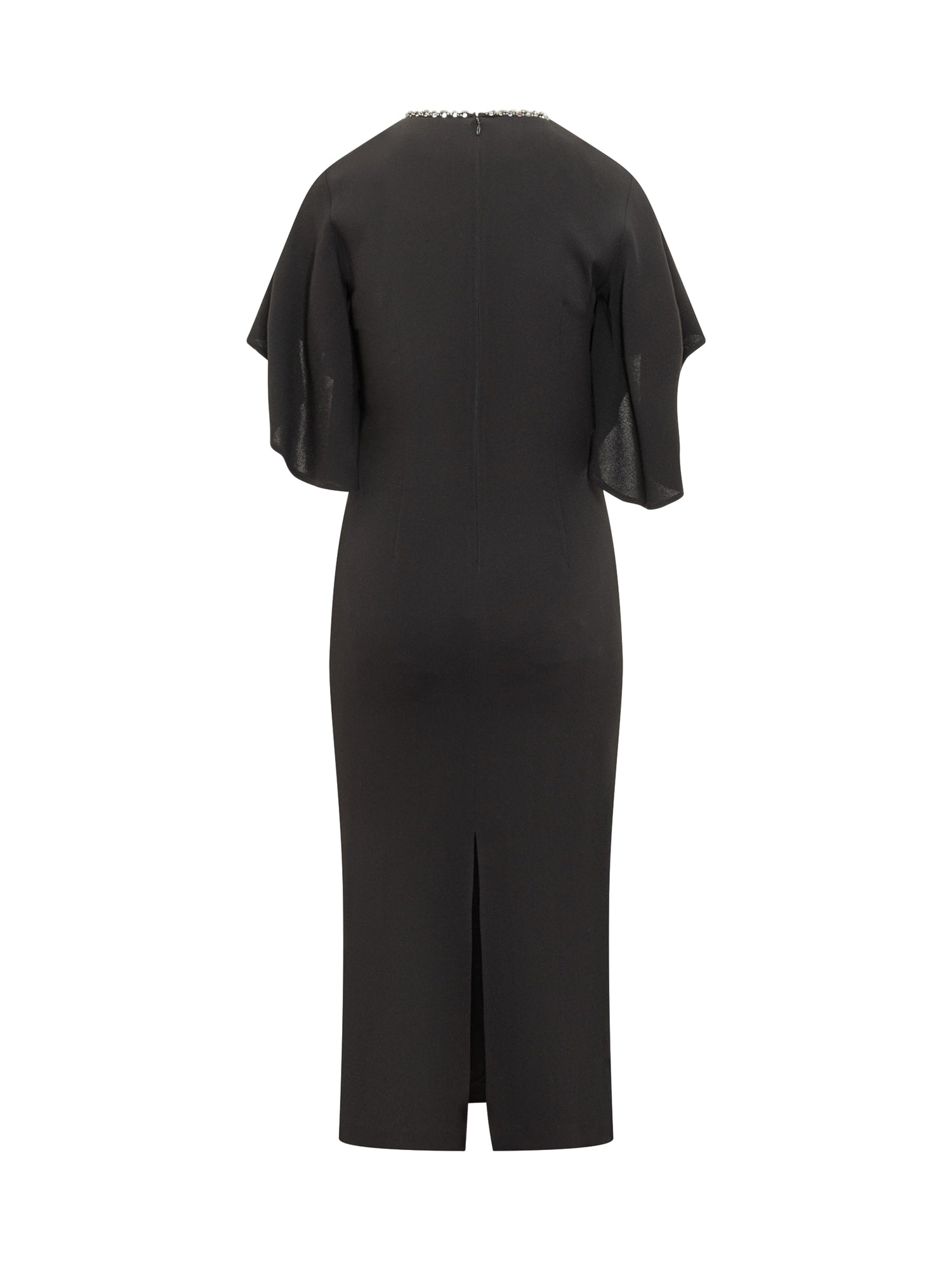 Abito midi Pinko in tessuto fluido nero con maniche a mantella e scollo impreziosito da cristalli. Silhouette aderente e chiusura posteriore con zip.