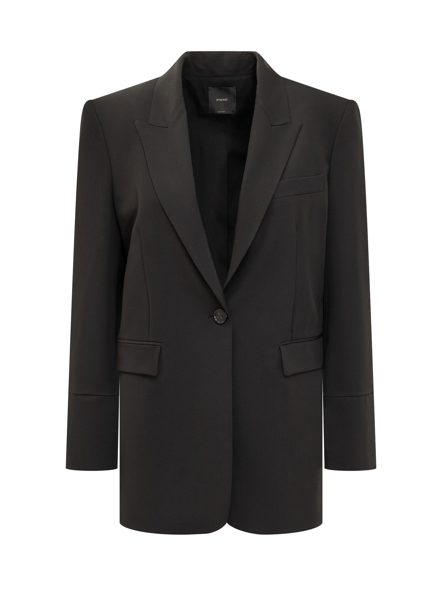 Blazer Pinko da donna in tessuto liscio, design monopetto con revers classico e chiusura a un bottone. Linea leggermente oversize per un eleganza moderna.