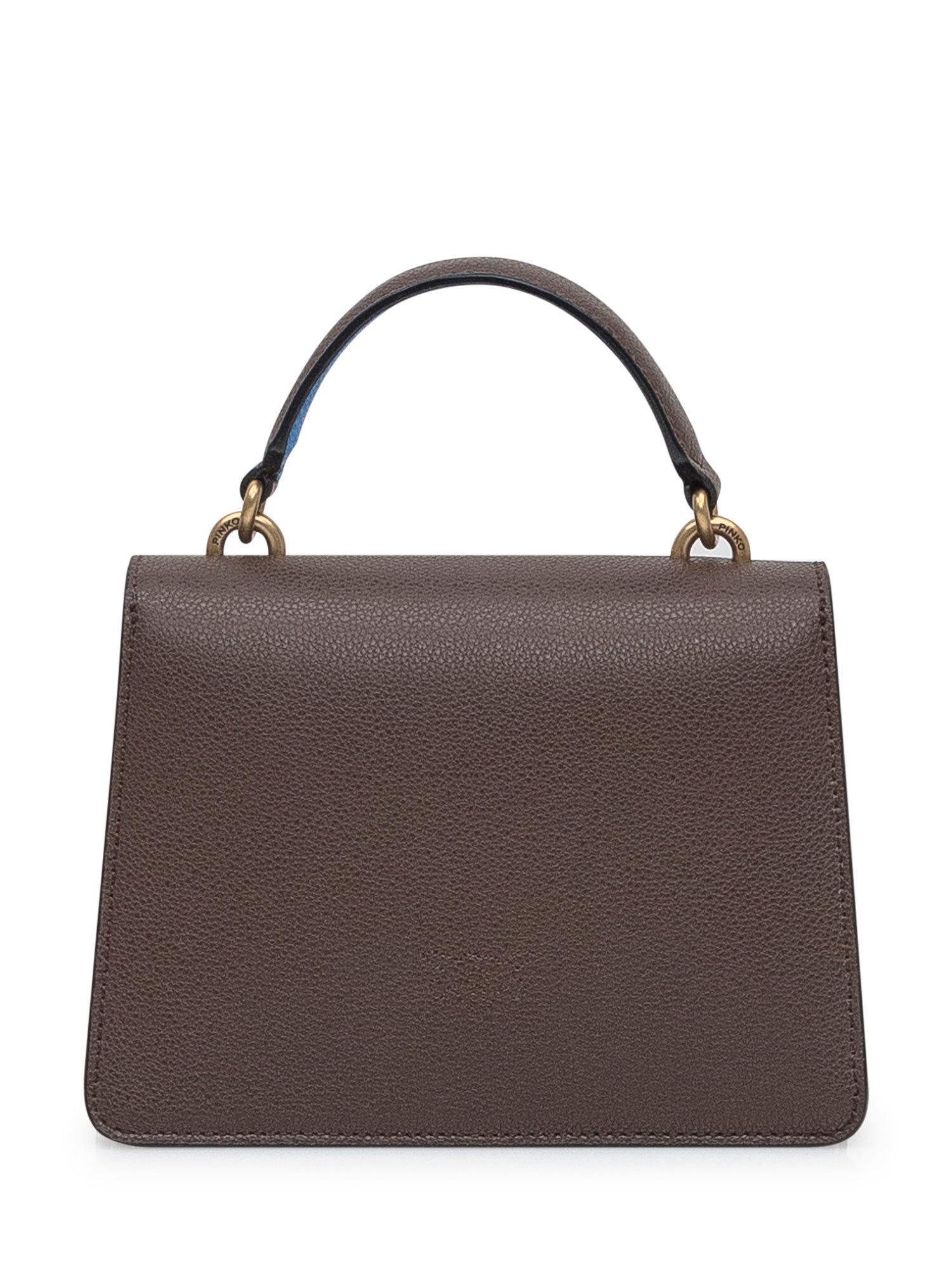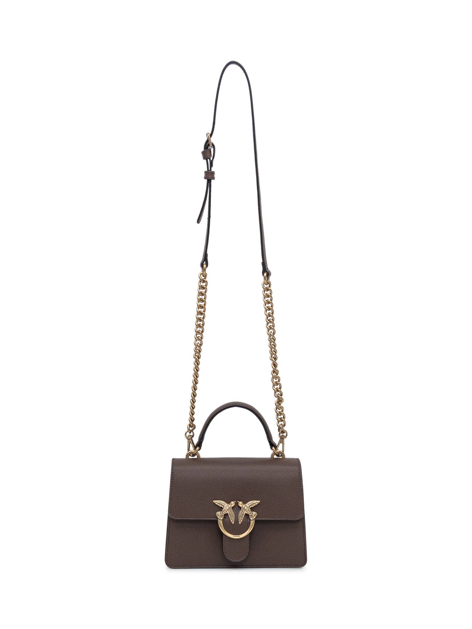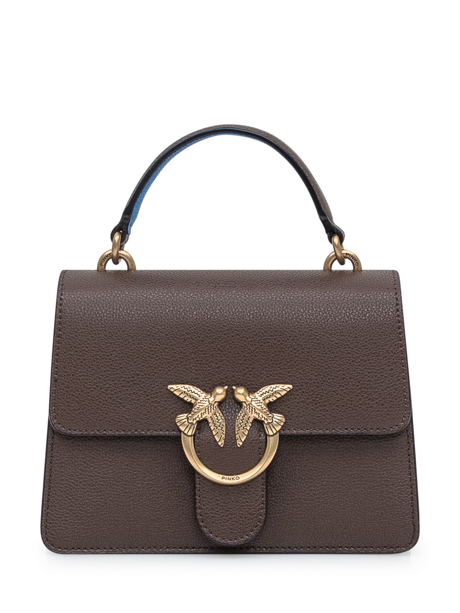 Borsa Pinko Love Mini Icon in pelle marrone con manico superiore e iconica fibbia Love Birds in metallo dorato.