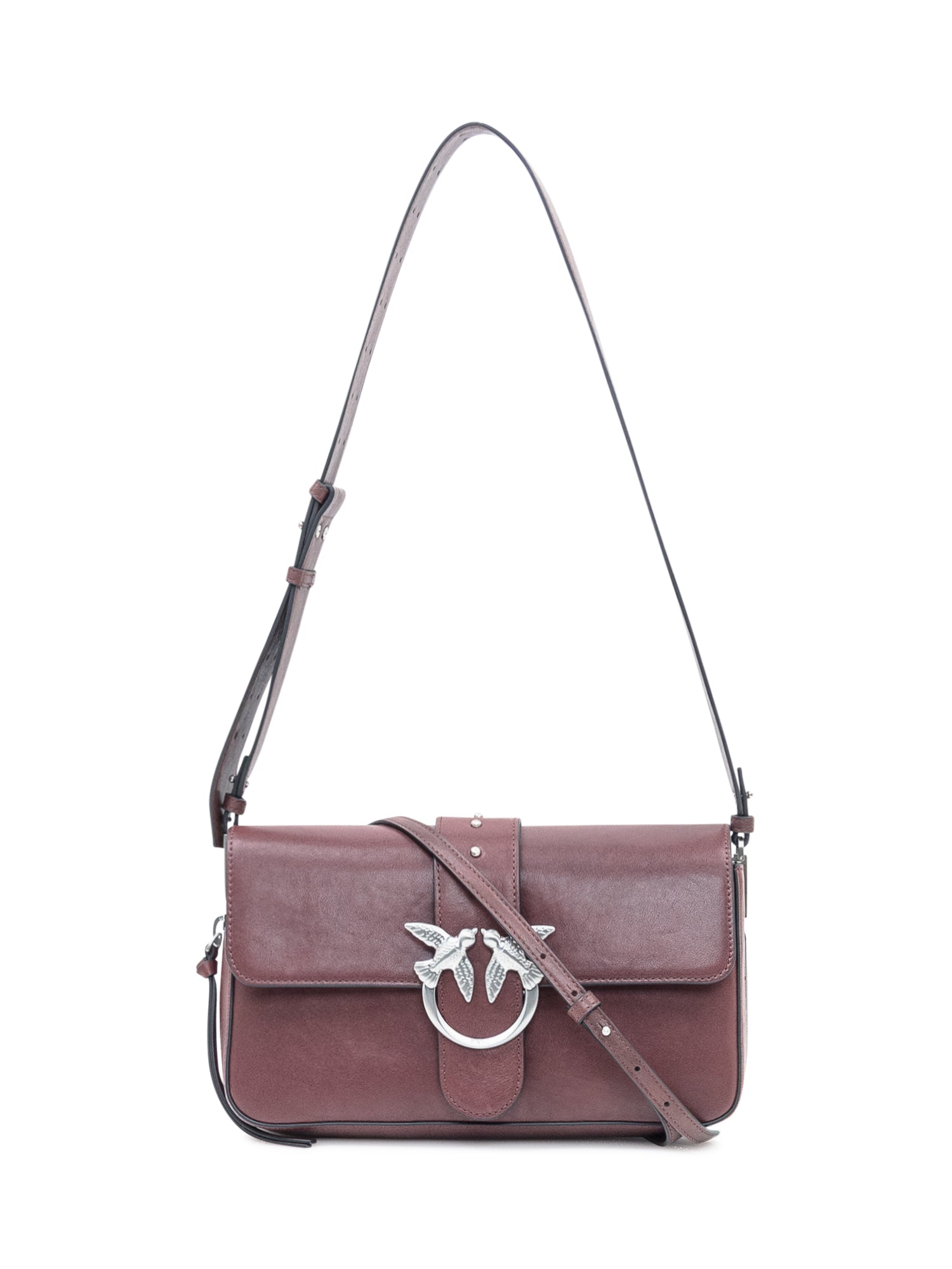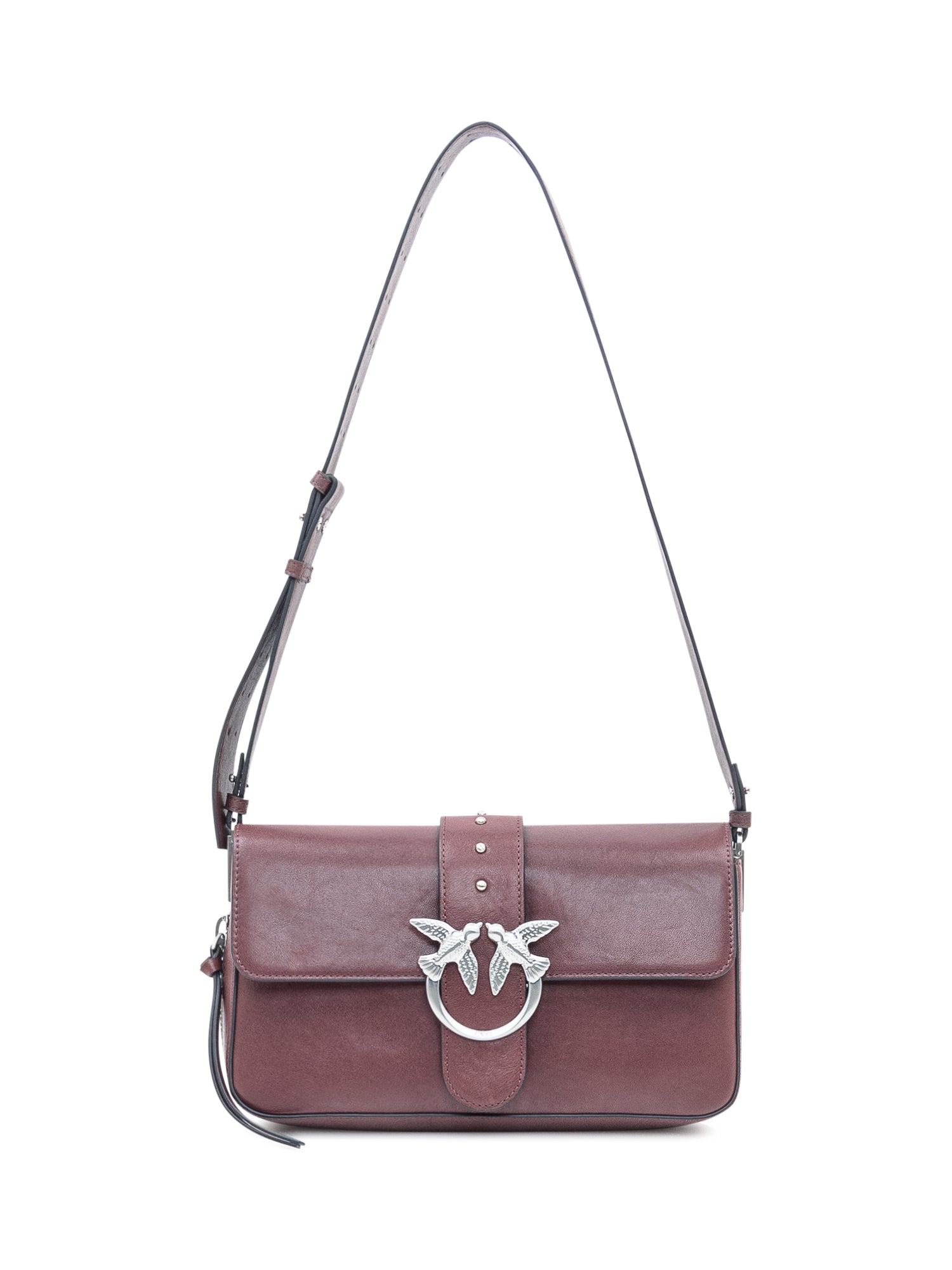 Borsa Pinko Love One Slouchy in pelle bordeaux con iconica fibbia Love Birds in metallo argentato. Tracolla regolabile e silhouette morbida per uno stile elegante e moderno.