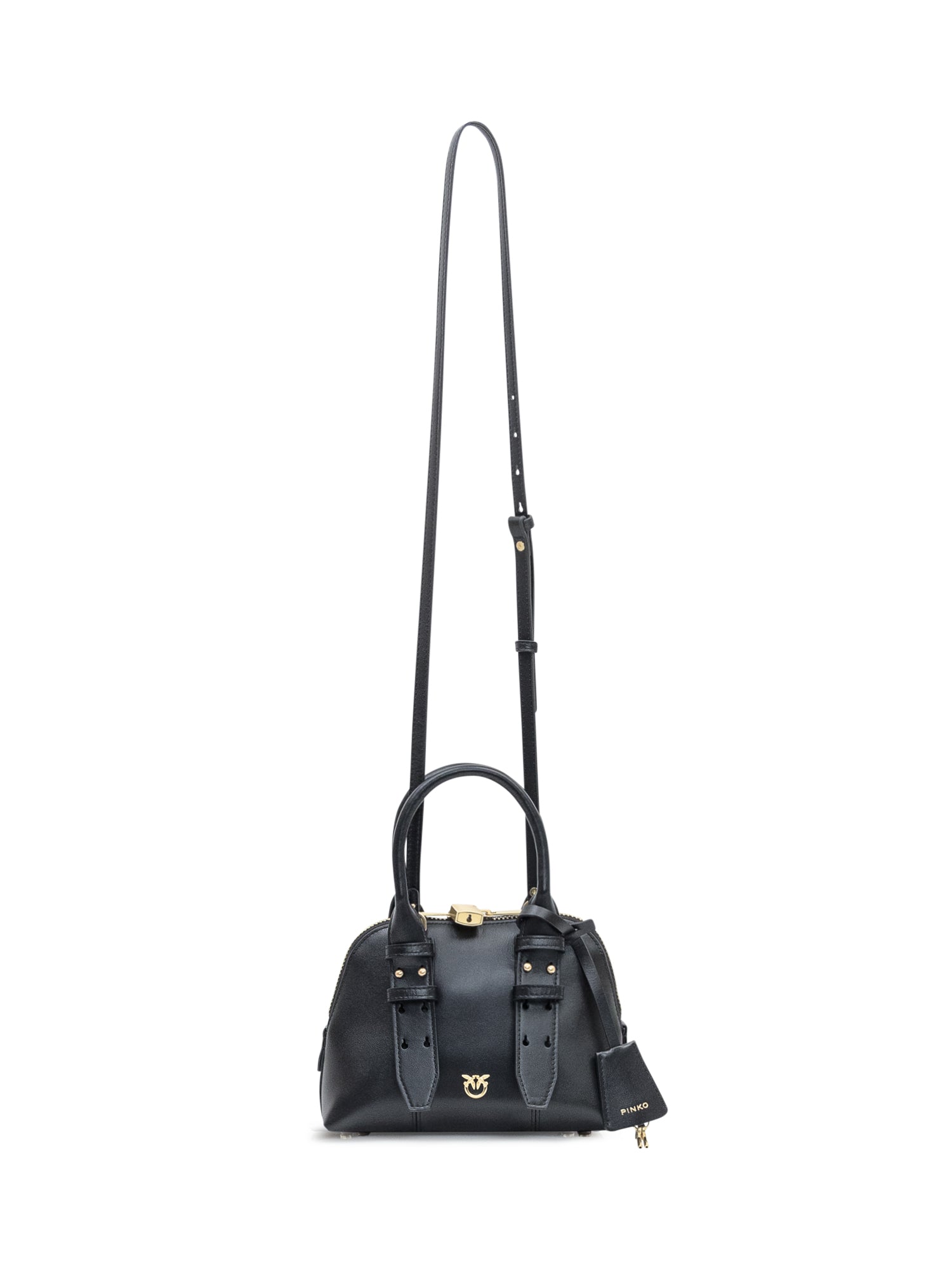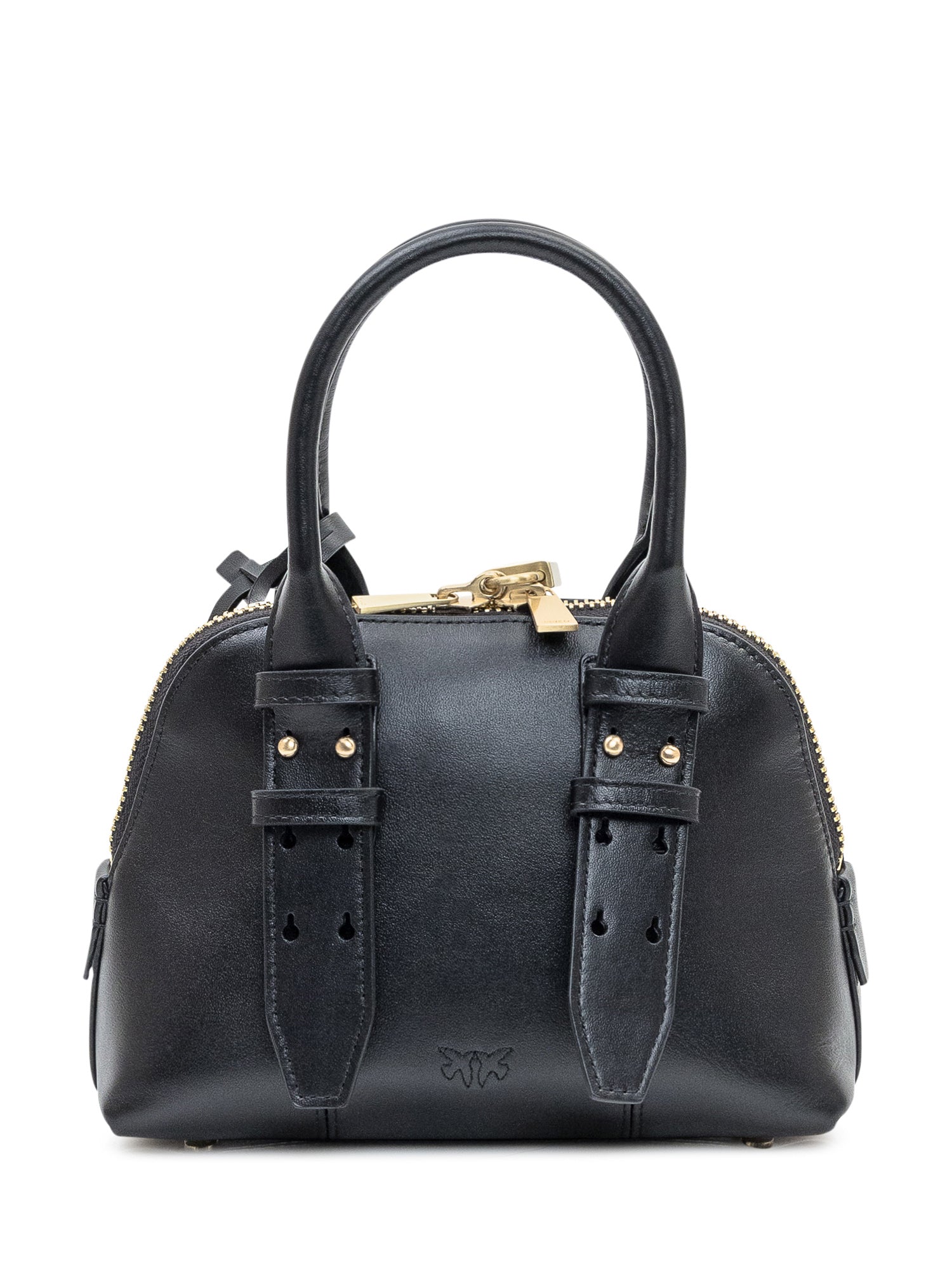 Borsa Pinko Bowling Bag Mini in pelle nera con doppio manico, dettagli in metallo dorato e logo frontale.