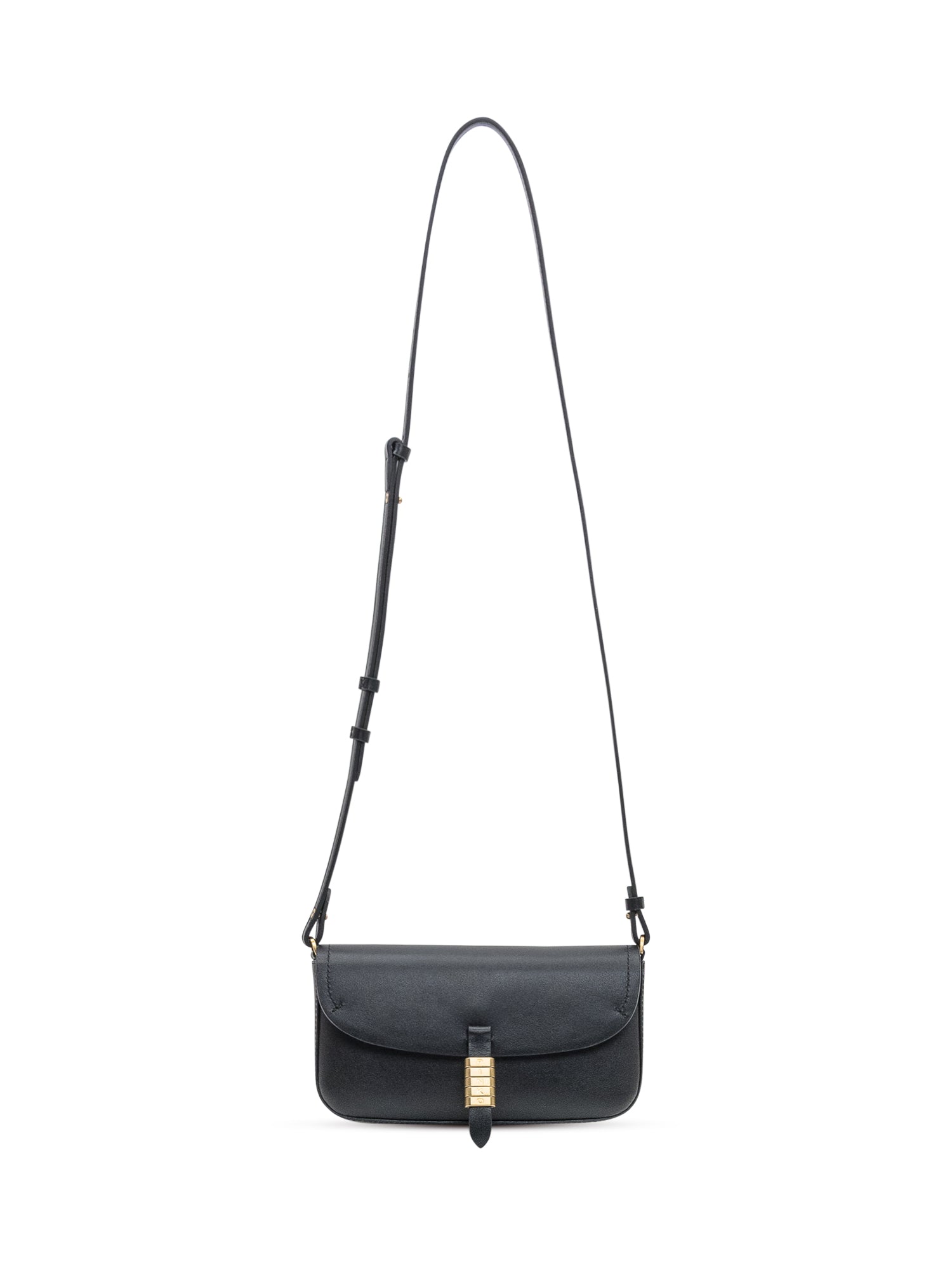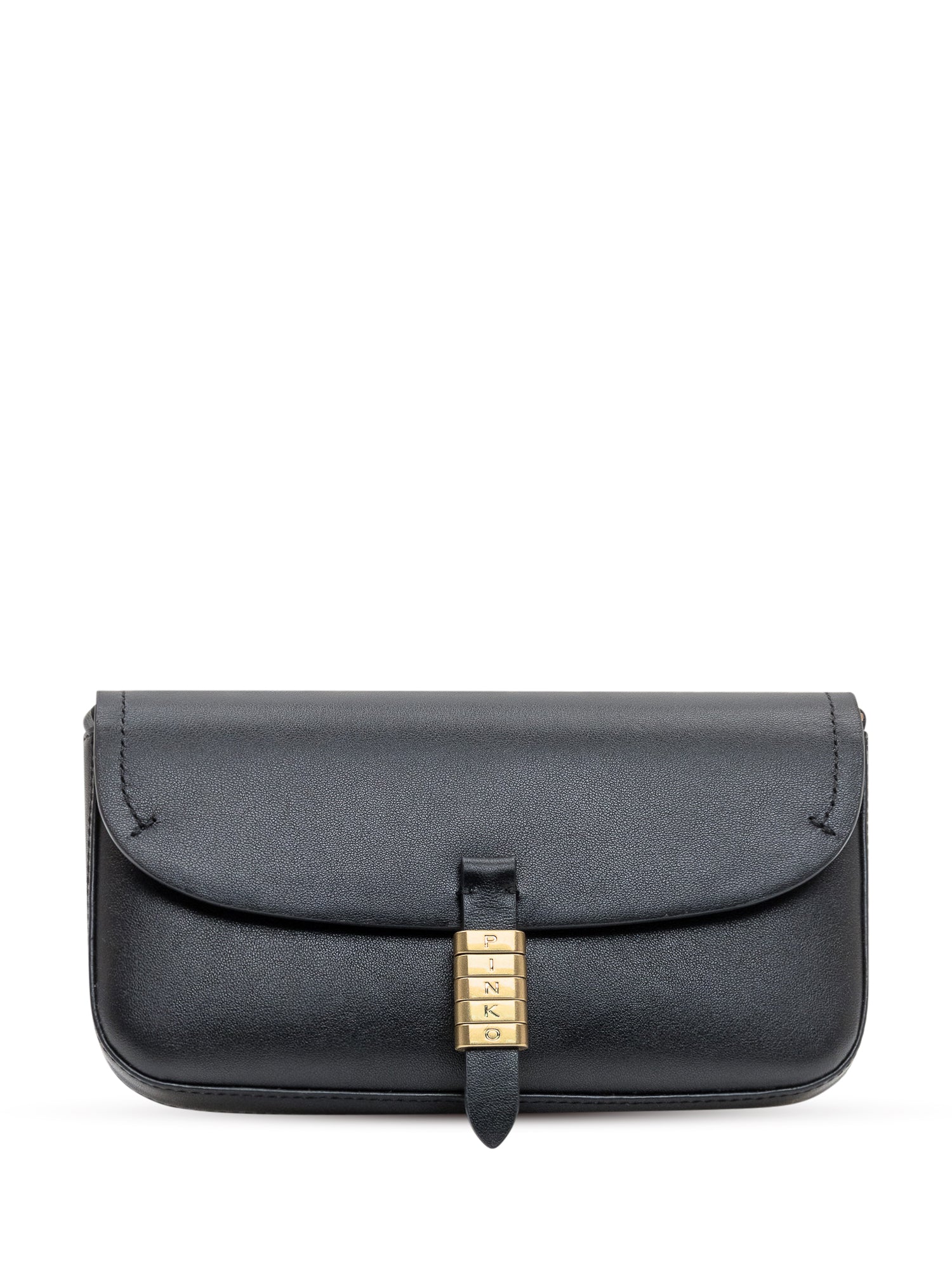 Pinko Saddle Flat in pelle nera con tracolla regolabile, chiusura con fibbia metallica dorata e logo inciso.