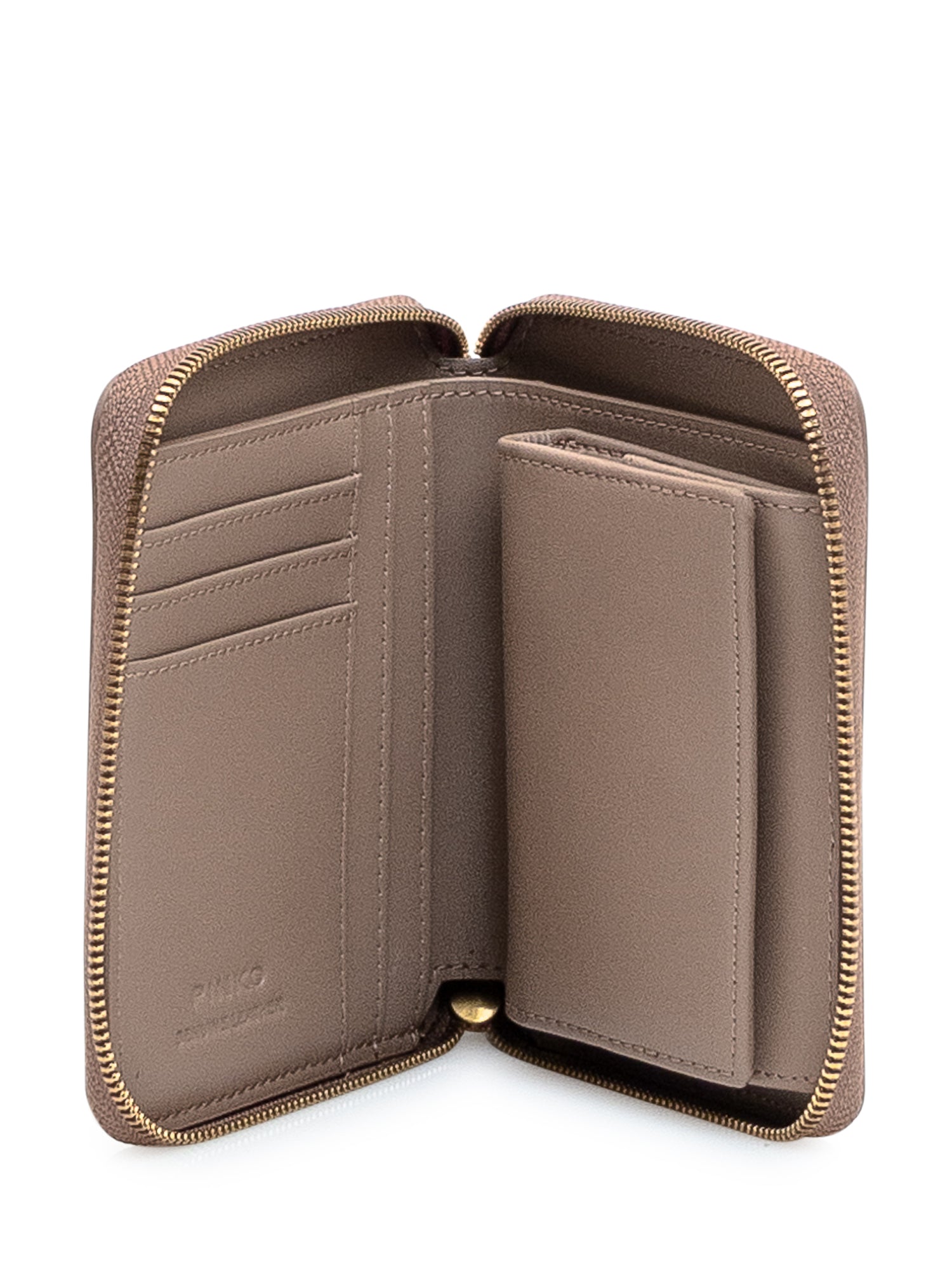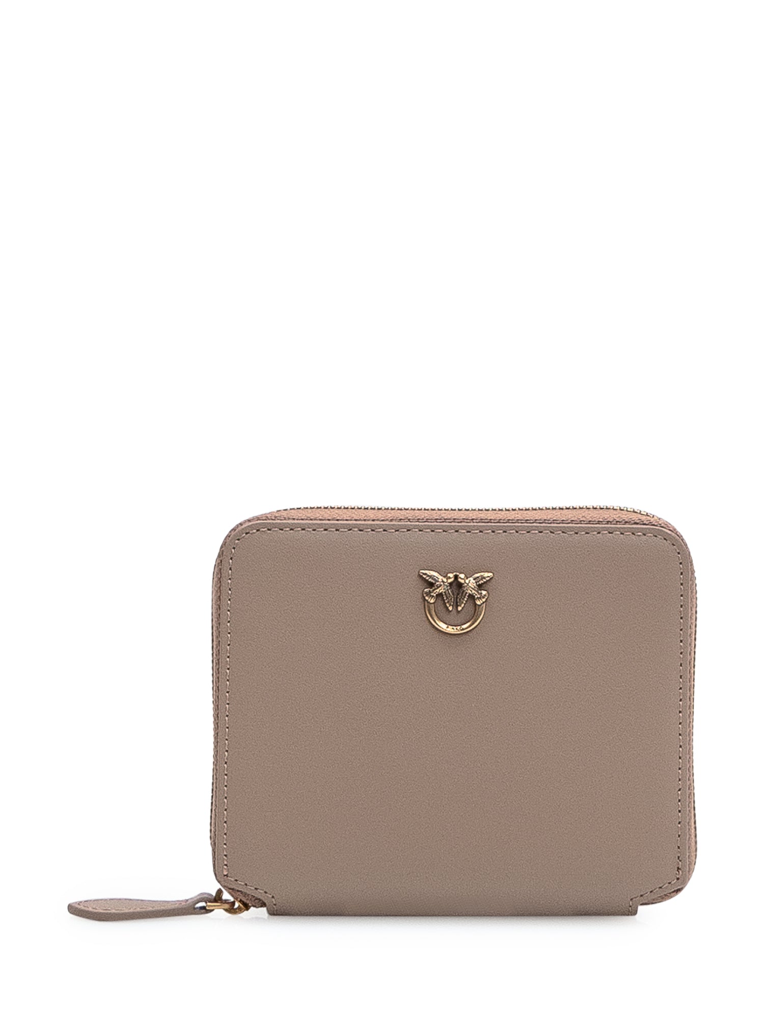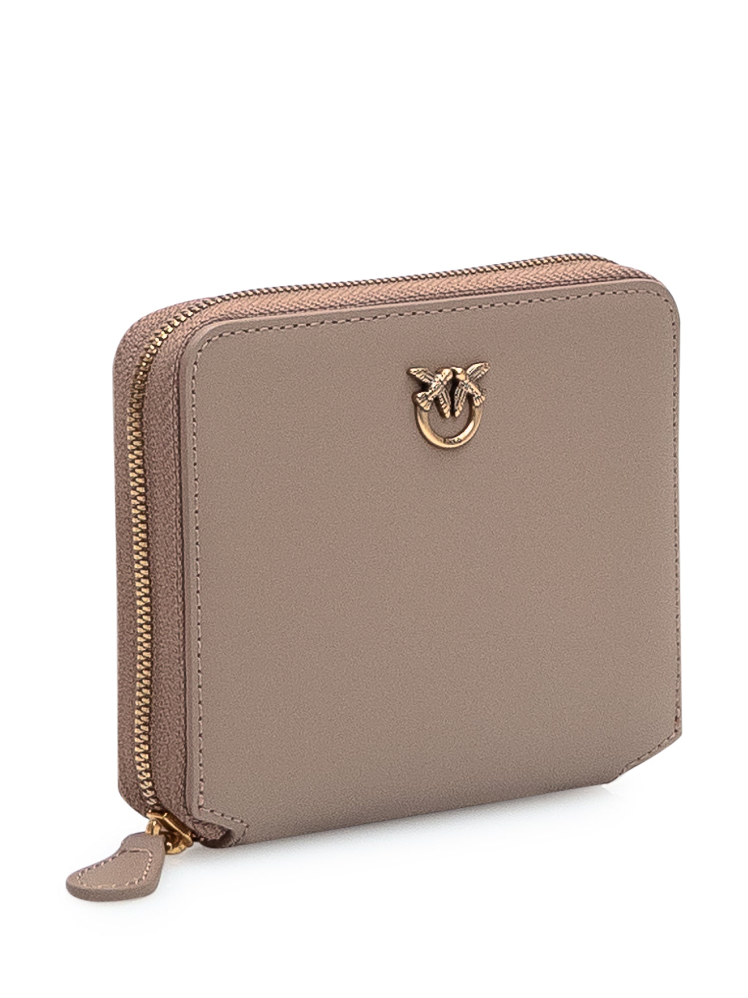 Portafoglio Pinko in pelle taupe con chiusura a zip e logo Love Birds dorato.