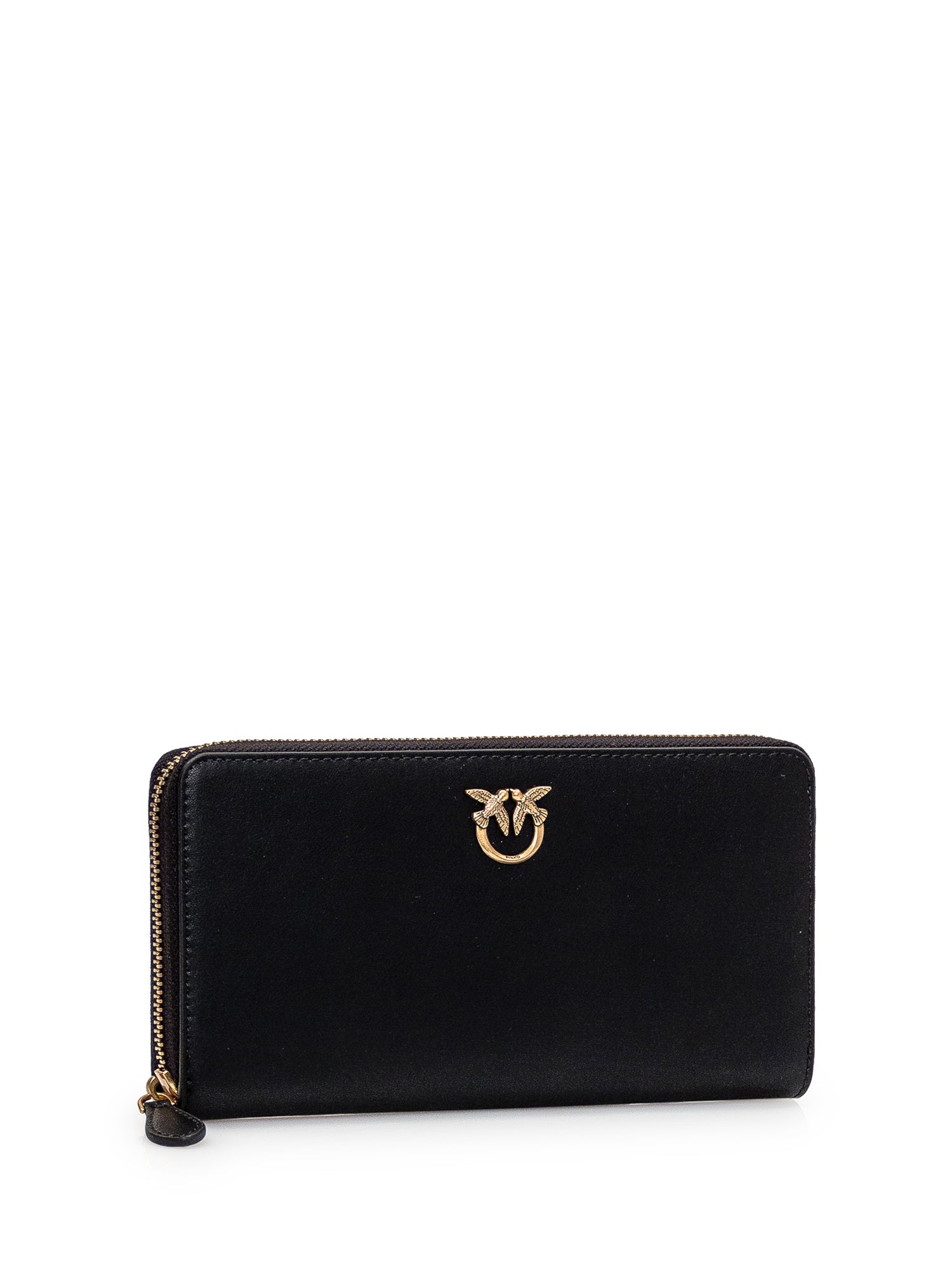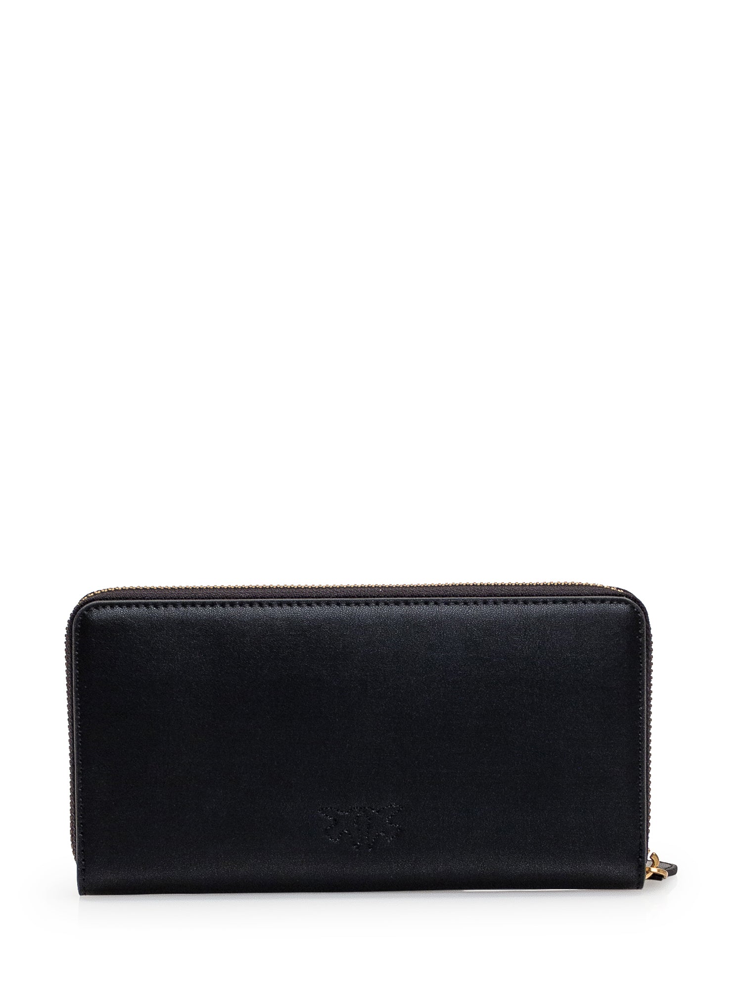 Portafoglio Pinko in pelle nera con chiusura a zip e logo Love Birds dorato.
