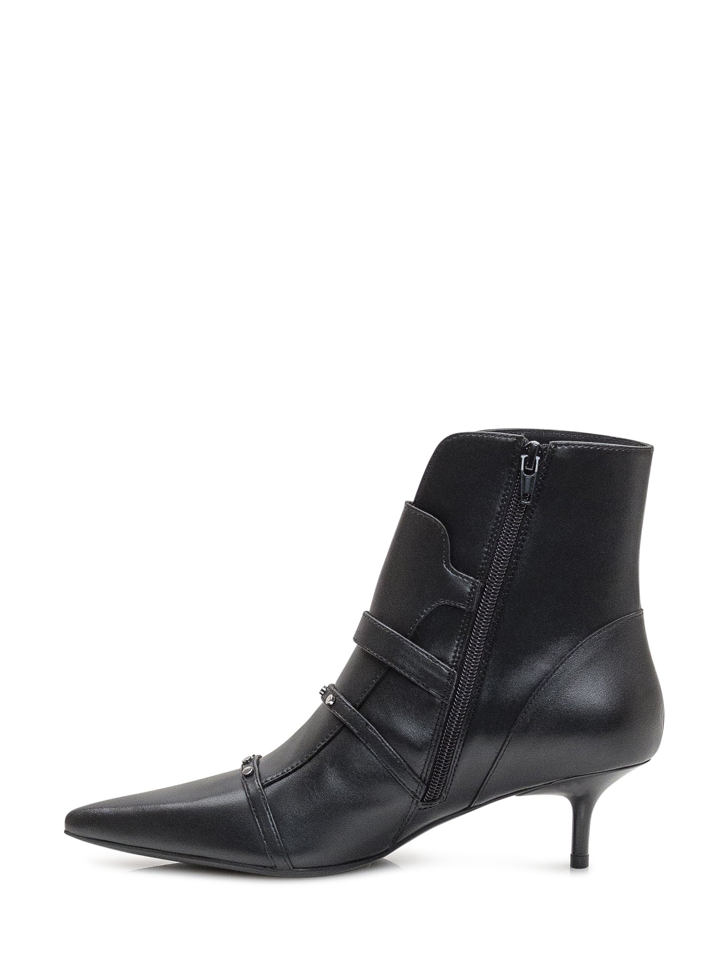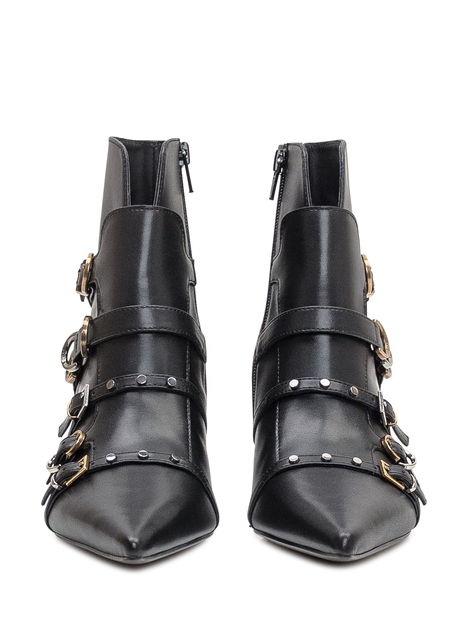 Stivaletti modello Gloria di Pinko in pelle nera con punta affusolata, tacco sottile e dettagli con cinturini multipli e fibbie metalliche.