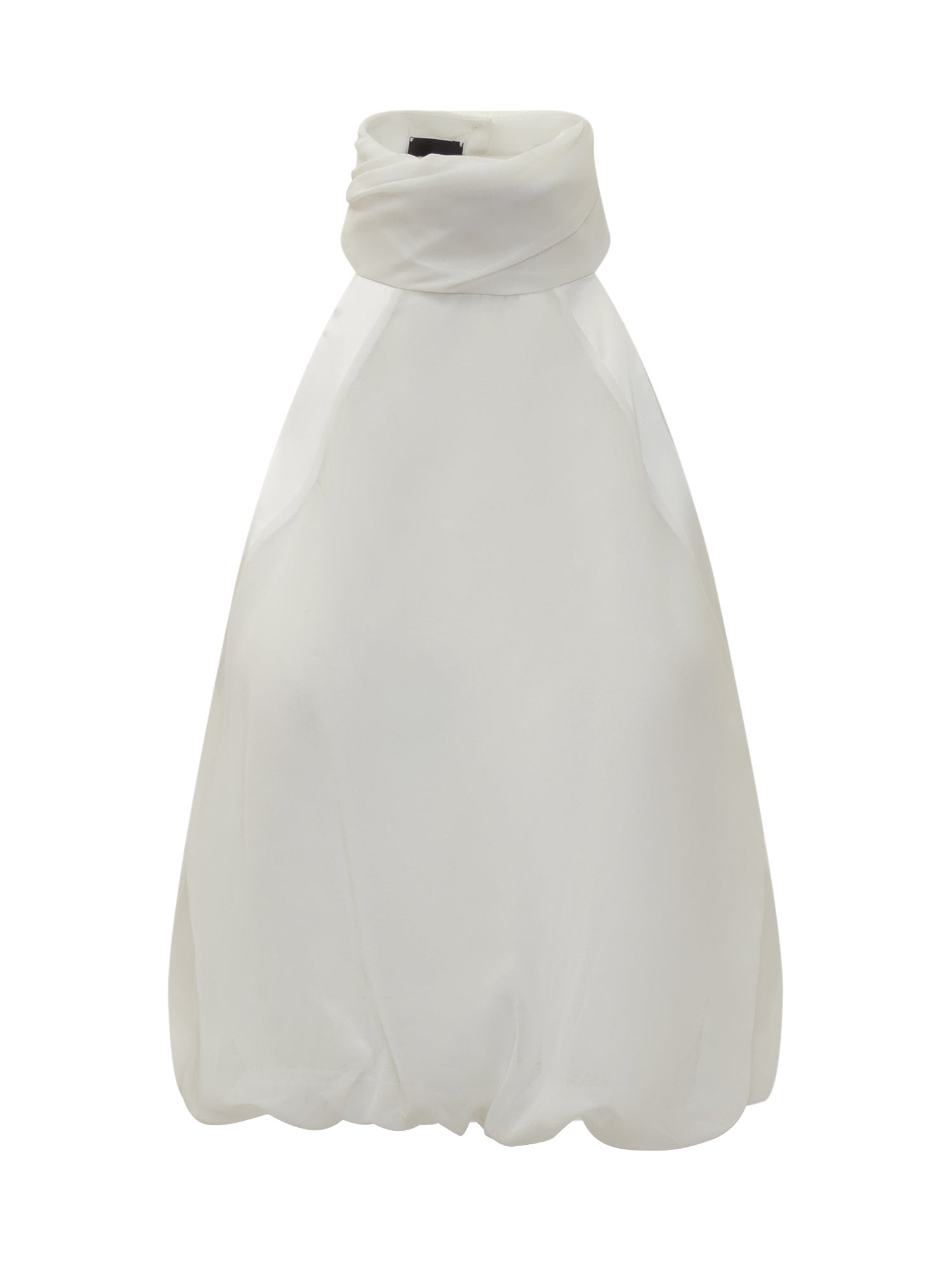 Top Pinko Florentina in organza bianca con collo alto e schiena aperta. Linea morbida con fondo arricciato per un look sofisticato e leggero.
