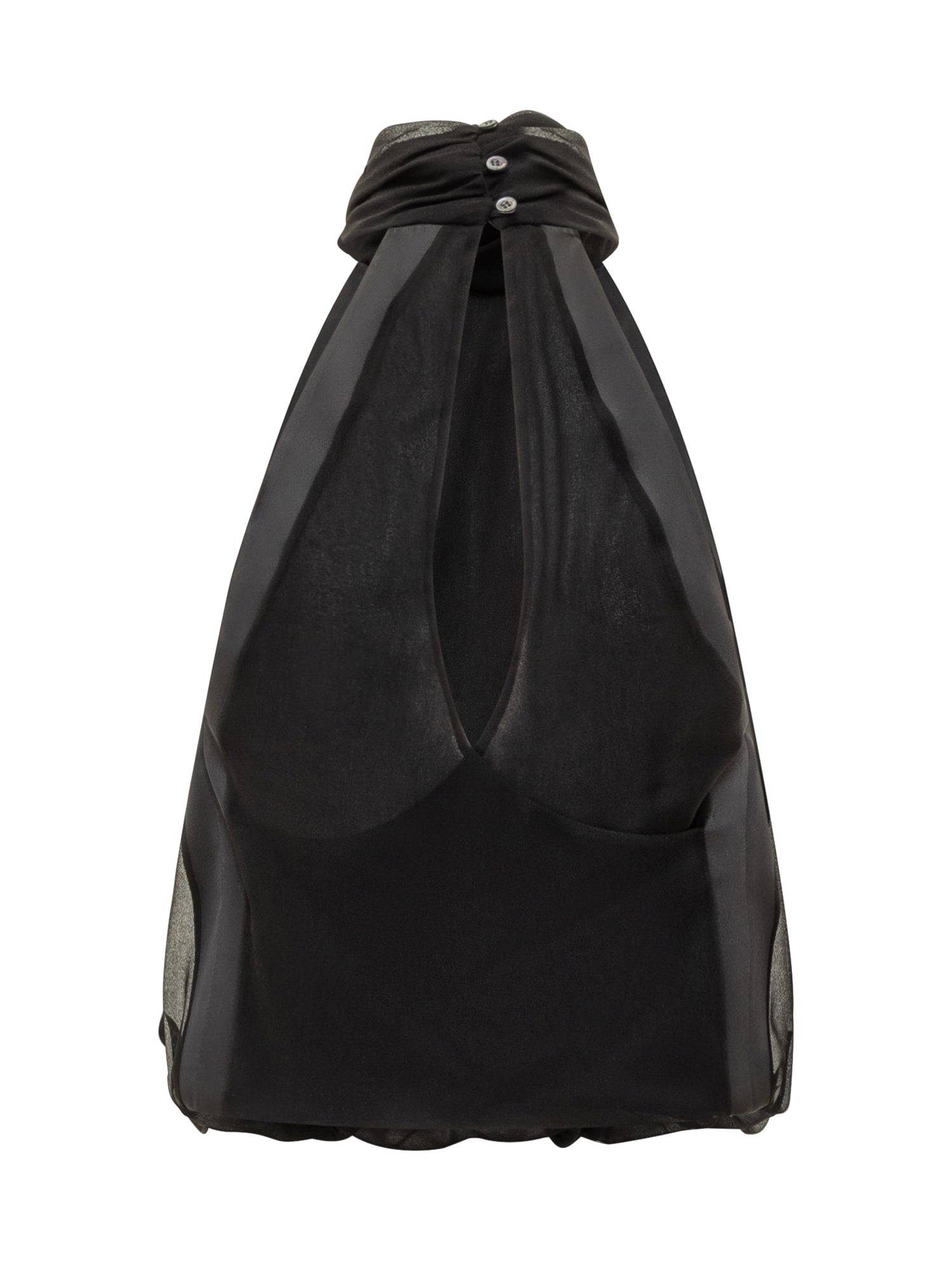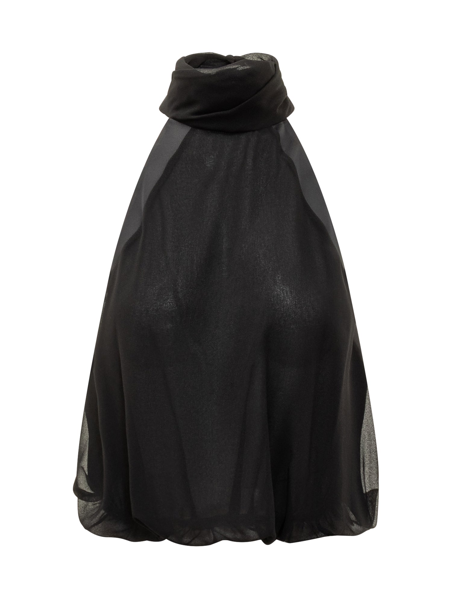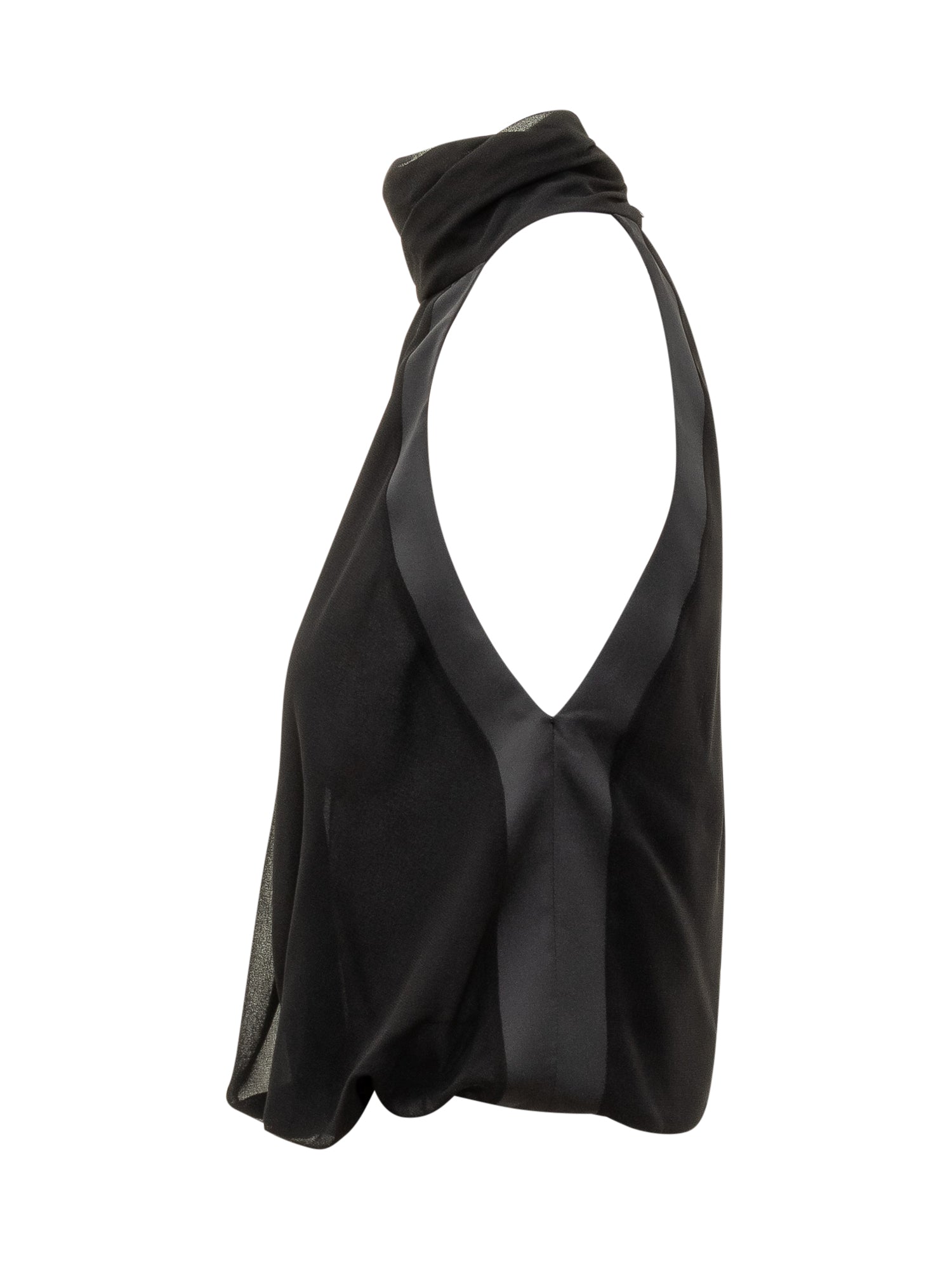 Top Pinko Florentina in organza nero con collo alto e schiena aperta. Linea morbida con fondo arricciato per un look sofisticato e leggero.