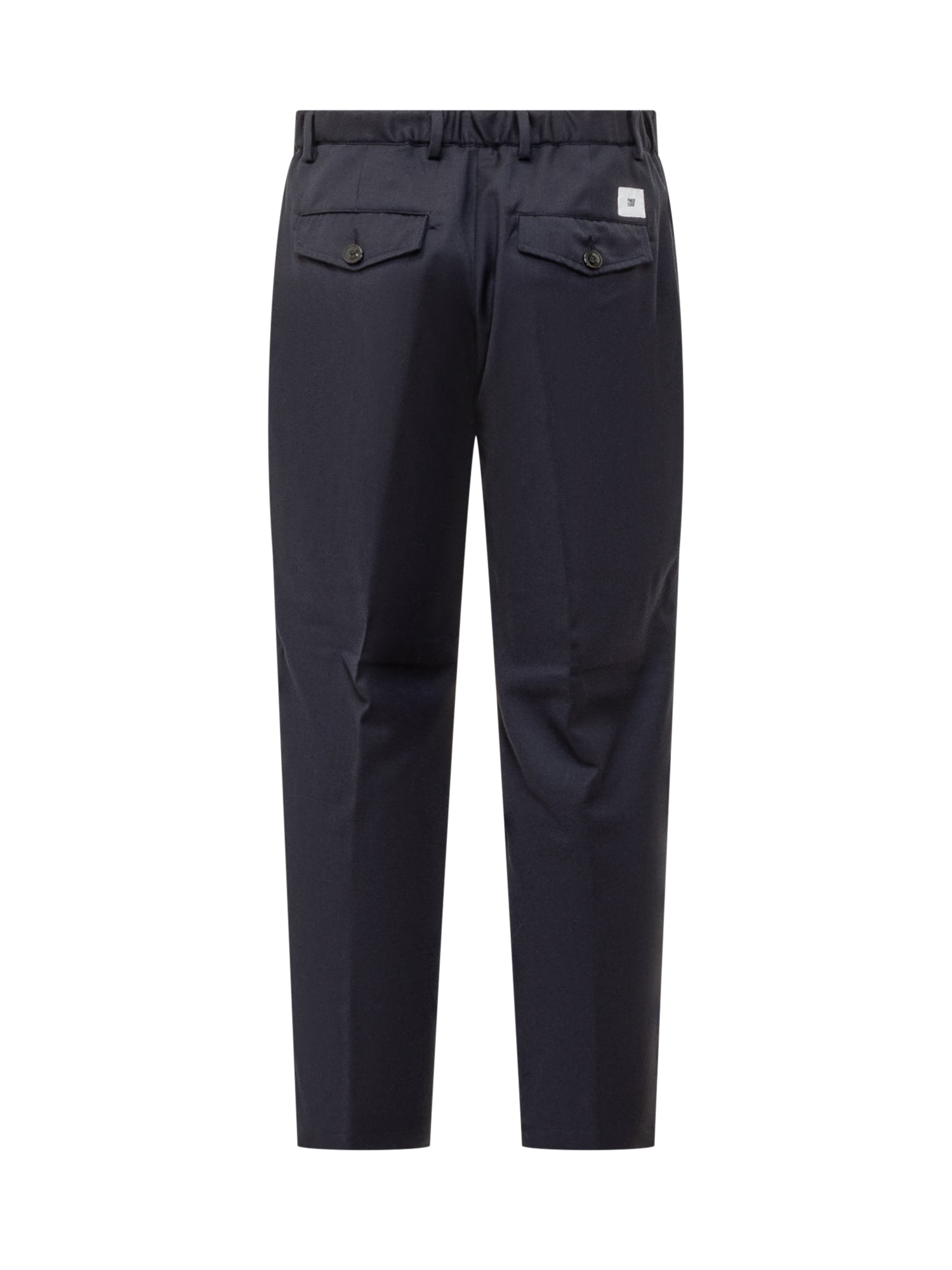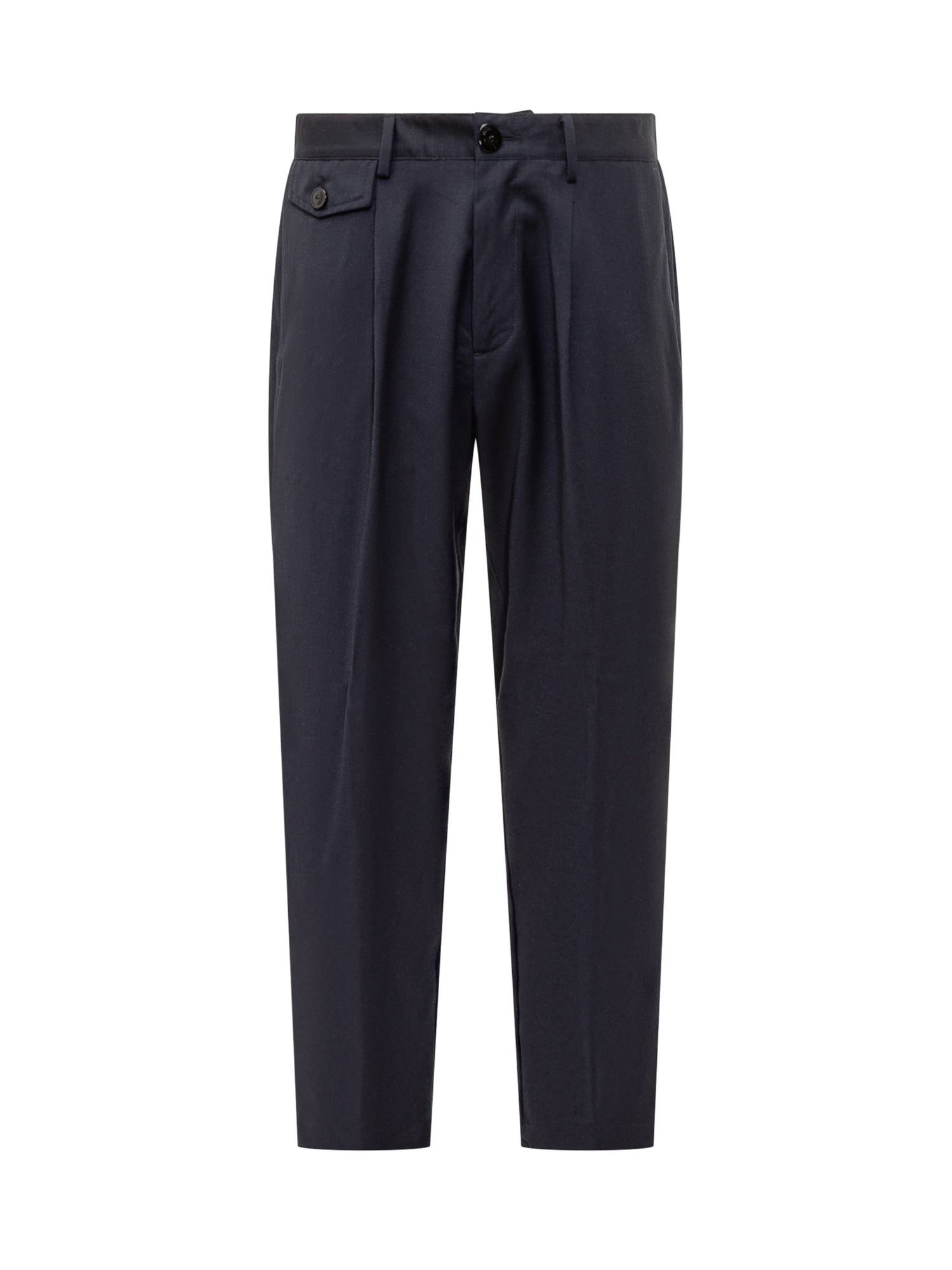 Pantaloni PMDS in cotone blu con pinces frontali, taschino con patta e chiusura con zip e bottone.