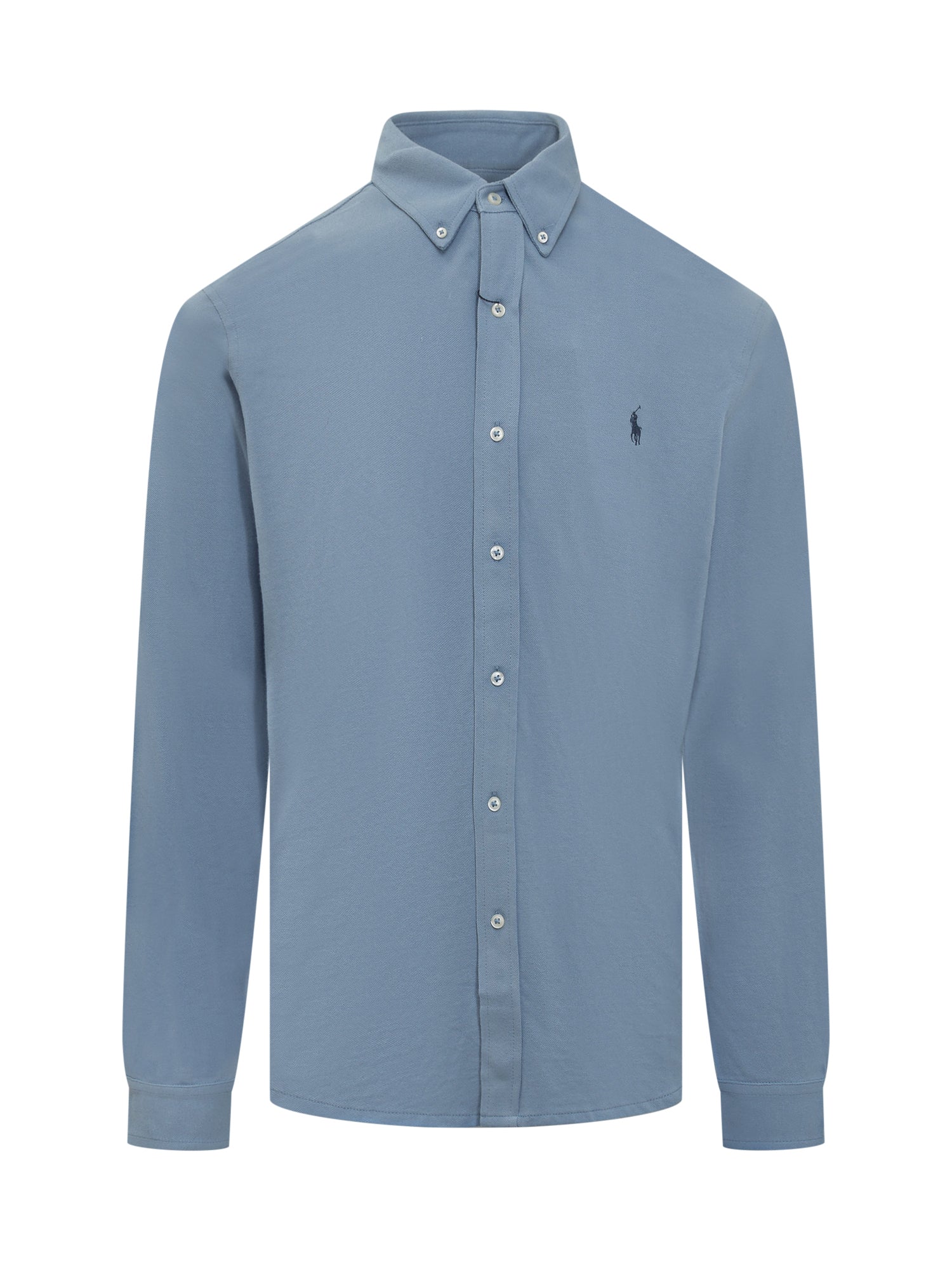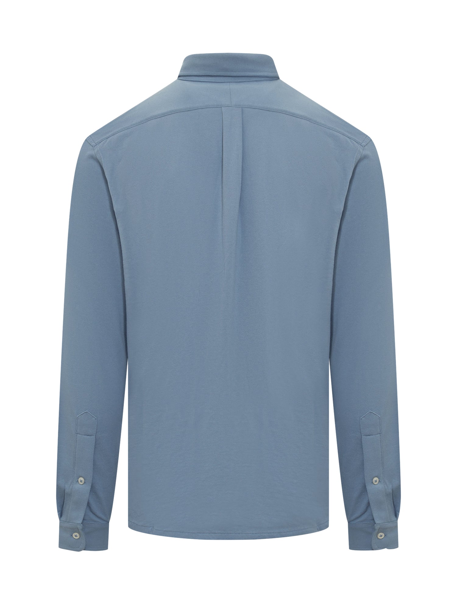 Camicia blu a maniche lunghe. Chiusura frontale con bottoni. Colletto classico. Logo ricamato sul petto.