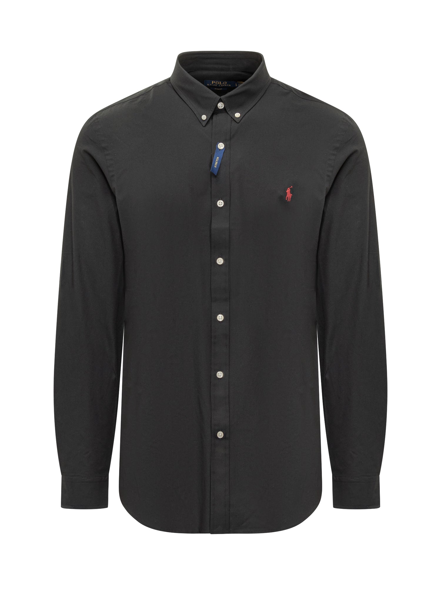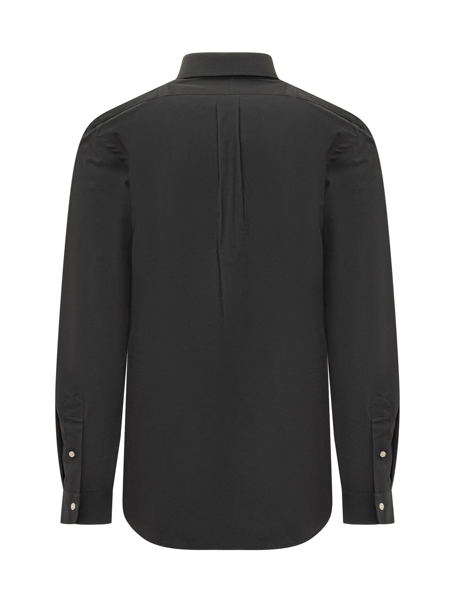 Camicia da uomo in cotone nero con colletto button-down e logo ricamato rosso sul petto.