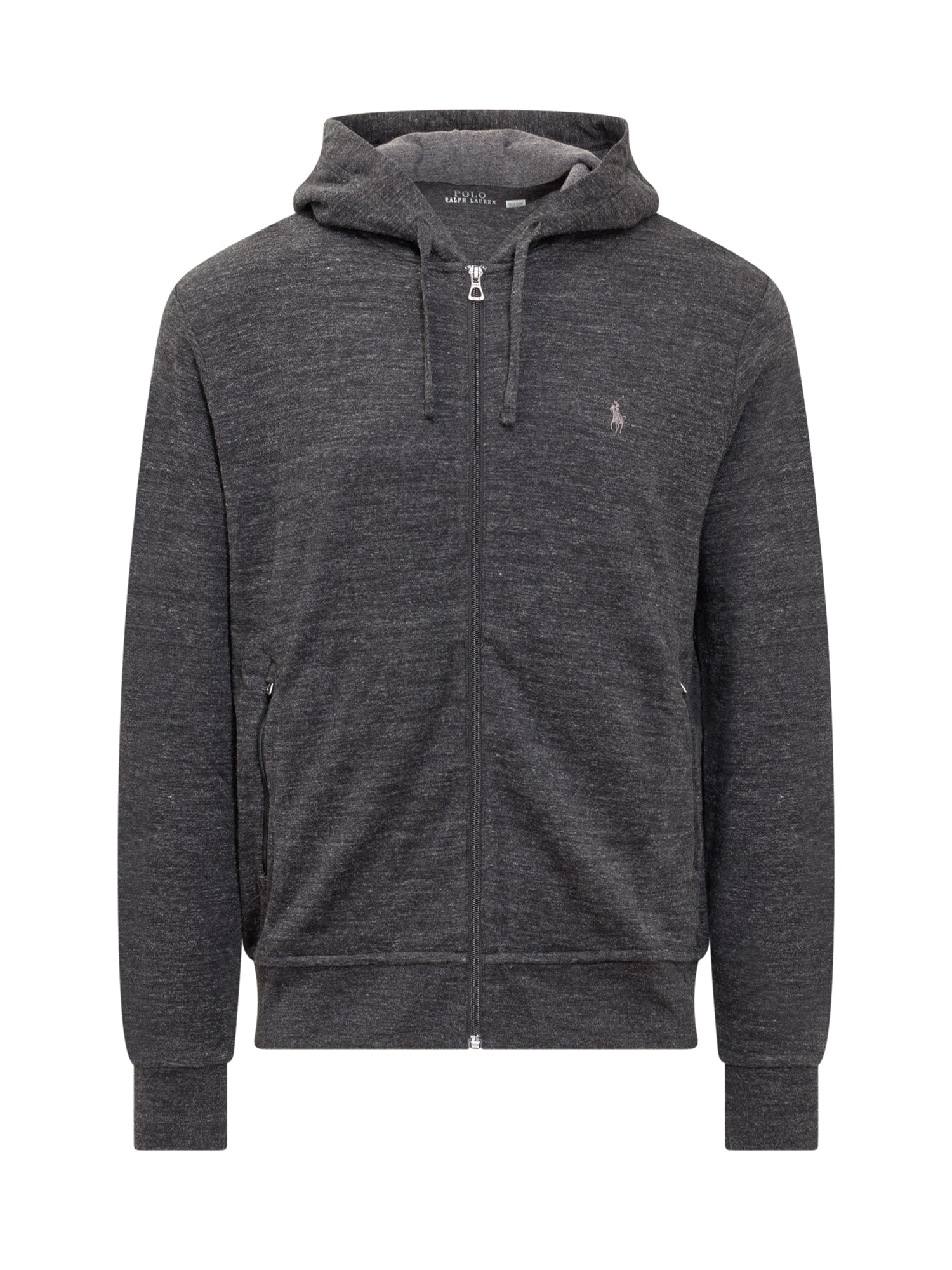 Felpa a maniche lunghe. Cappuccio con coulisse. Chiusura frontale con zip. Logo ricamato sul petto. Tasche laterali. Polsi e fondo a costine.