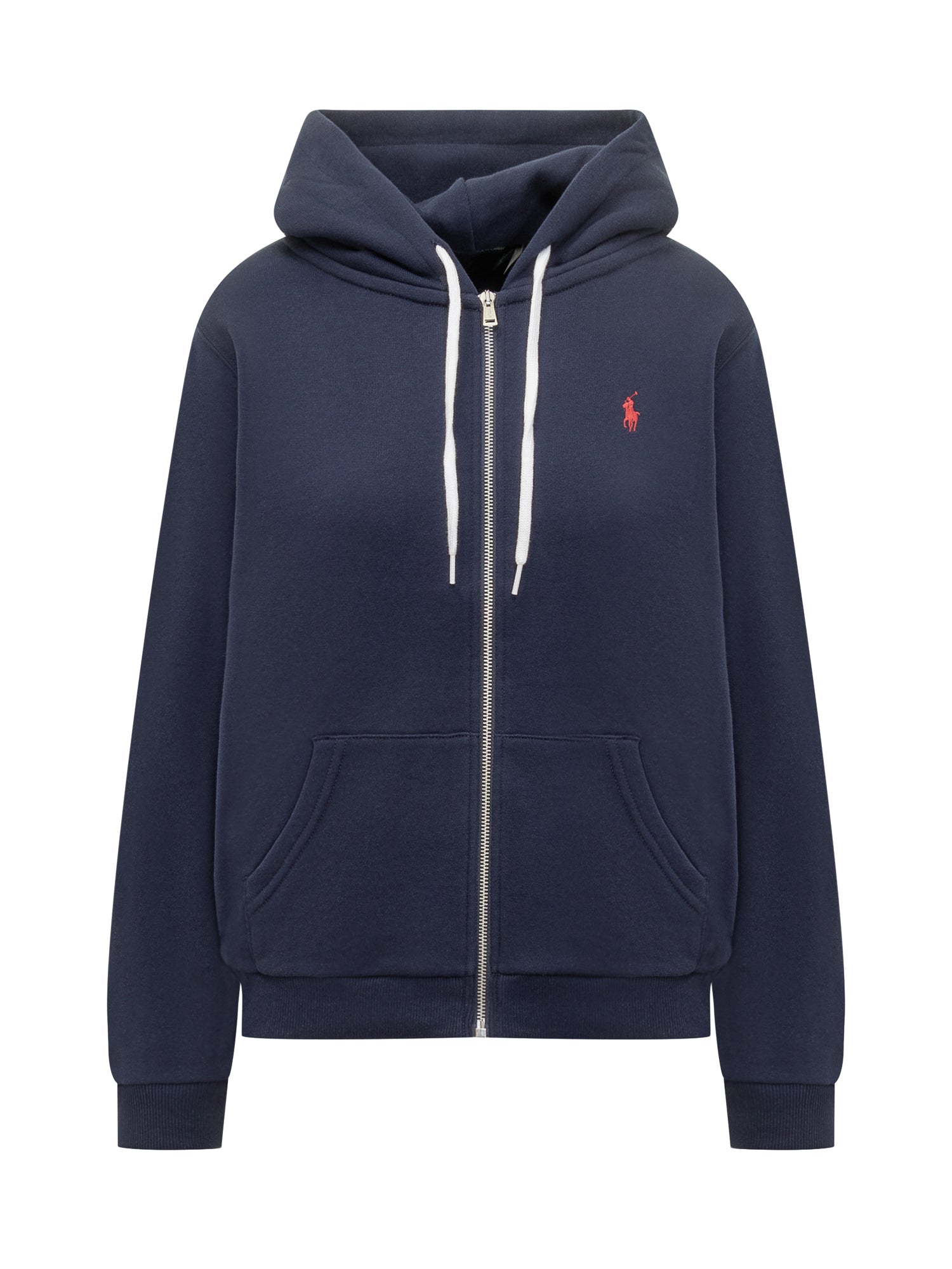 Felpa Polo Ralph Lauren in cotone blu navy con chiusura a zip, cappuccio regolabile e tasche frontali. Iconico logo ricamato a contrasto sul petto per un look casual e senza tempo.