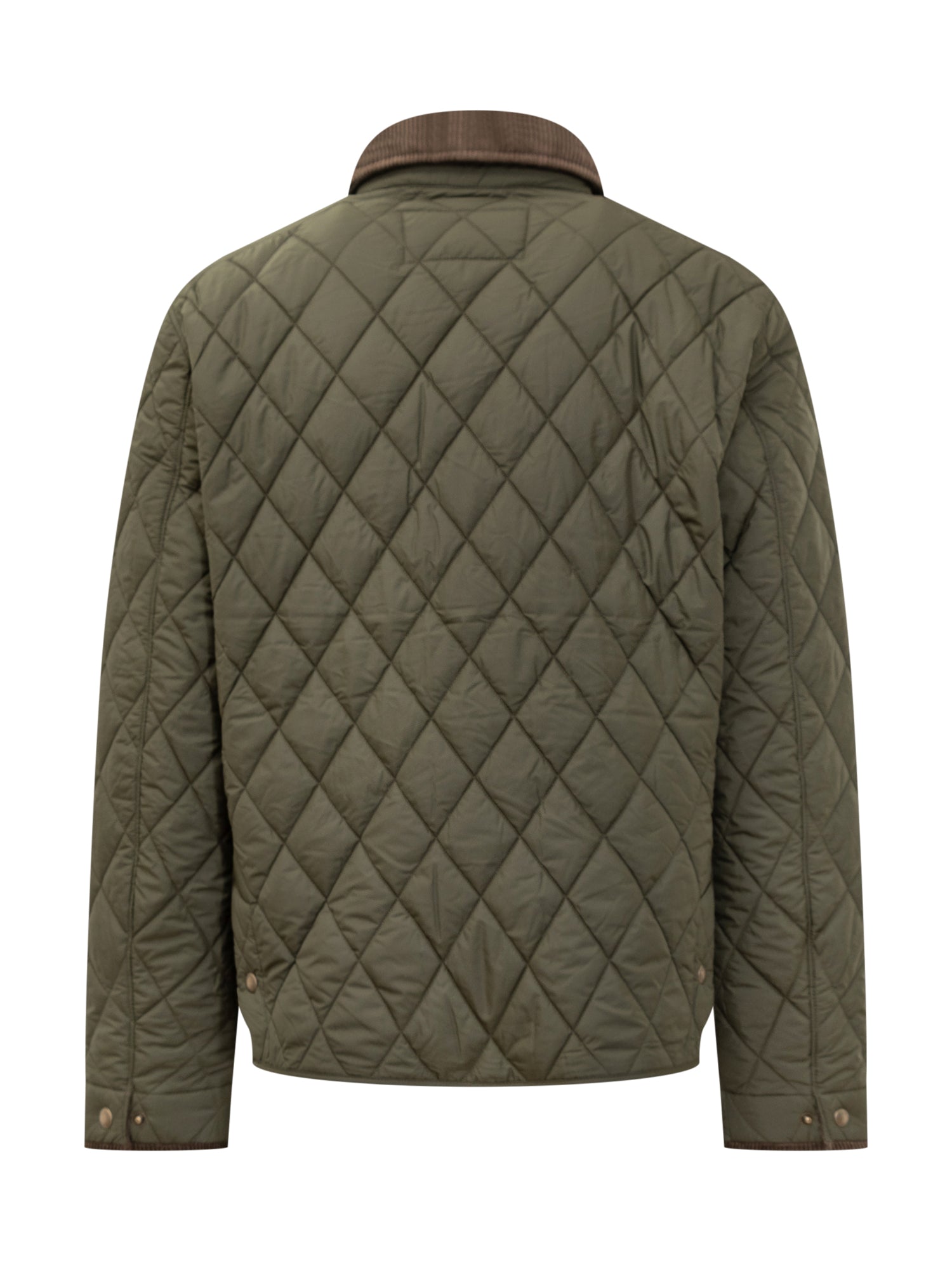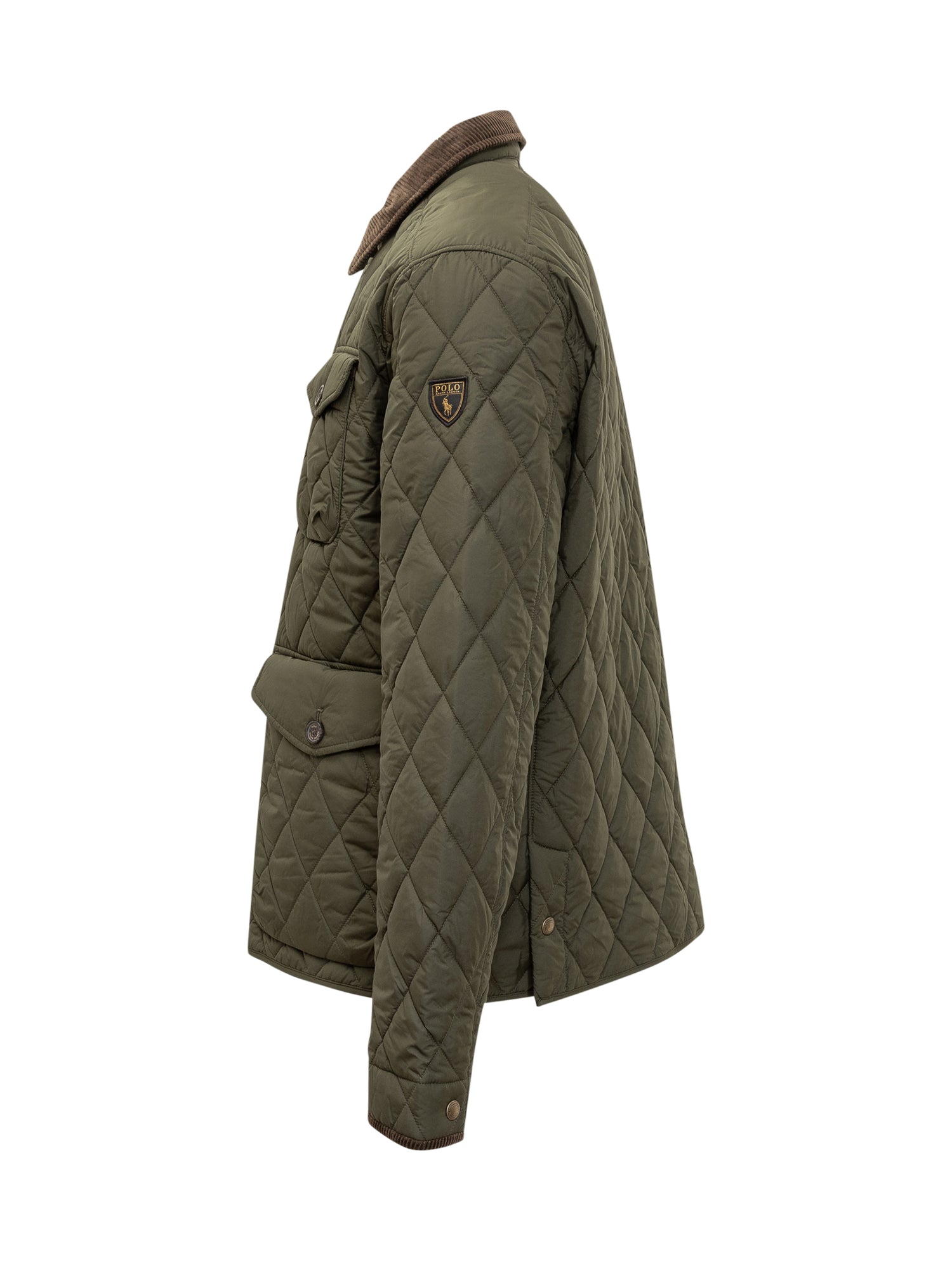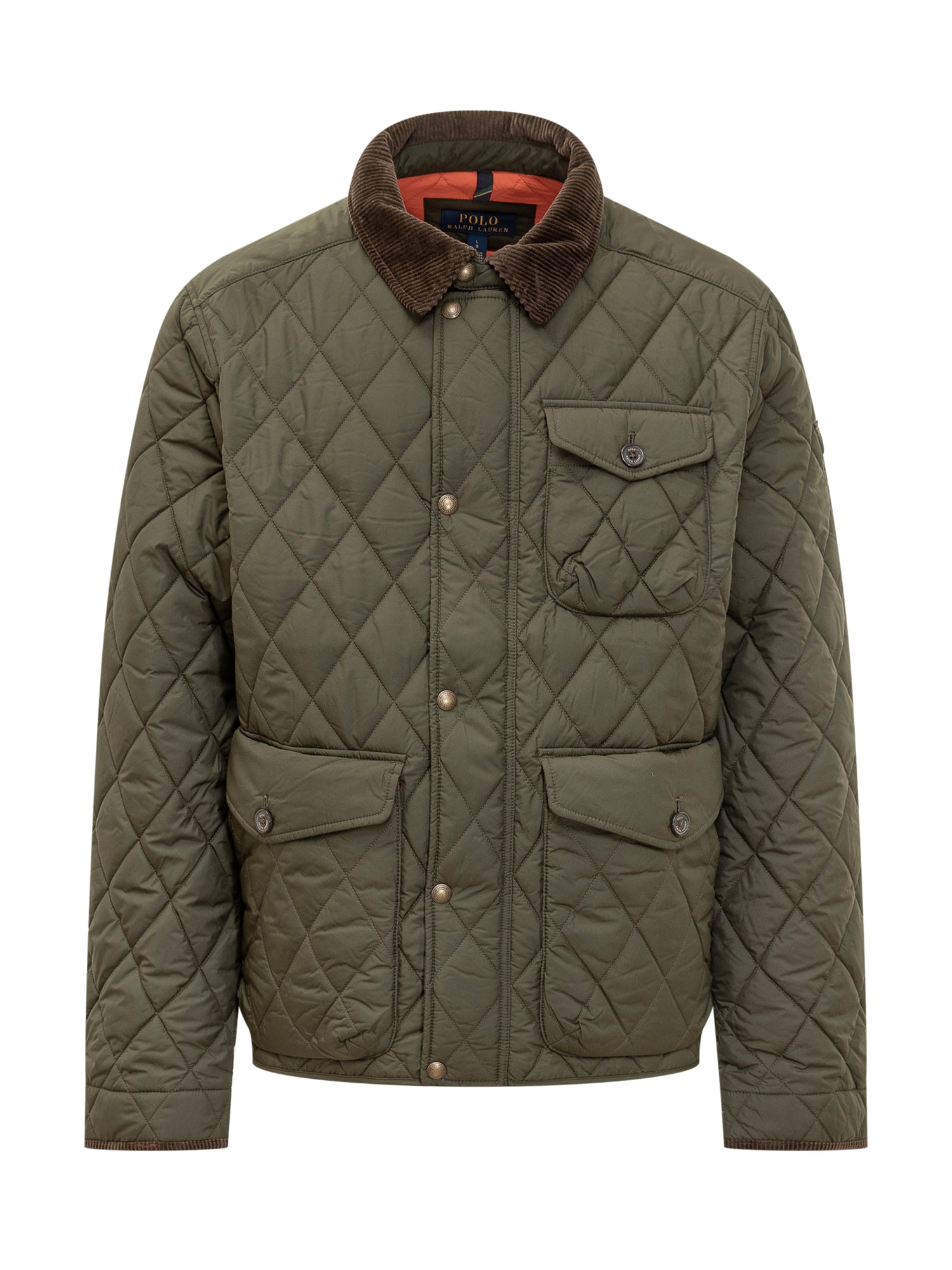 Elegante giacca trapuntata firmata Polo Ralph Lauren in tonalità verde militare, con colletto in velluto marrone a contrasto. Presenta chiusura con bottoni automatici, tasca sul petto con pattina e doppie tasche frontali. Interno arancione per un tocco distintivo. Perfetta per la mezza stagione.