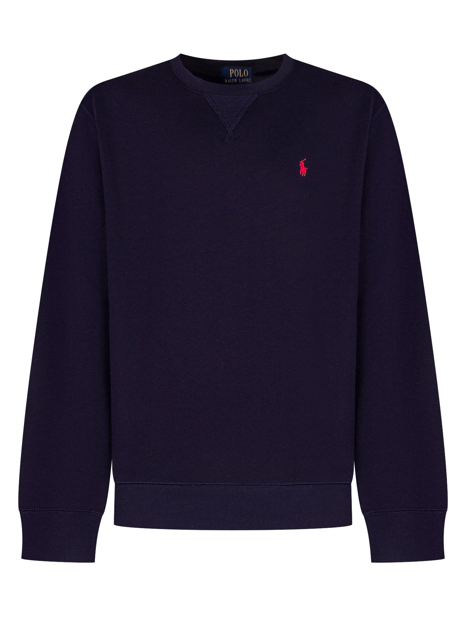 Felpa girocollo Polo Ralph Lauren in cotone blu navy con logo rosso ricamato.