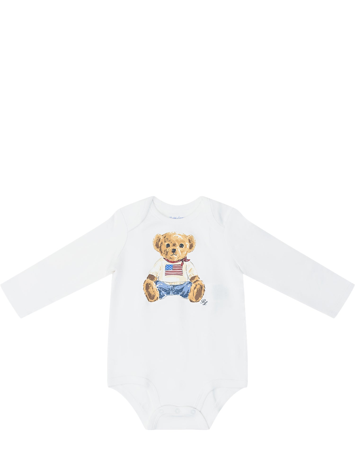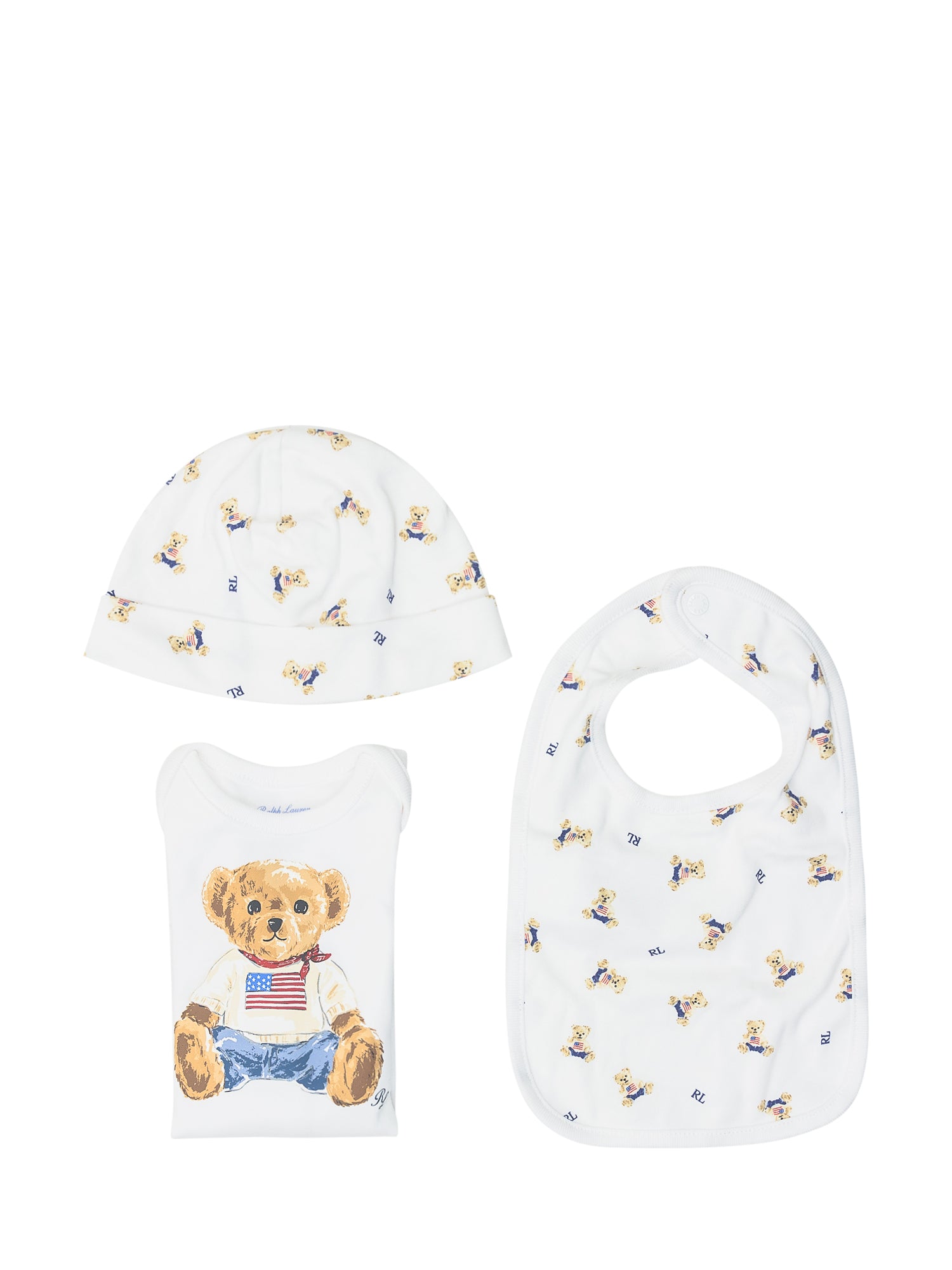 Set Polo Ralph Lauren in cotone, composto da body con iconico Teddy Bear, cappellino e bavaglino stampati.