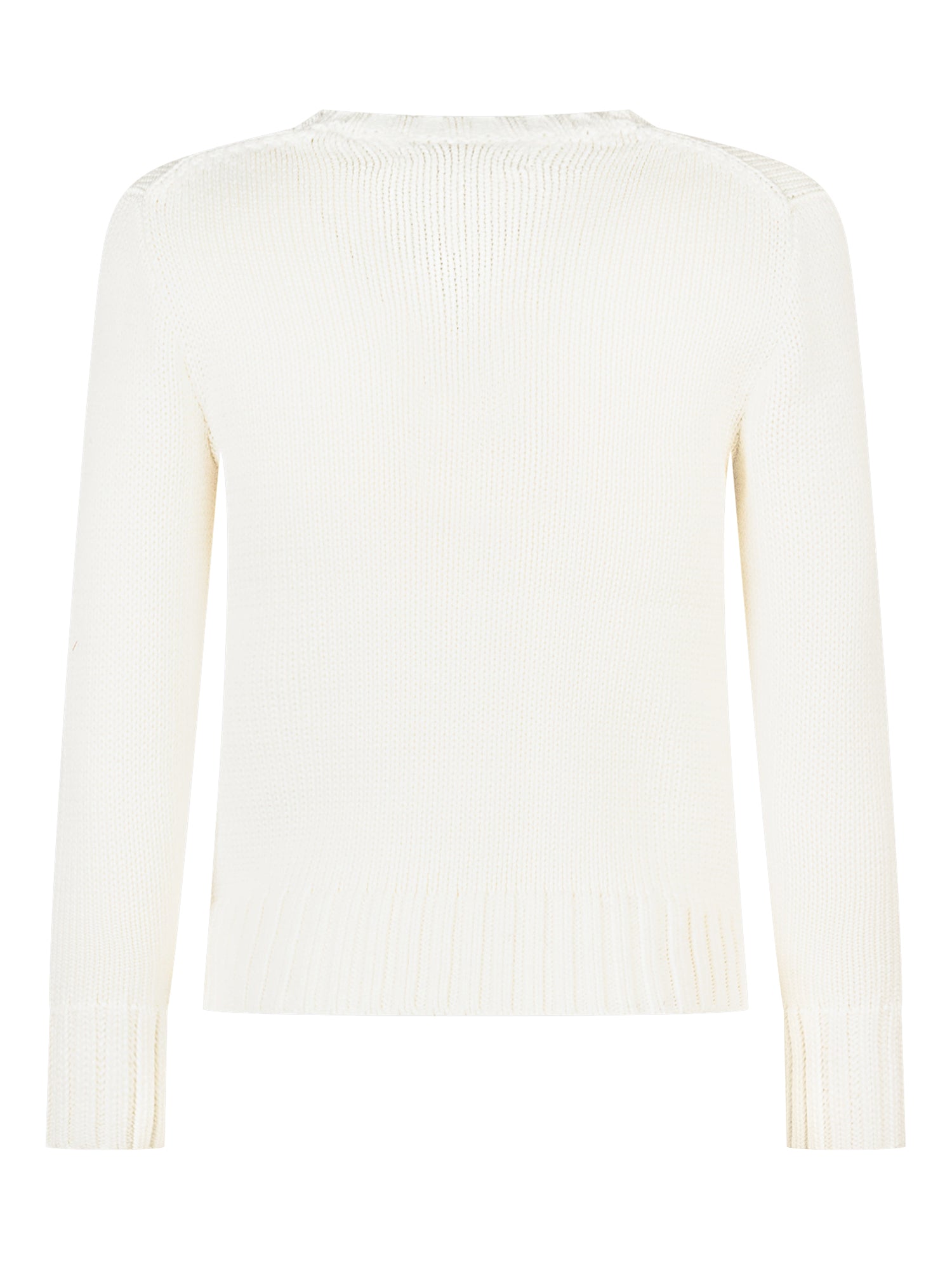 Maglione in cotone bianco firmato Polo Ralph Lauren Kids, con bandiera americana ricamata sul petto e iniziali RL in rosso sul fondo.