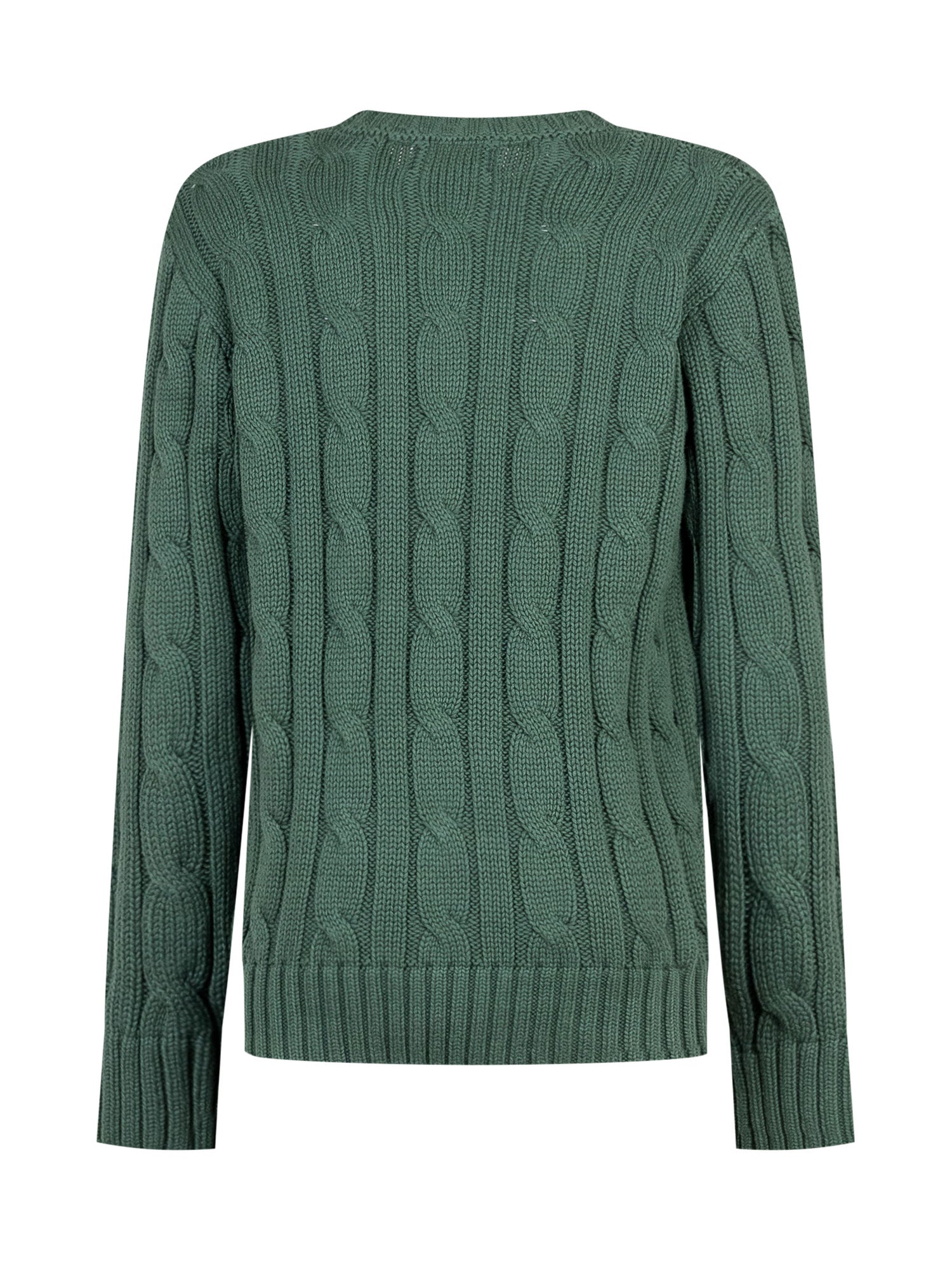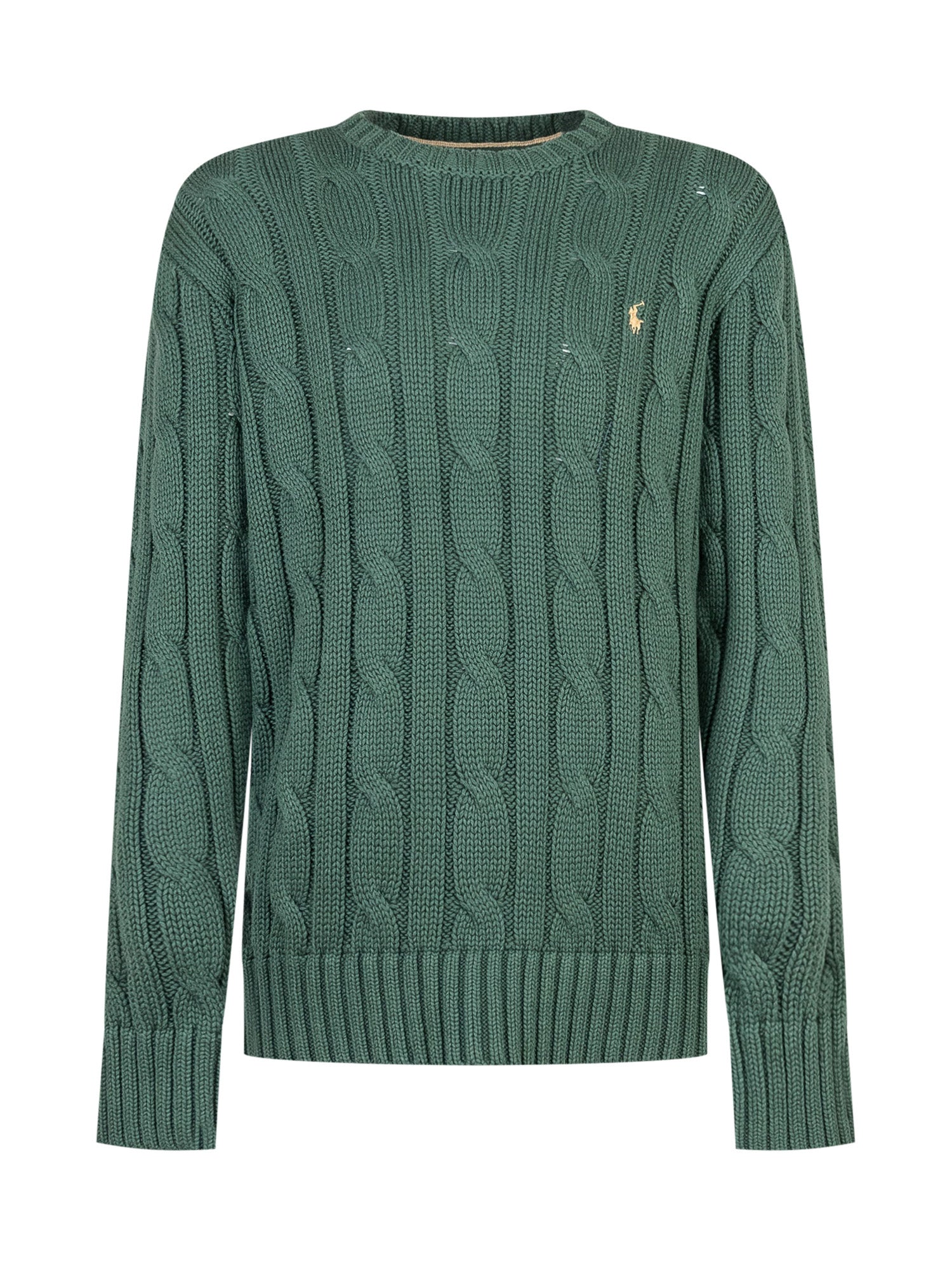 Maglione Polo Ralph Lauren Kids verde con lavorazione a treccia e logo ricamato sul petto.
