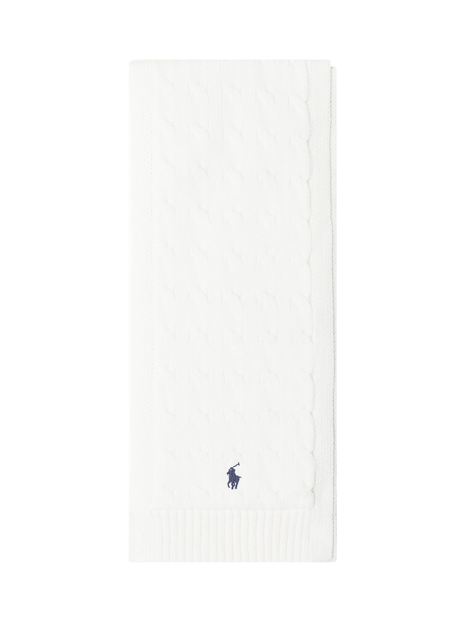 Sciarpa Polo Ralph Lauren in maglia bianca con lavorazione a trecce e iconico logo ricamato.