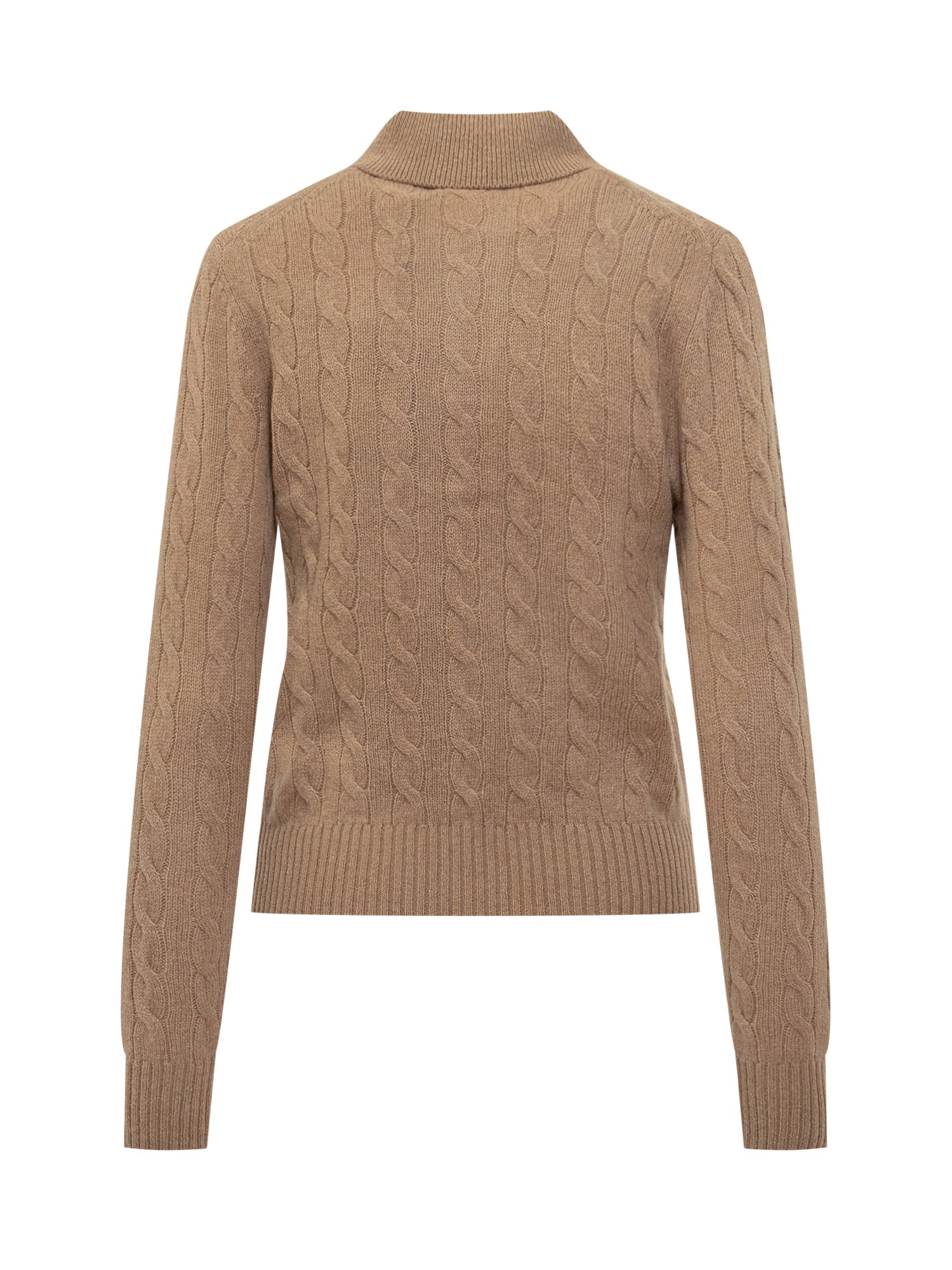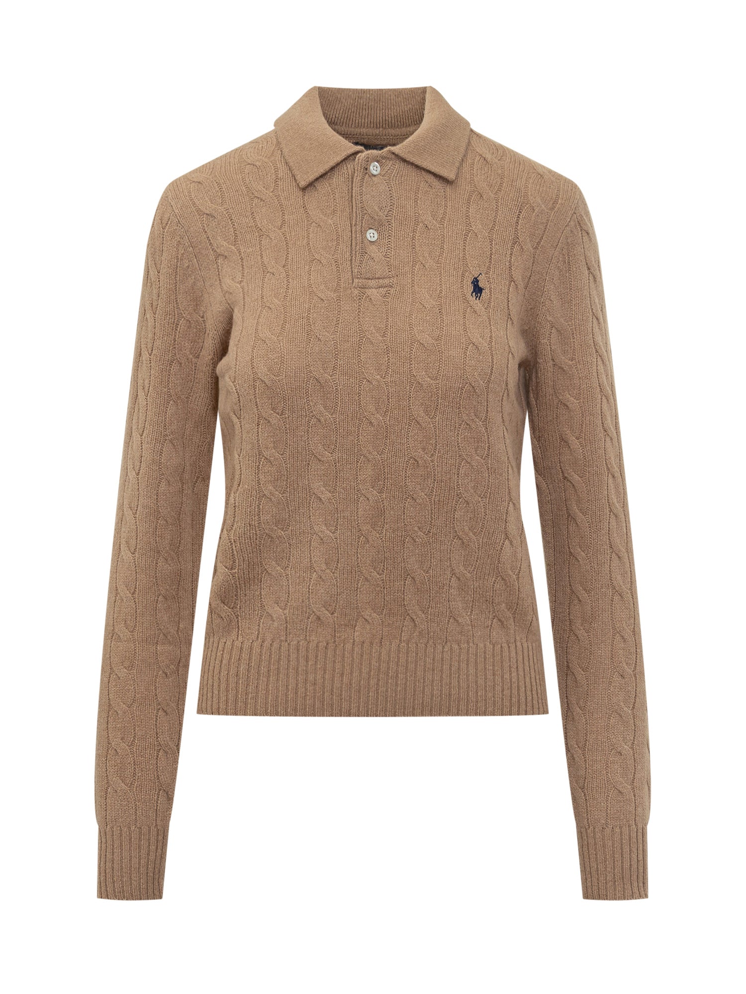 Maglia Polo Ralph Lauren in lana beige con lavorazione a treccia, colletto classico e logo ricamato sul petto.
