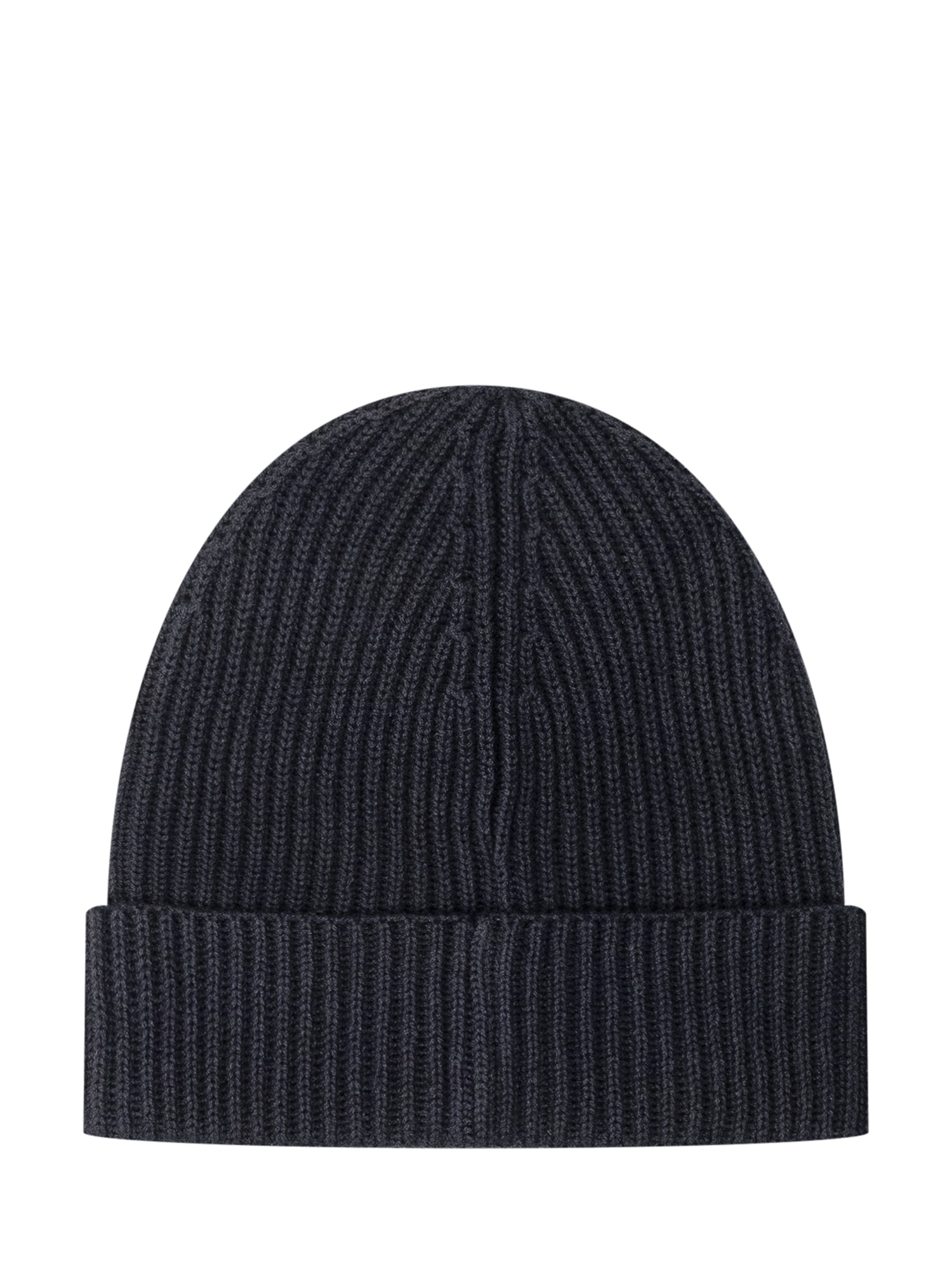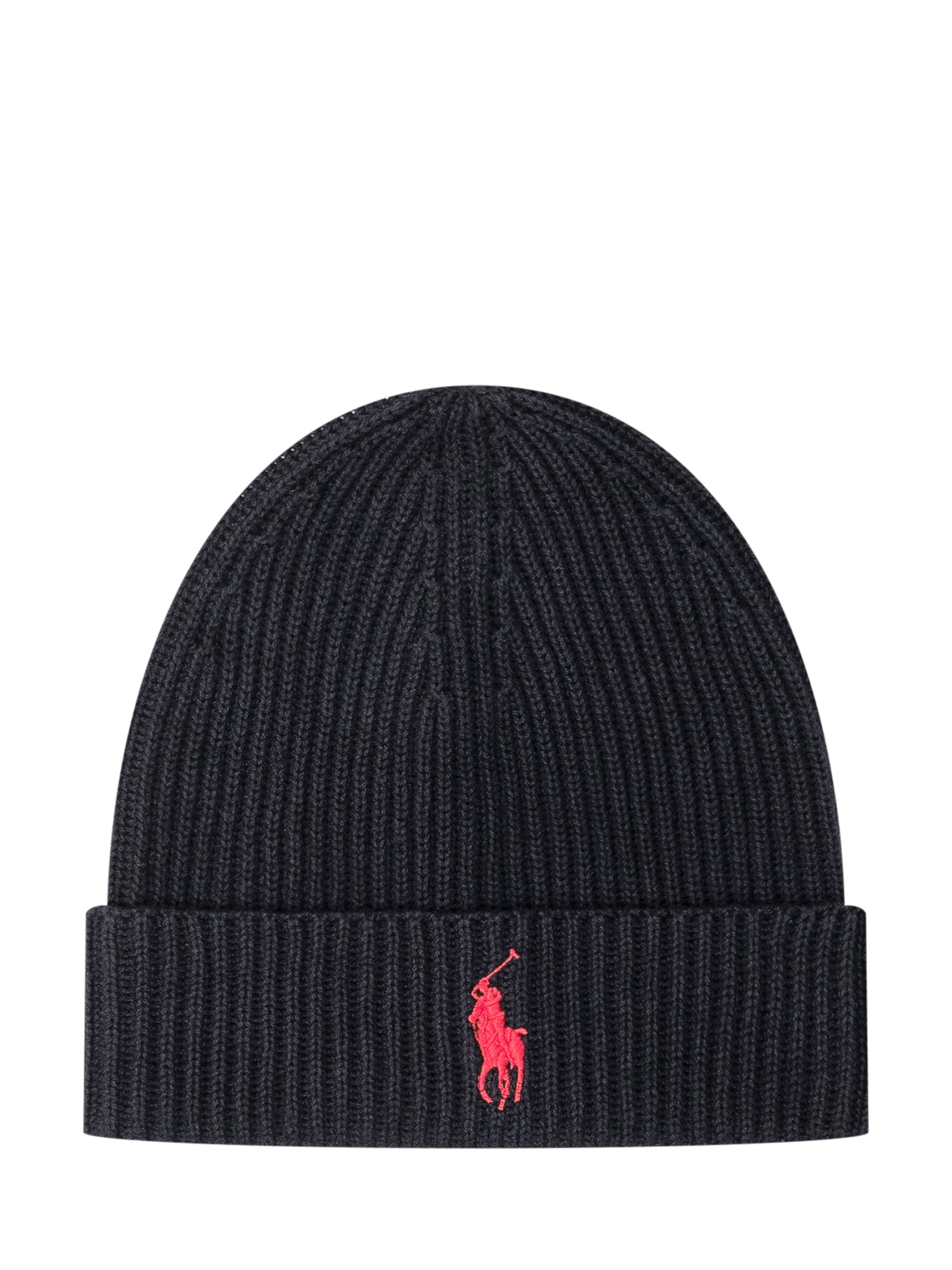 Cappello Polo Ralph Lauren in lana nera a coste con risvolto e iconico logo ricamato in rosso.