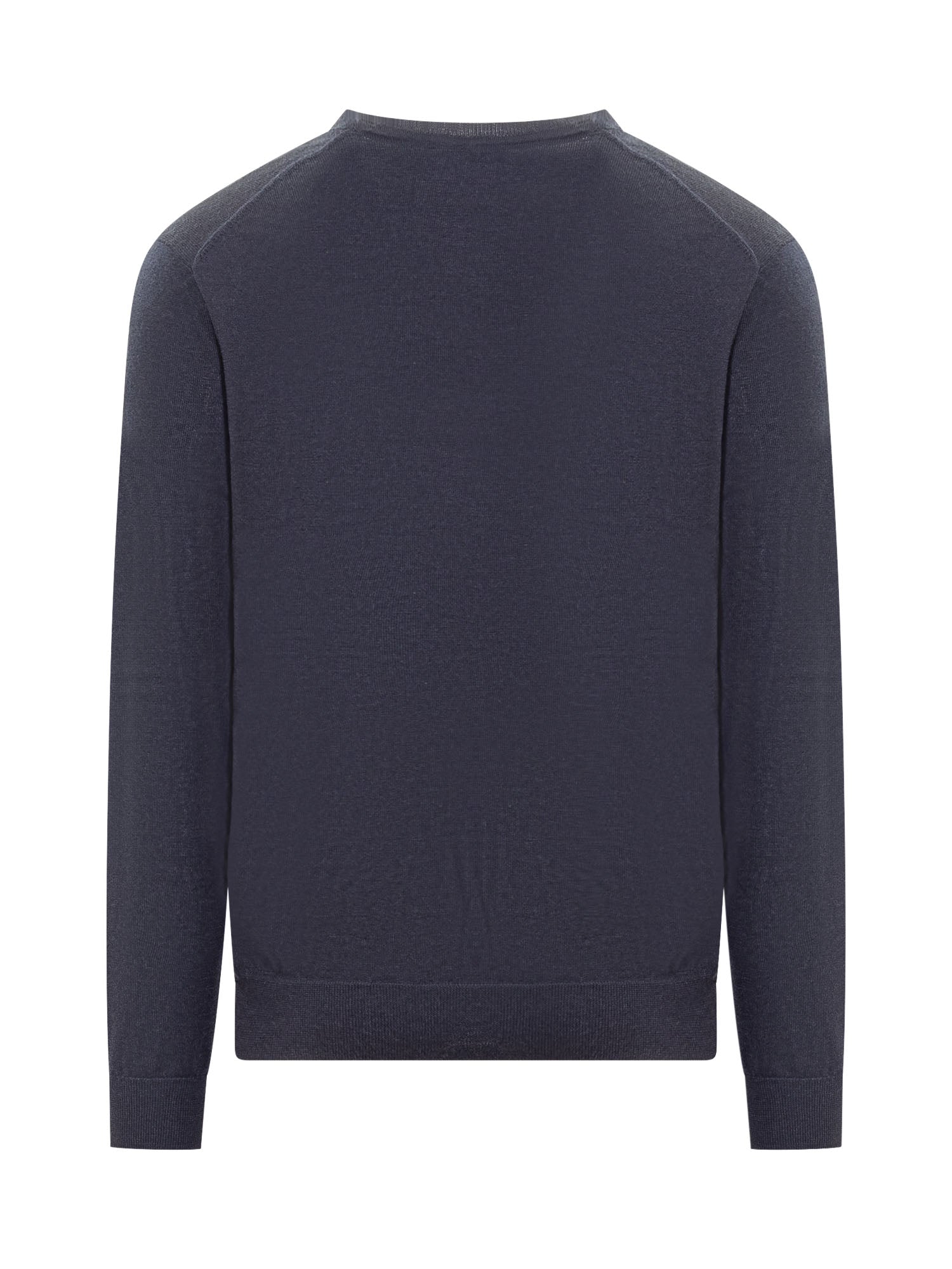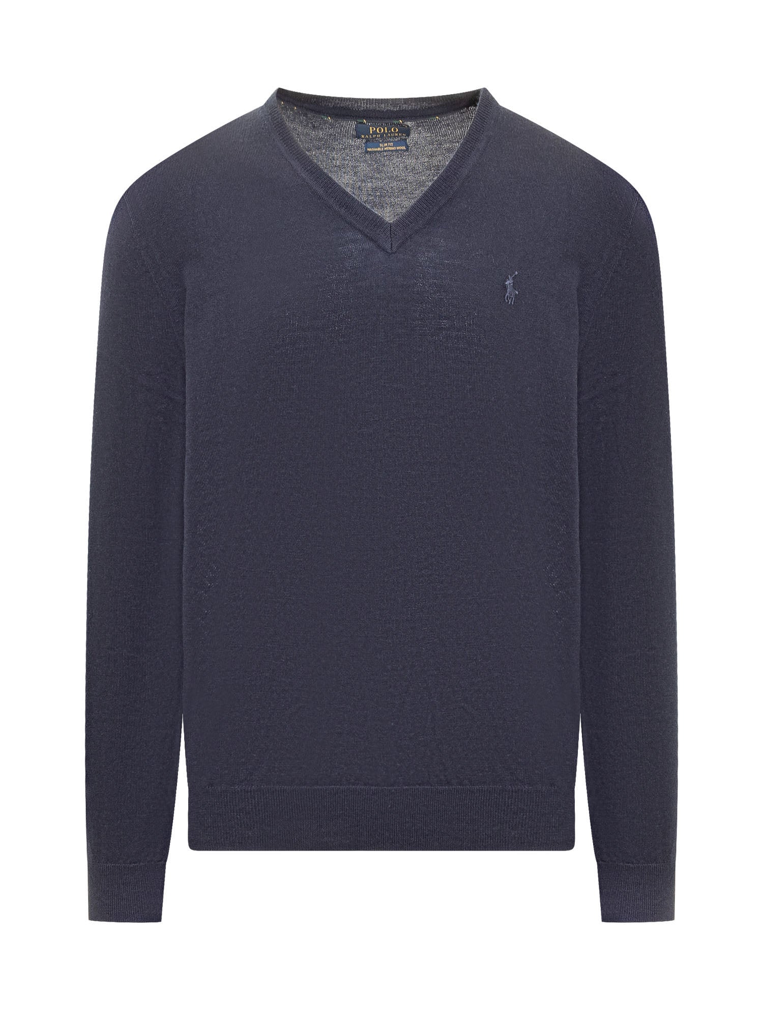 Pullover blu a maniche lunghe. Scollo a V. Logo ricamato sul petto. Collo, polsi e fondo a costine.