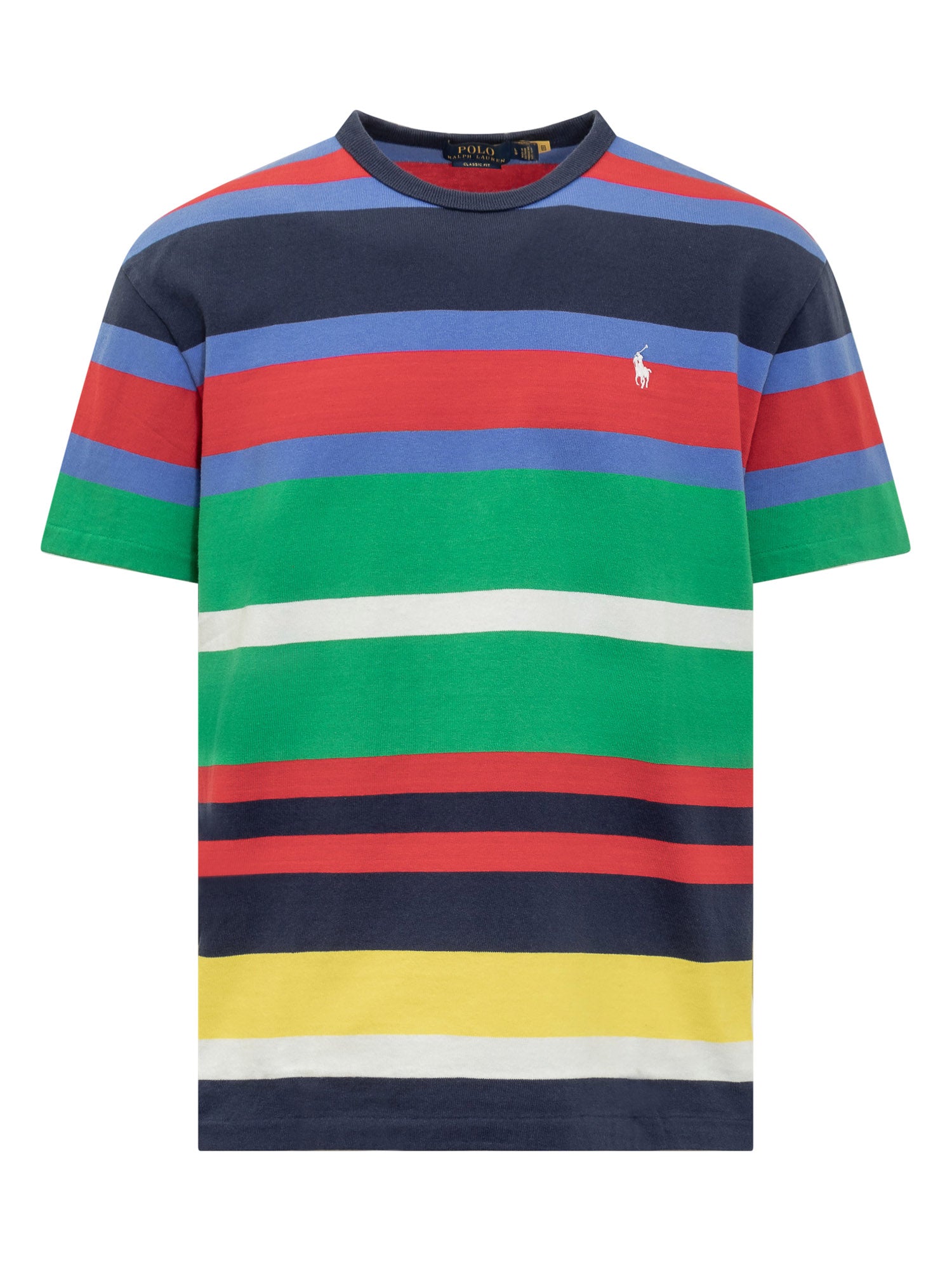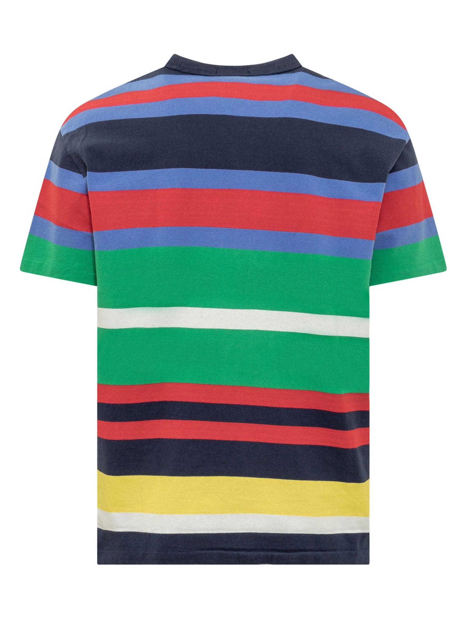 T-shirt girocollo. Logo ricamato sul petto. Collo a costine. Stampa a righe.