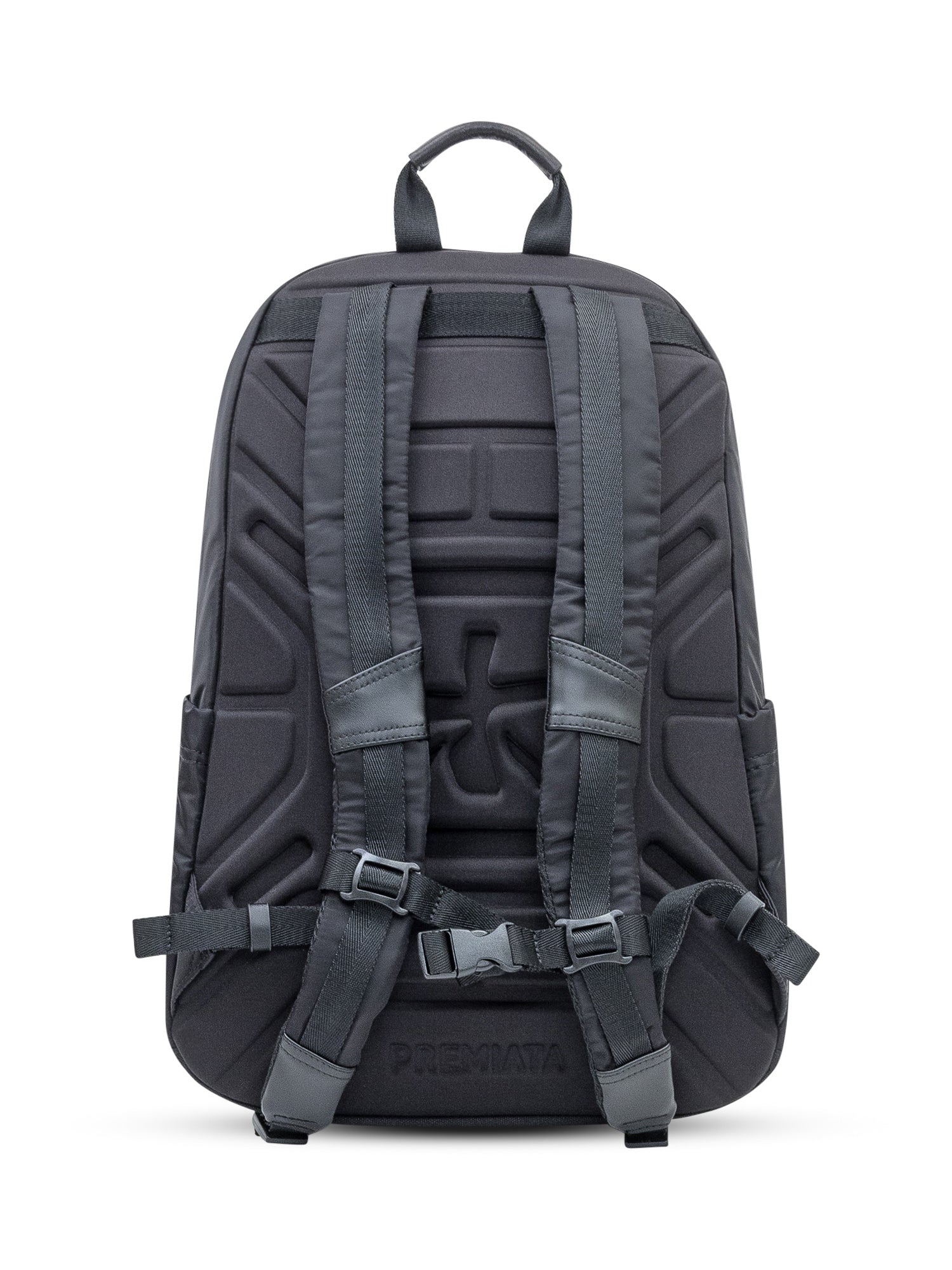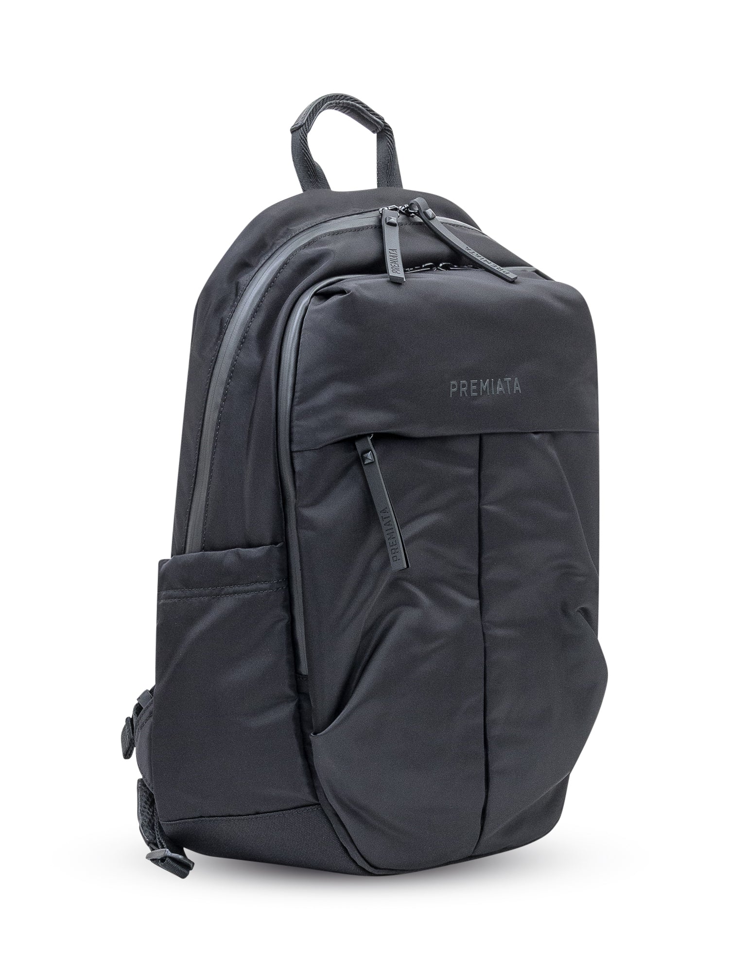 Zaino Premiata in tessuto tecnico nero con logo tono su tono. Dotato di tasche frontali con zip, spallacci regolabili e chiusura superiore a doppia zip.