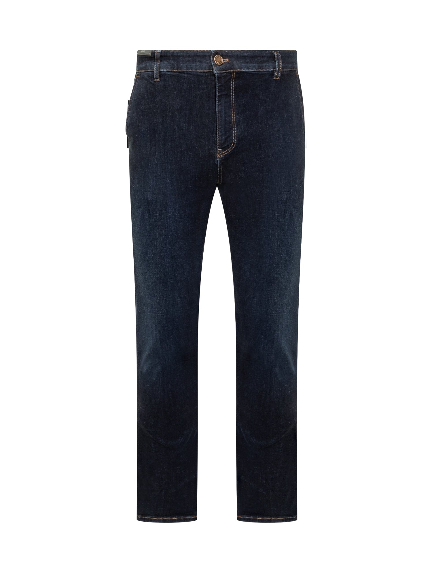 Jeans PT Torino modello Indie in denim blu scuro. Linea essenziale con cinque tasche e cuciture a contrasto. Fit regolare, vita media e gamba dritta.