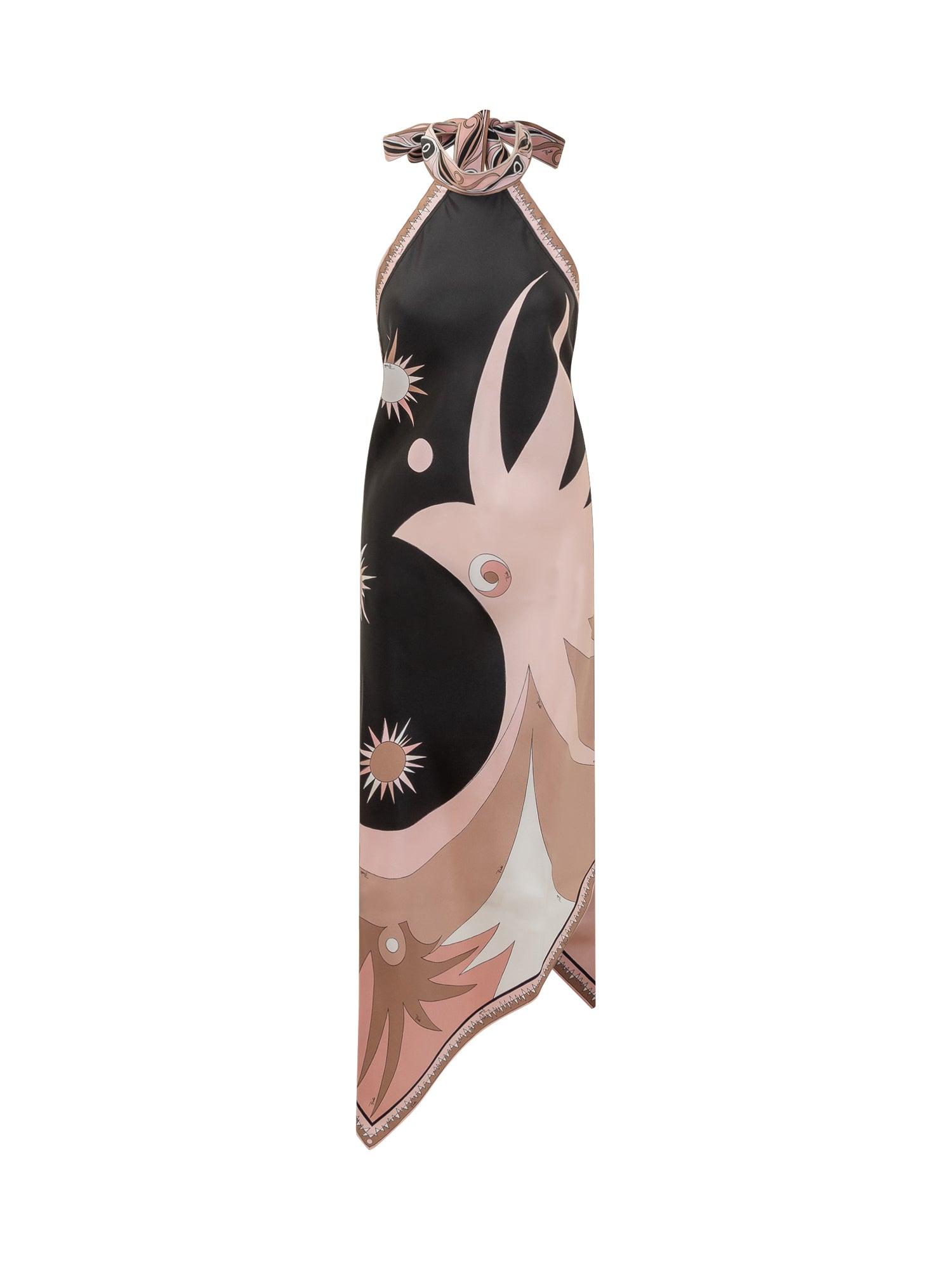 Abito lungo in seta. Smanicato. Fondo asimmetrico. Ampio scollo sul retro. Chiusura con lacci.