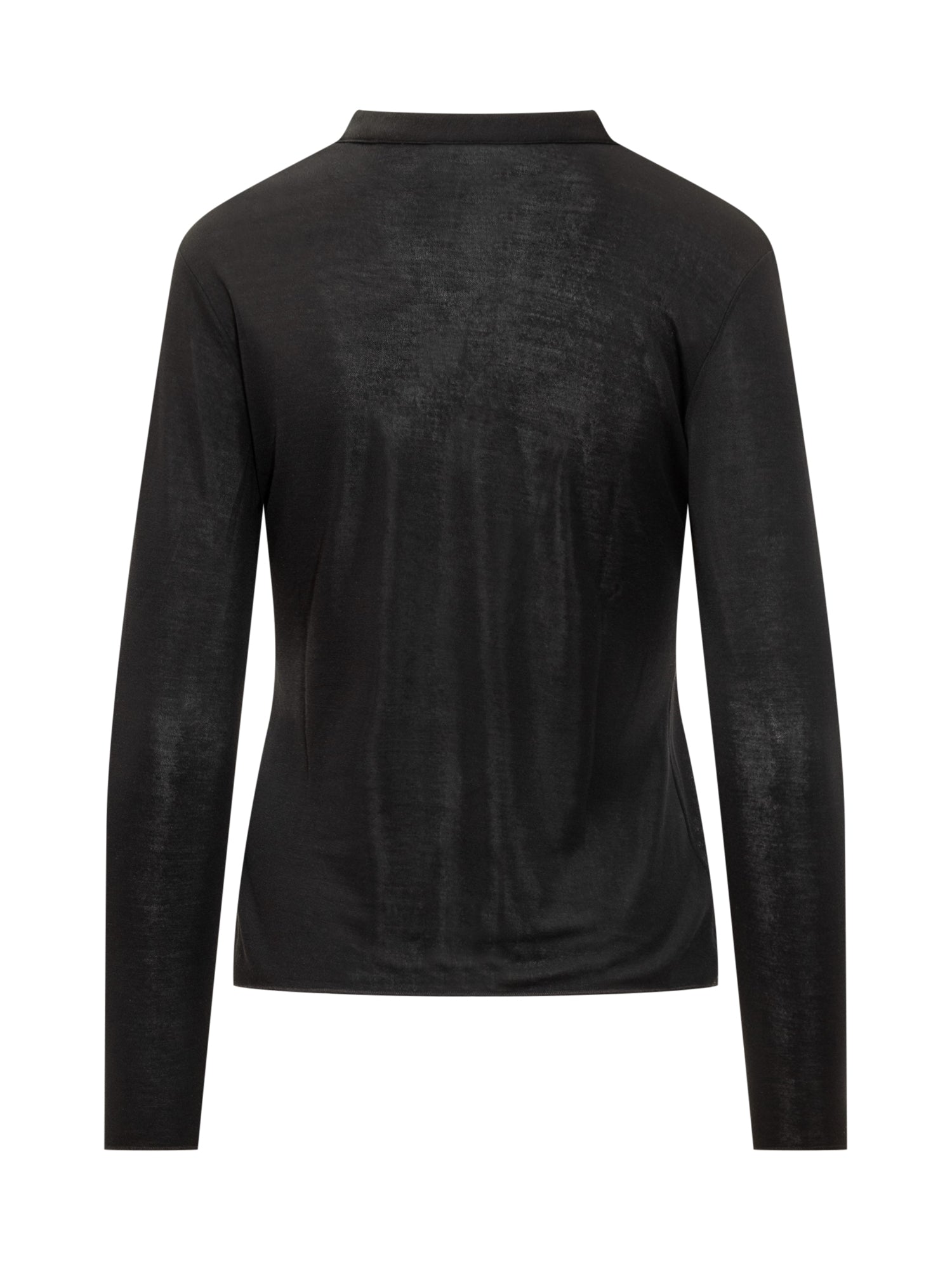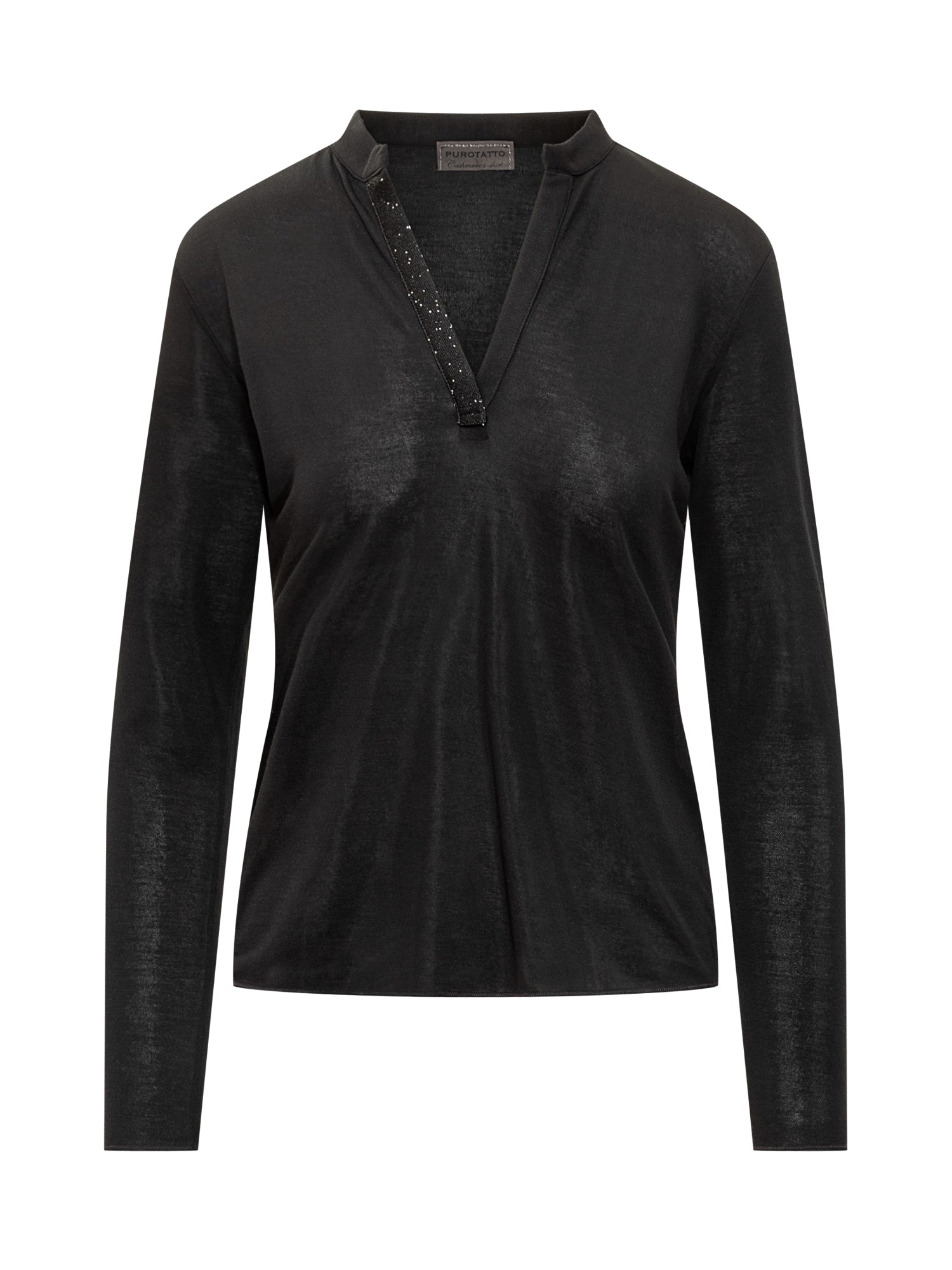 Maglia nera da donna a maniche lunghe con scollo a V e dettaglio in lurex brillante. Un capo leggero ed elegante, perfetto per look raffinati e versatili.