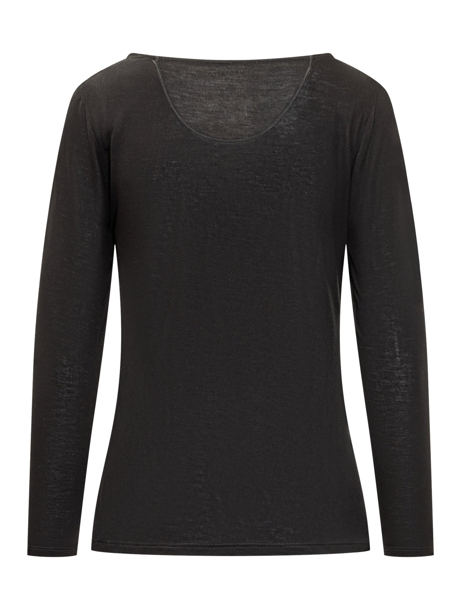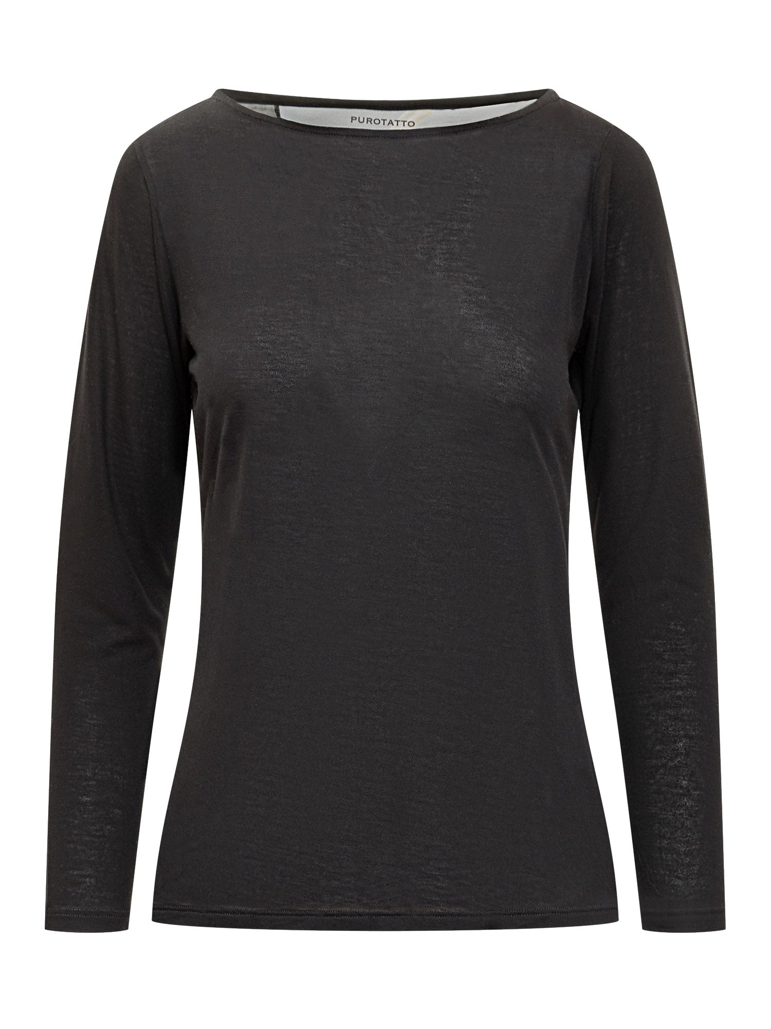 Maglia basic Purotatto in nero con maniche lunghe e scollo ampio. Realizzata in tessuto morbido e leggero, ideale da indossare sotto blazer o cardigan.