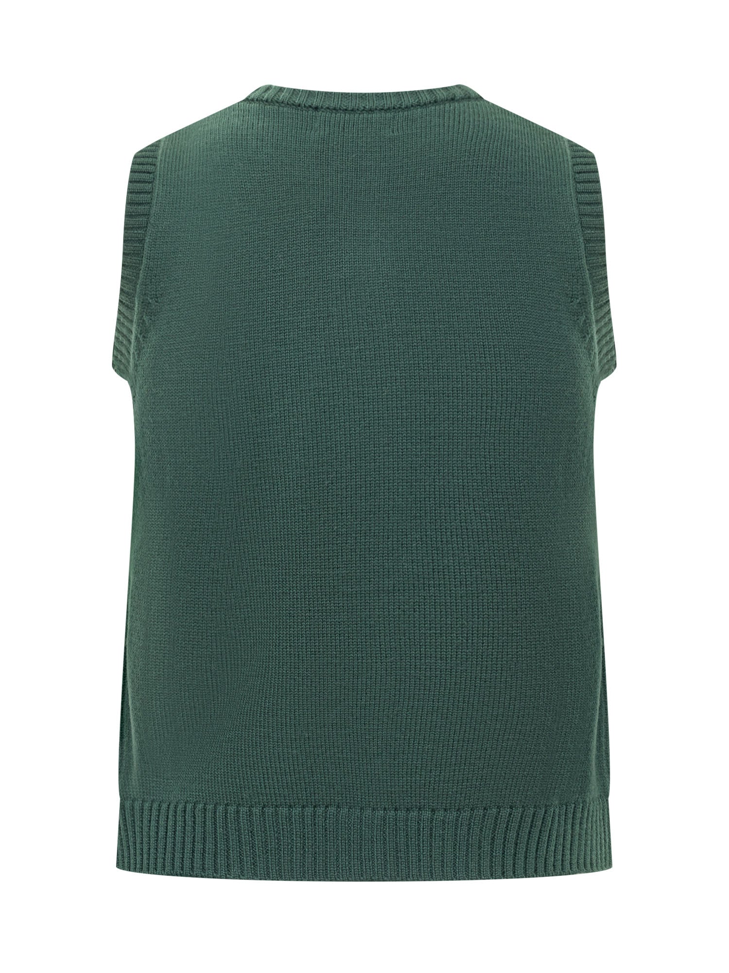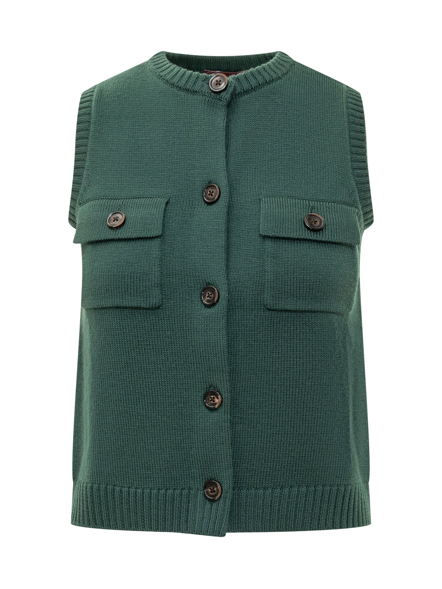 Gilet Quilisia in maglia con bottoni frontali e tasche applicate. Un capo versatile da indossare sopra camicie o maglie.