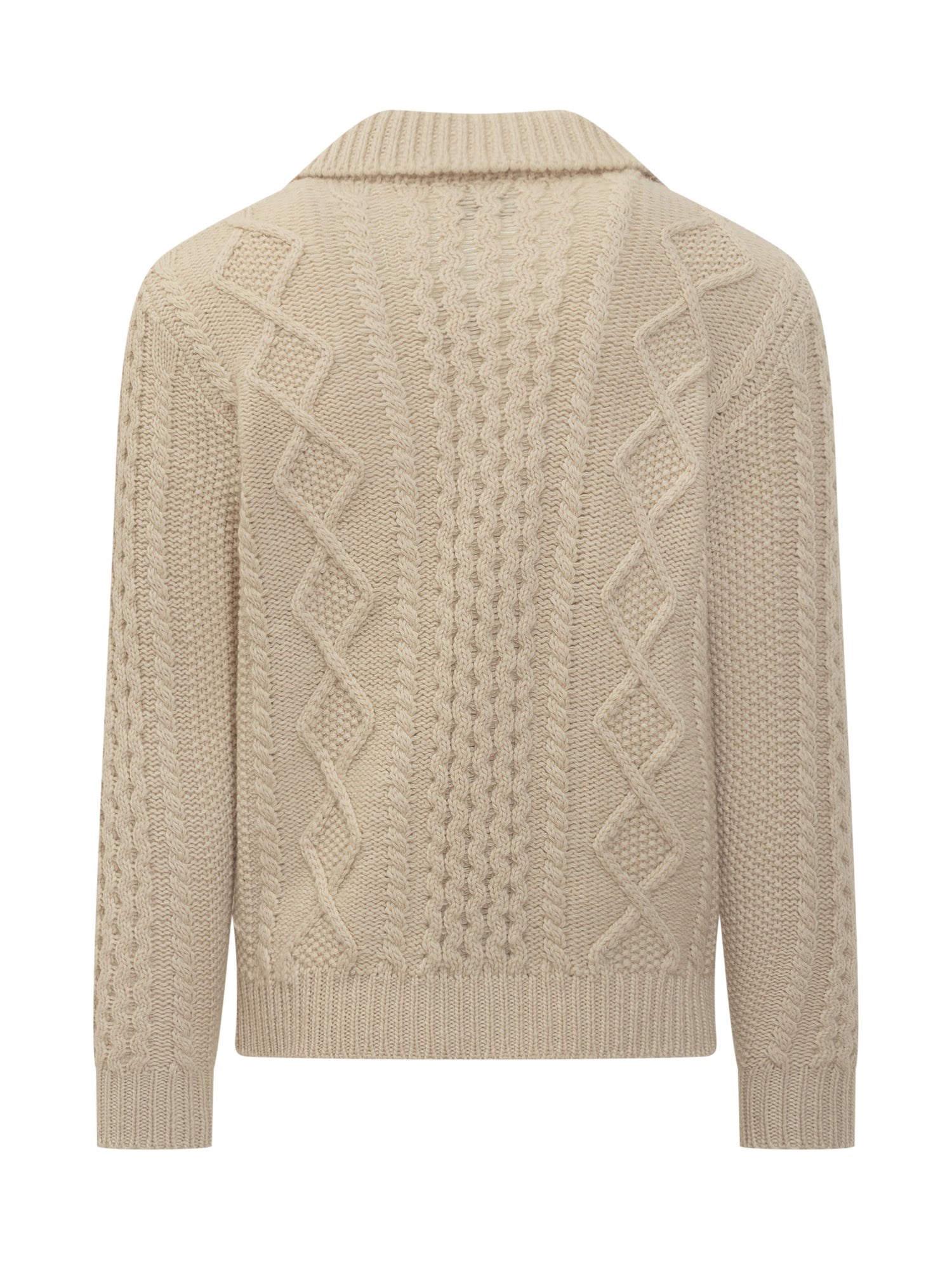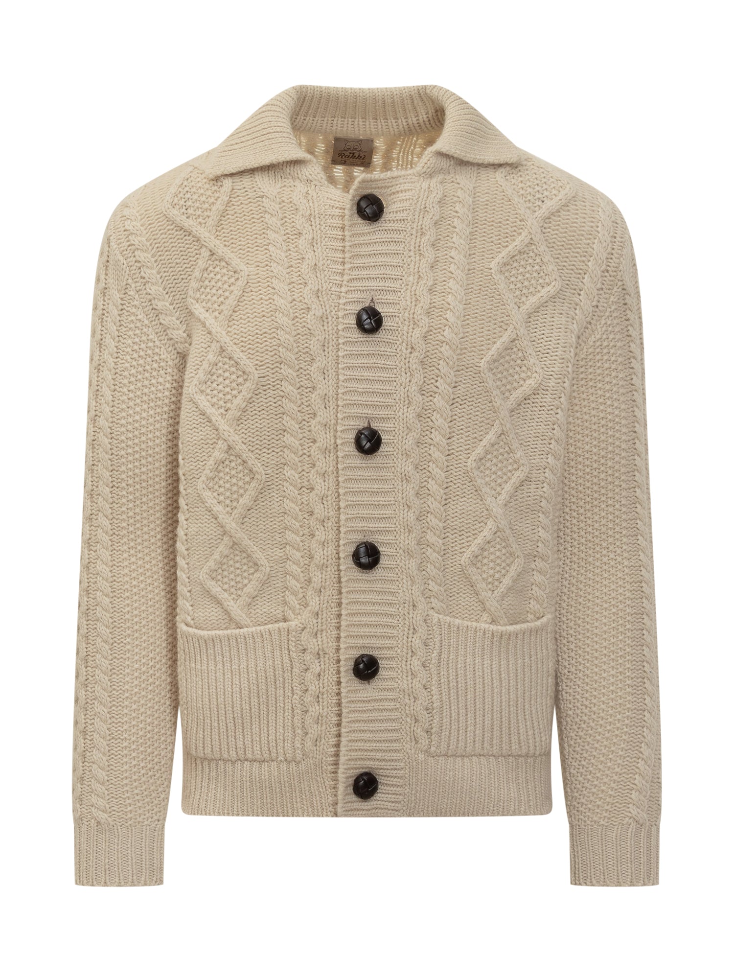 Cardigan Rakki in lana color panna con lavorazione a trecce e rombi. Modello con collo a camicia, tasche frontali e bottoni a contrasto.
