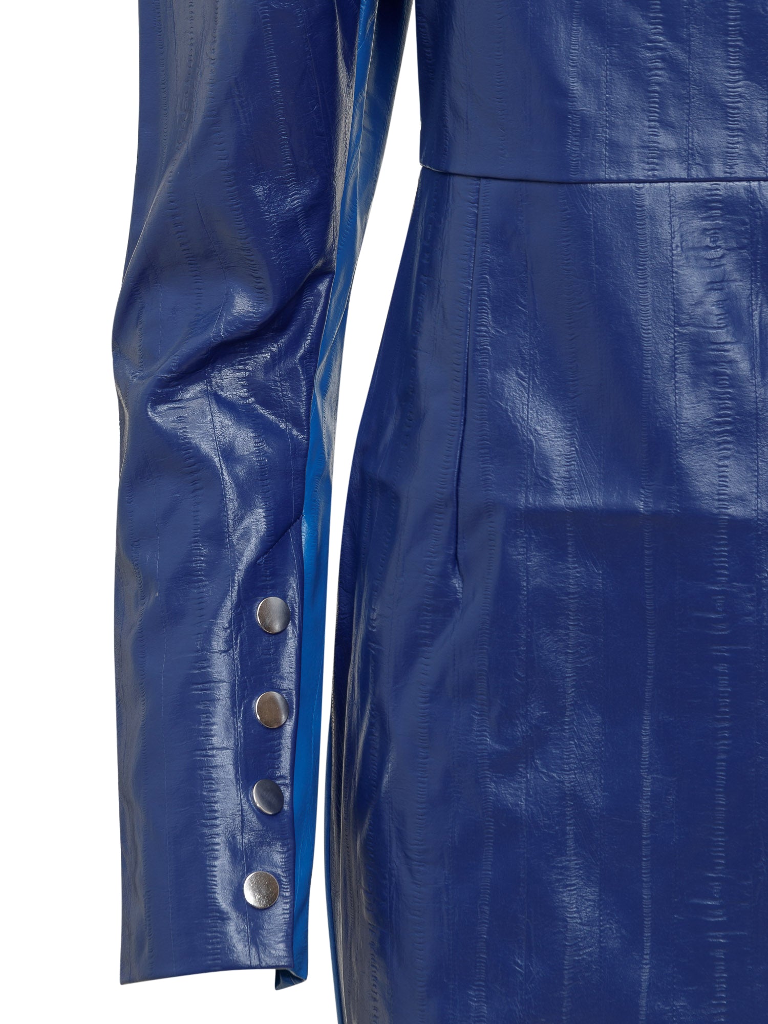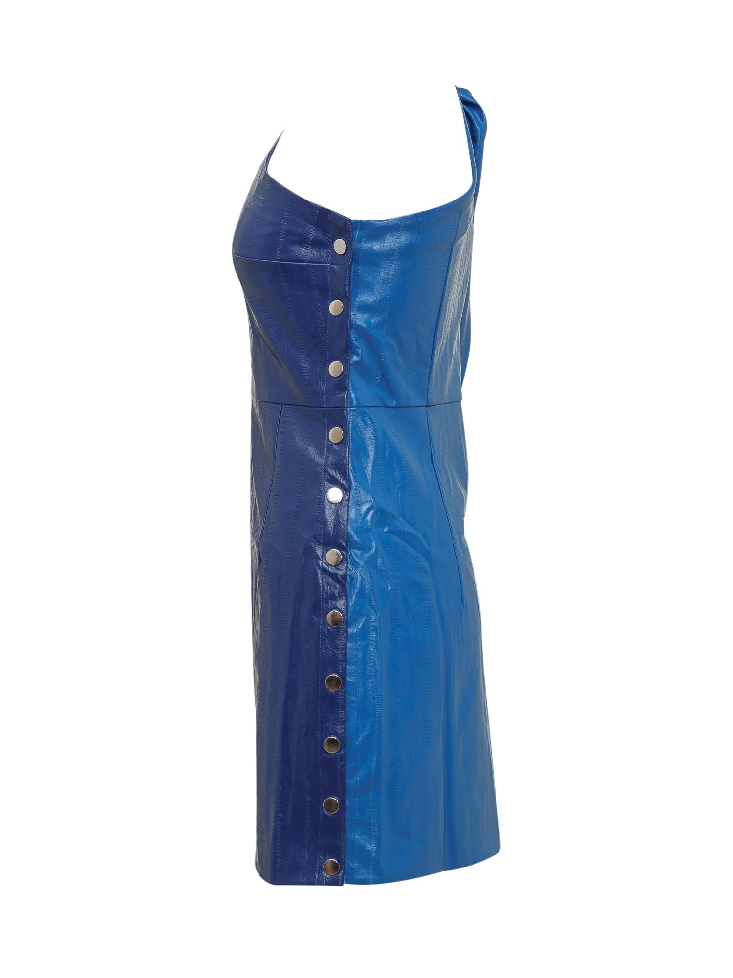 Abito monospalla blu. Chiusura con bottoni laterali. Bottoni ai polsi.