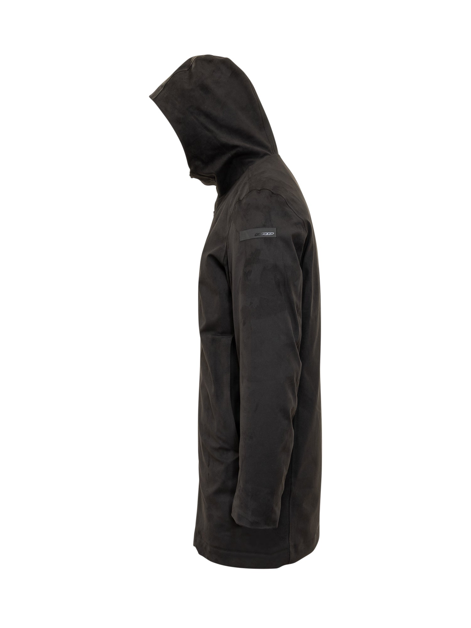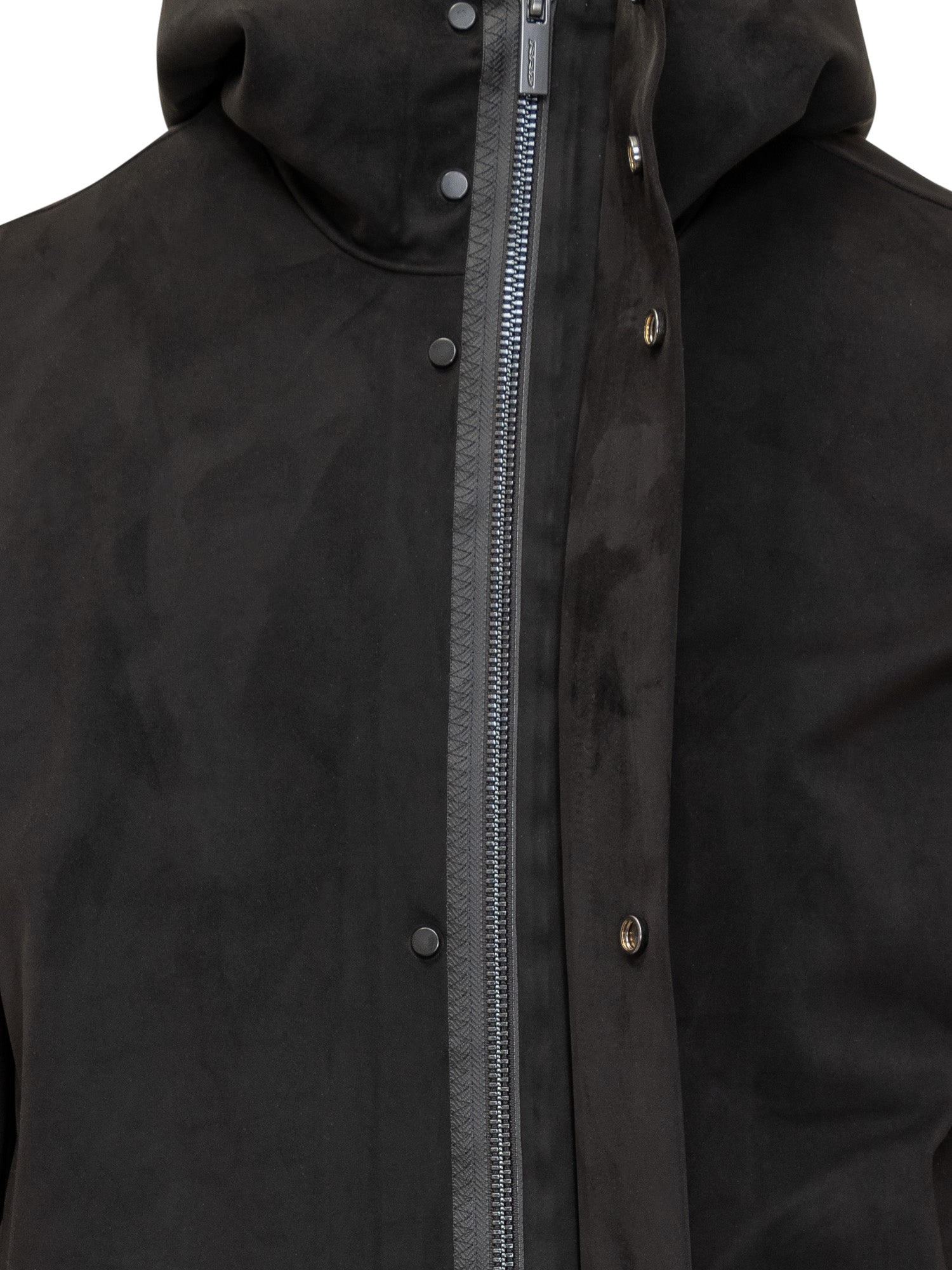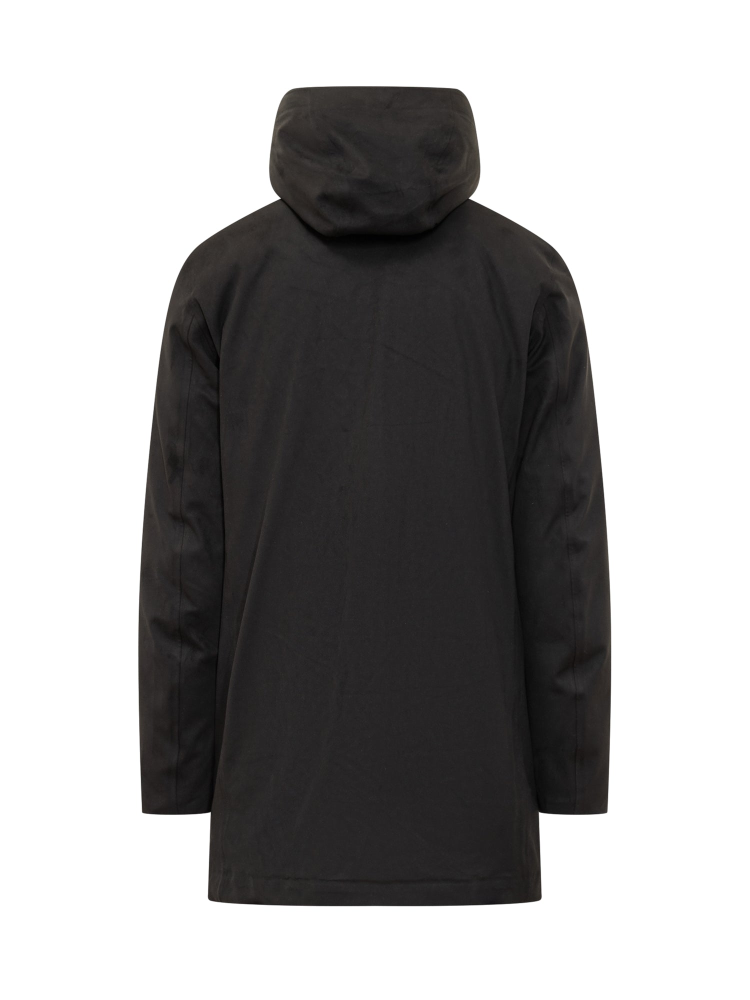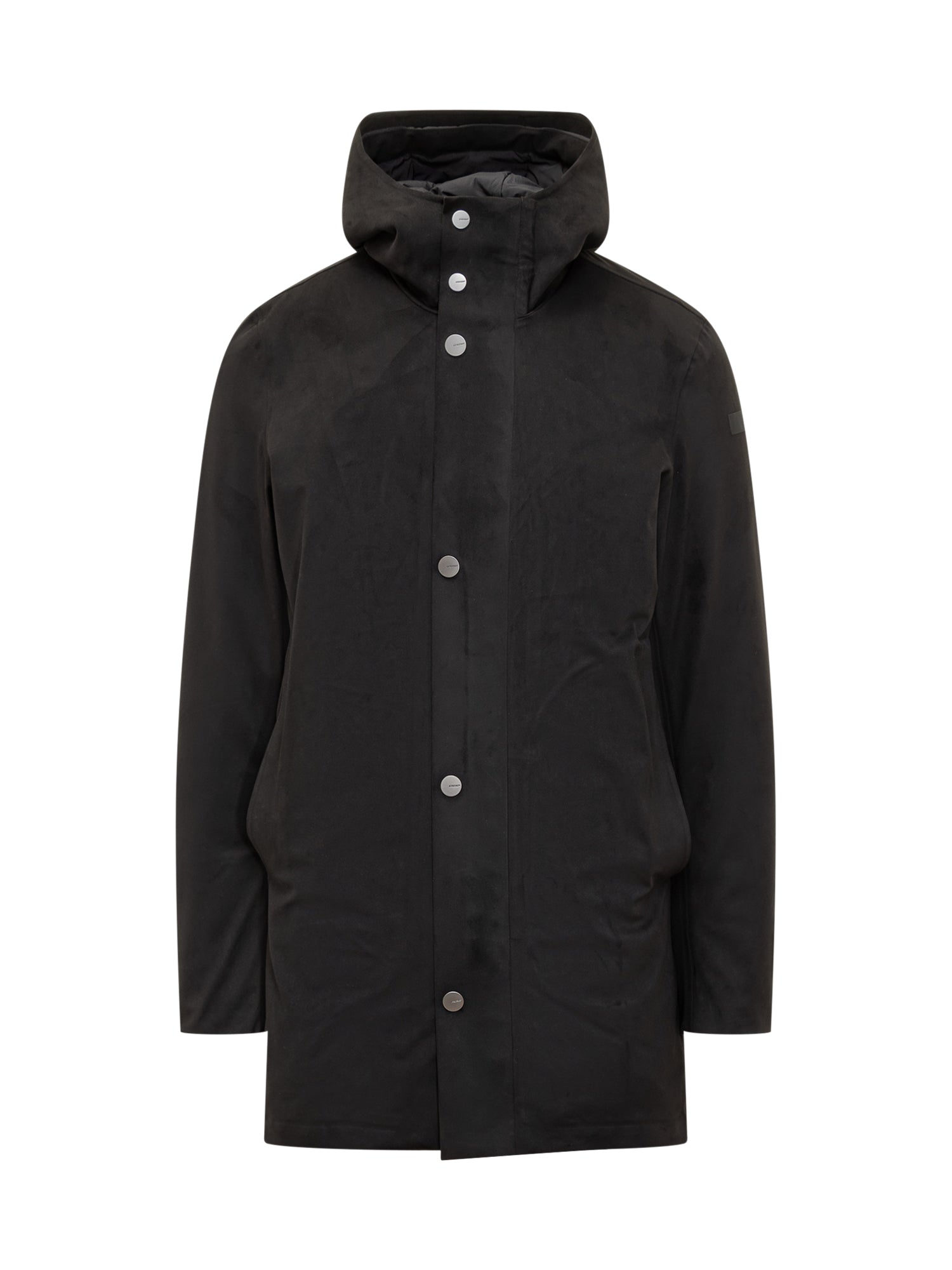 Parka RRD in tessuto tecnico nero con chiusura a zip e bottoni a pressione, cappuccio integrato e tasche laterali.