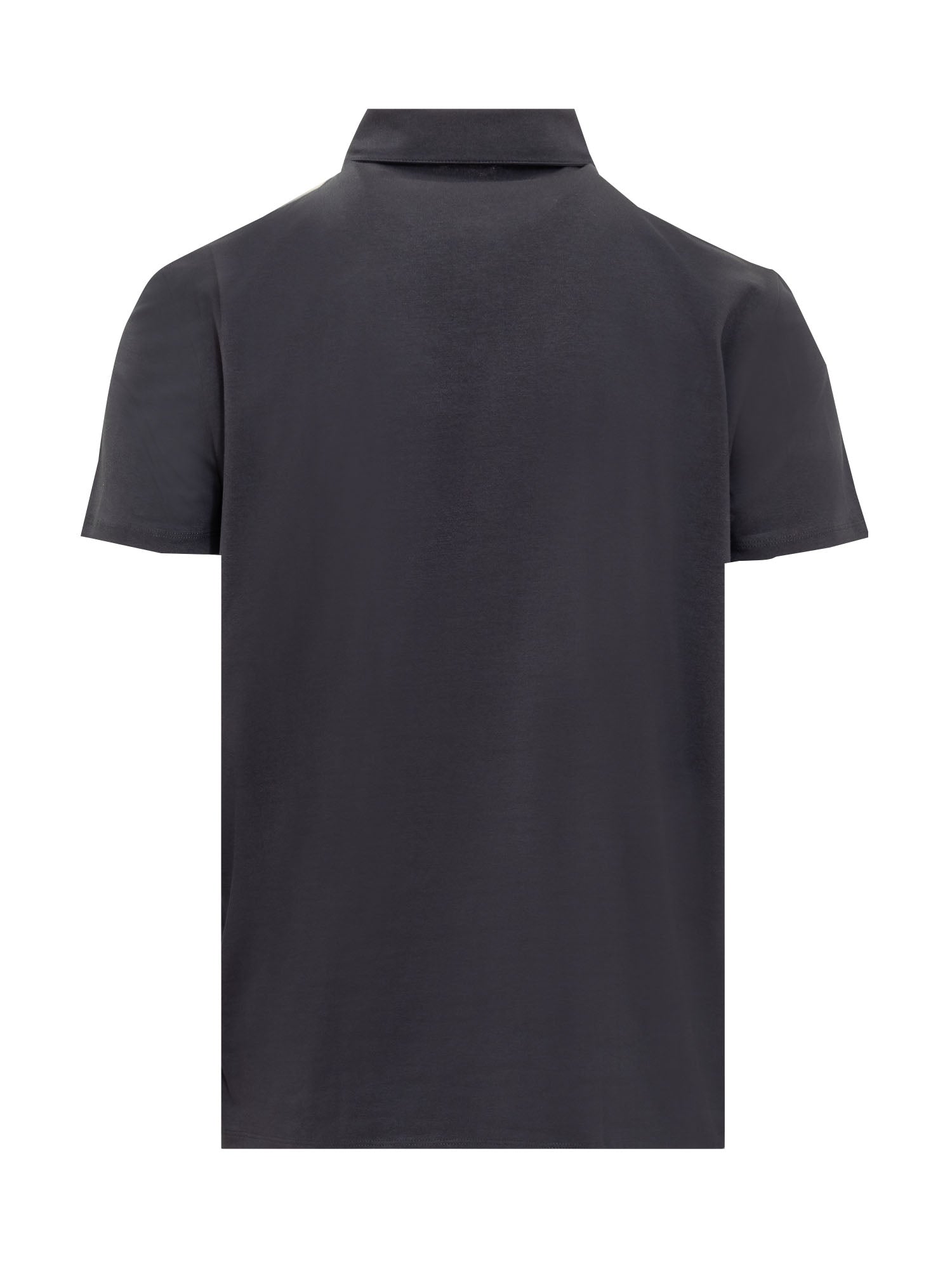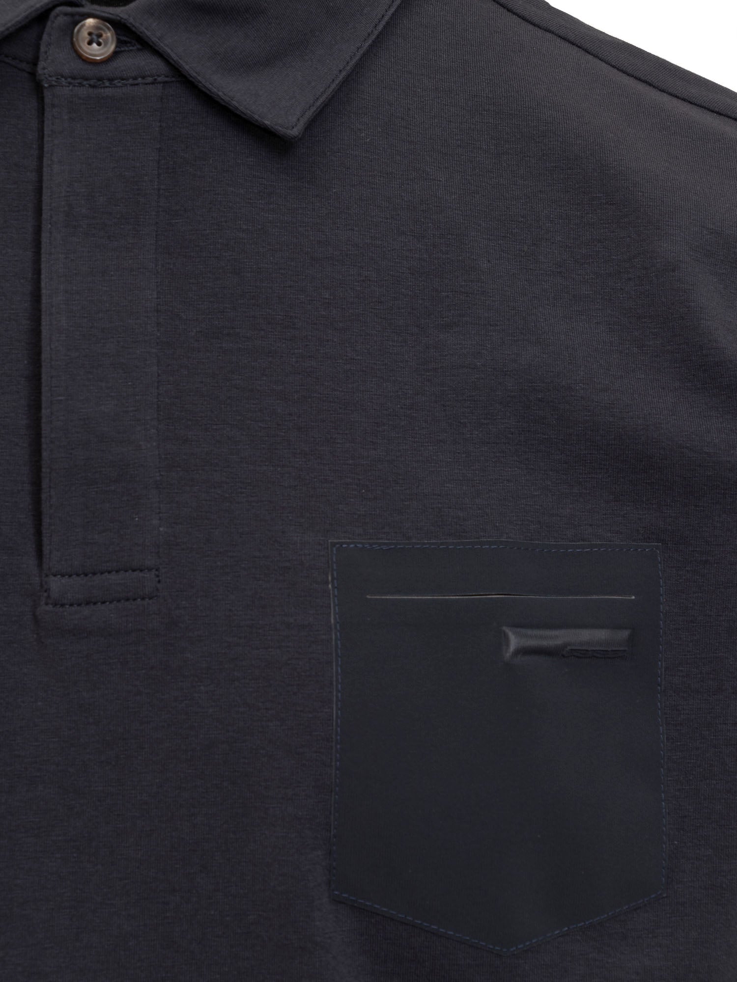 Polo maniche corte. Collo a punta. Chiusura con bottoni. Taschino a contrasto sul petto. Colore blu.