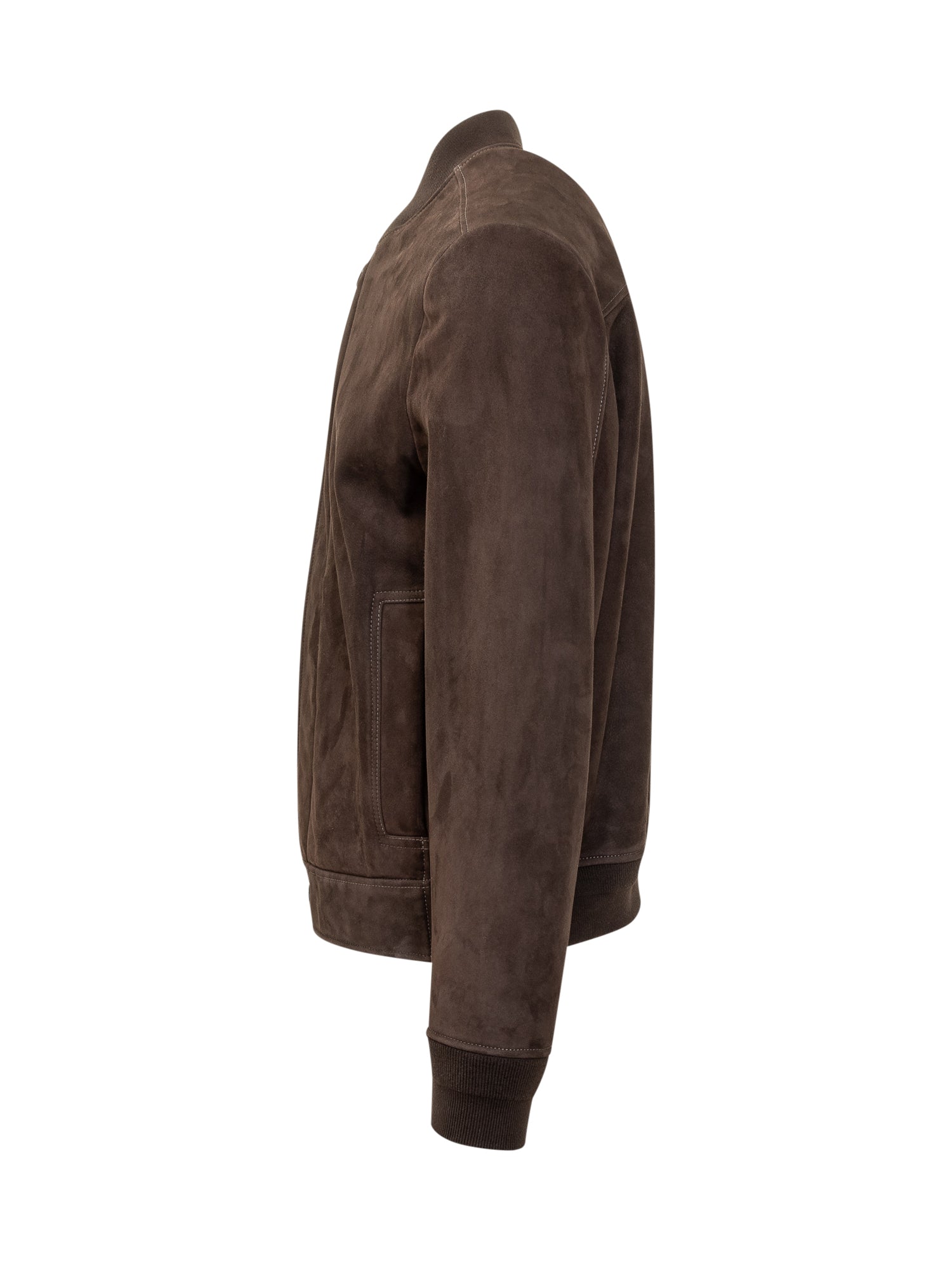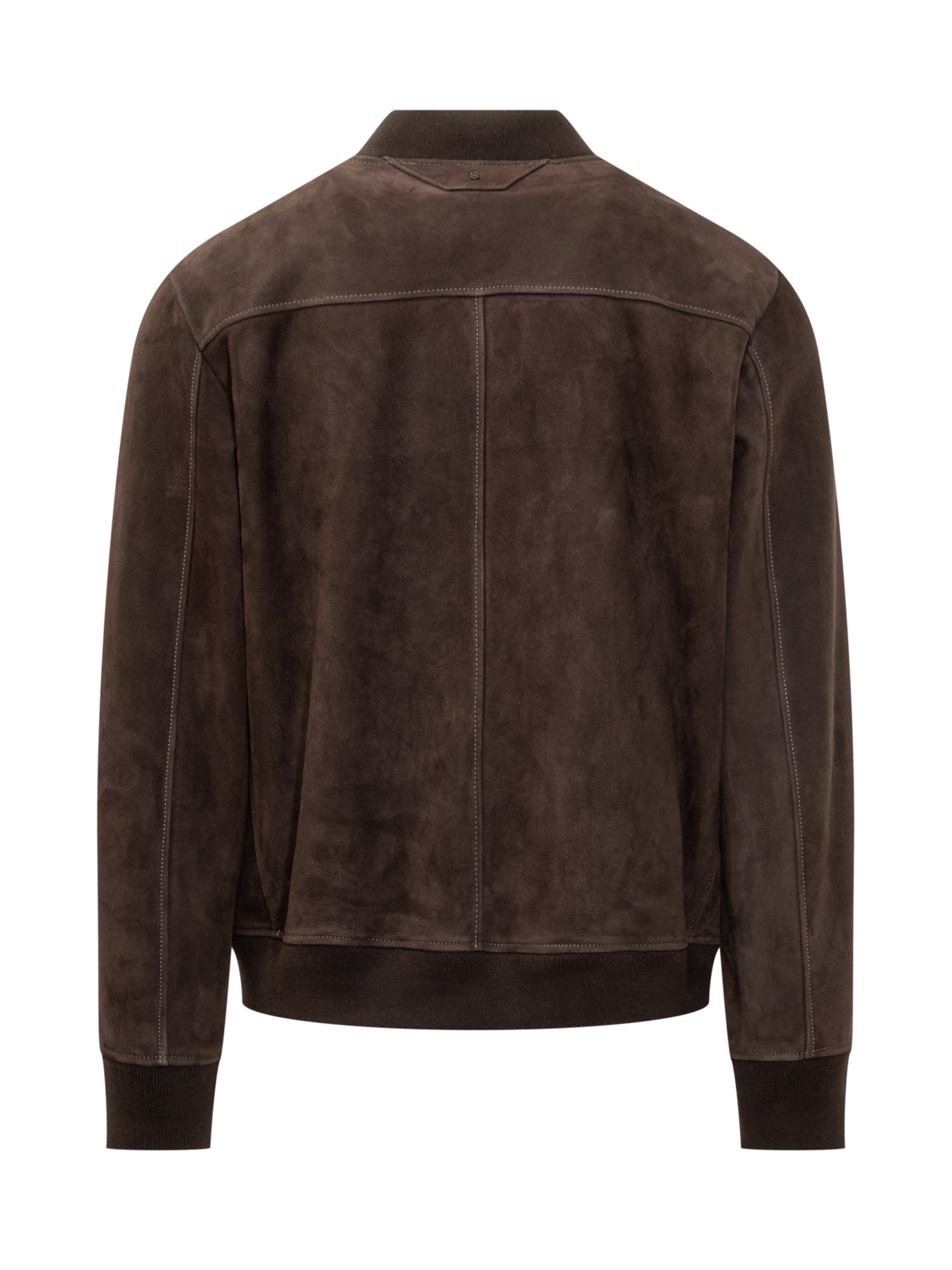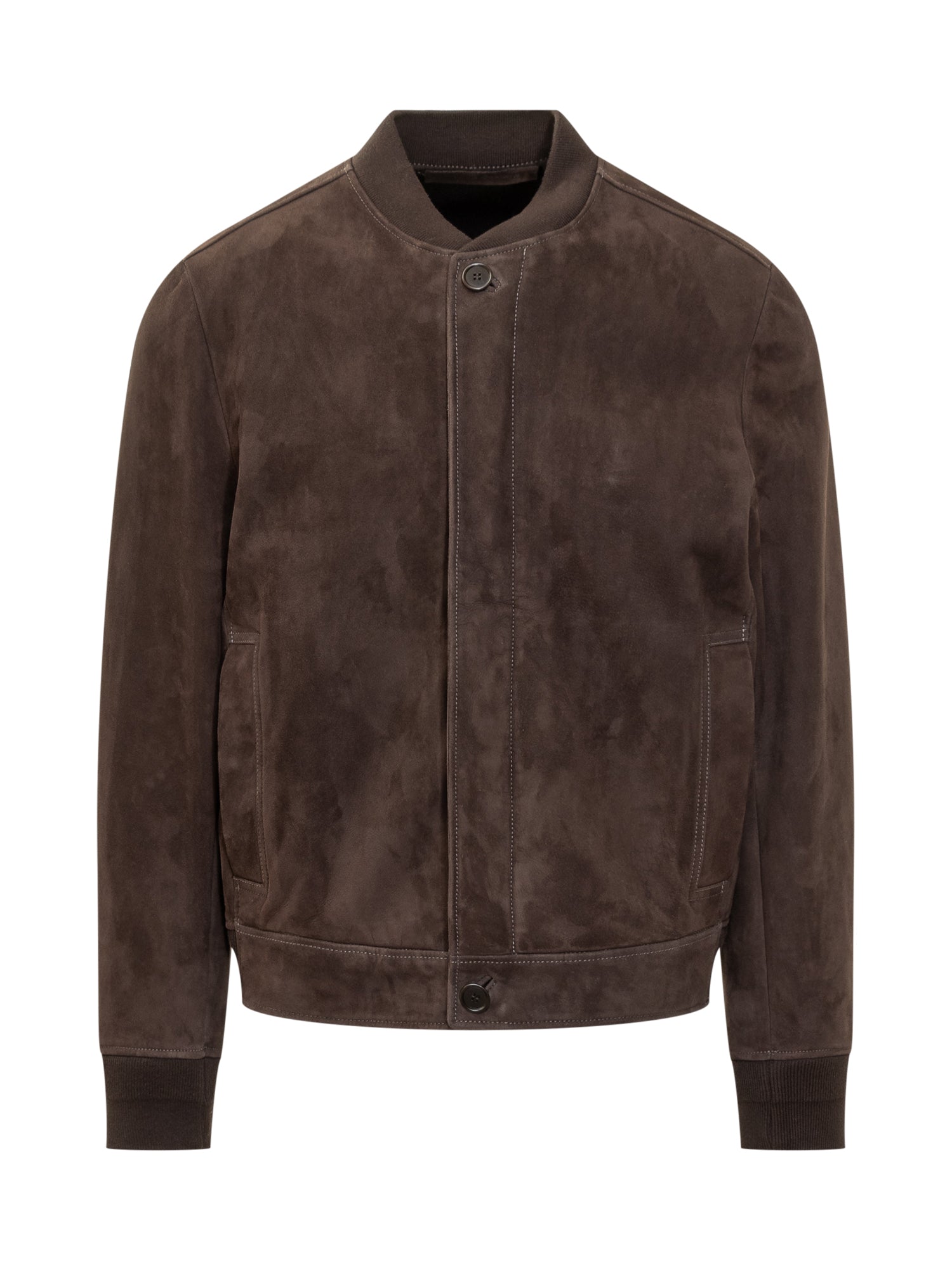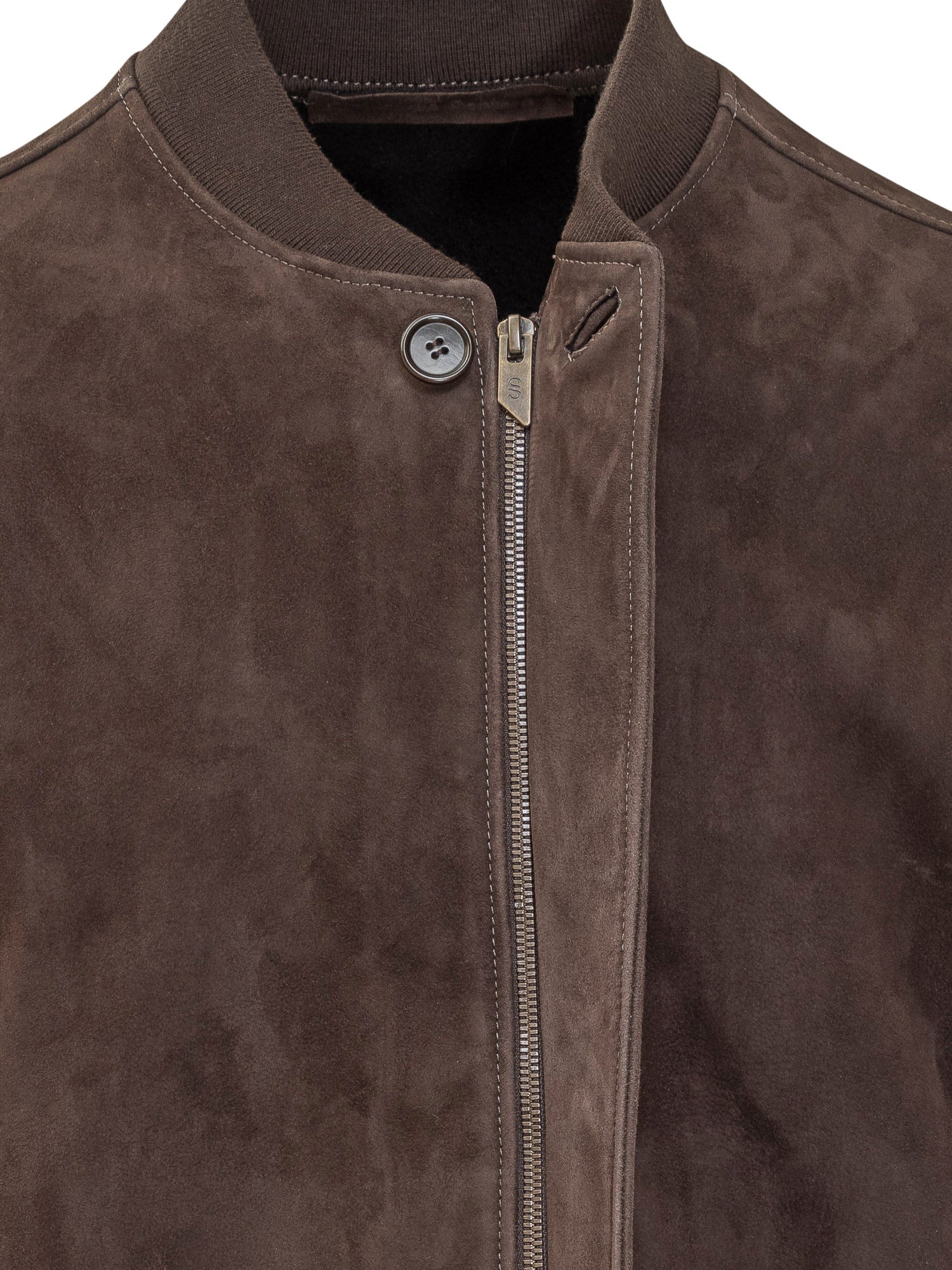 Giacca bomber marrone Salvatore Santoro in pelle scamosciata con chiusura a bottoni e collo, polsi e fondo a coste.