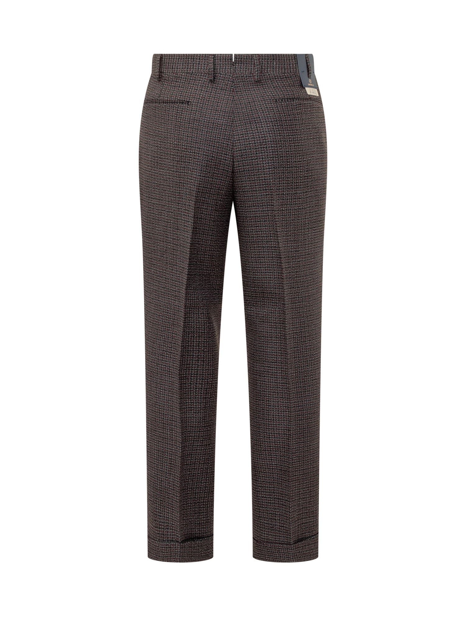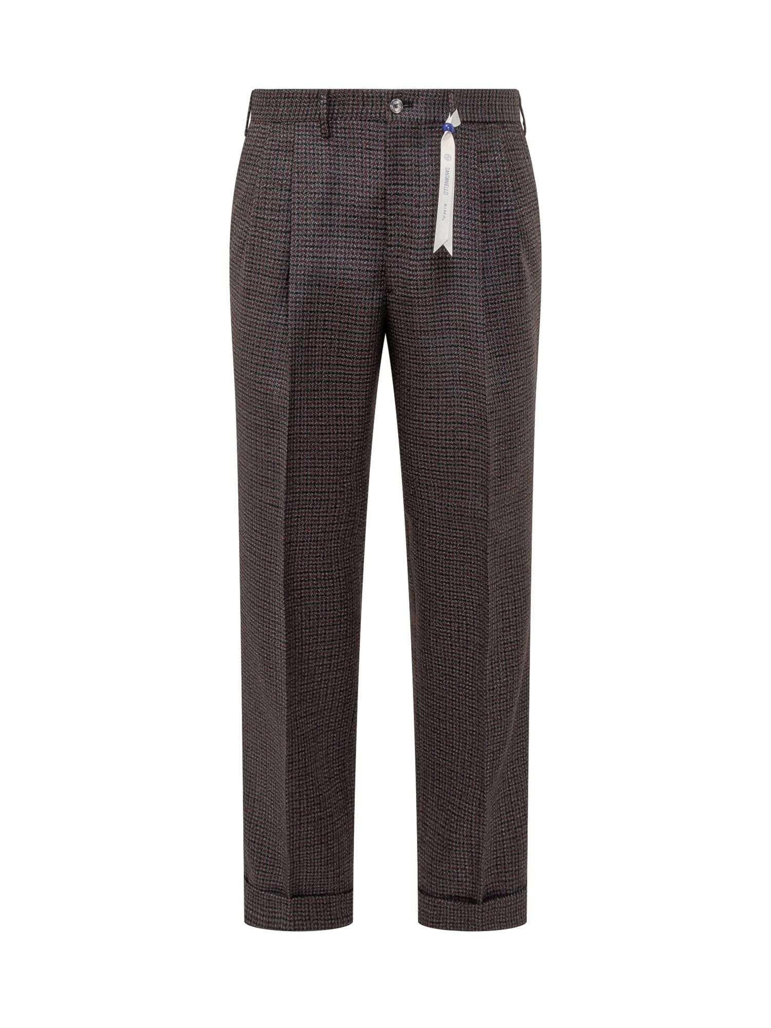 Pantaloni Santaniello in tessuto Principe di Galles con pinces frontali e risvolto al fondo. Eleganti e moderni, ideali per look formali o casual raffinati. Chiusura con bottone e zip.