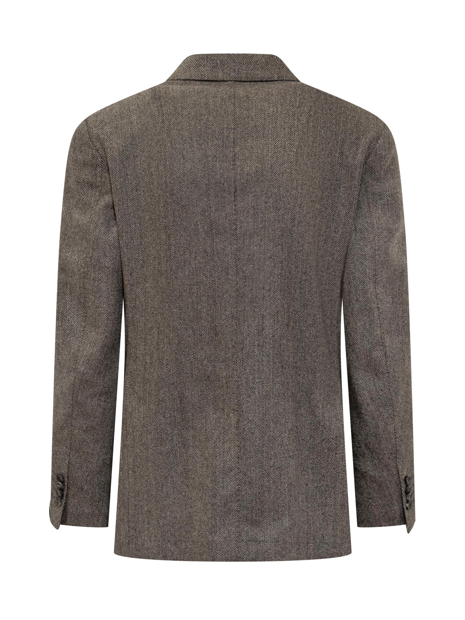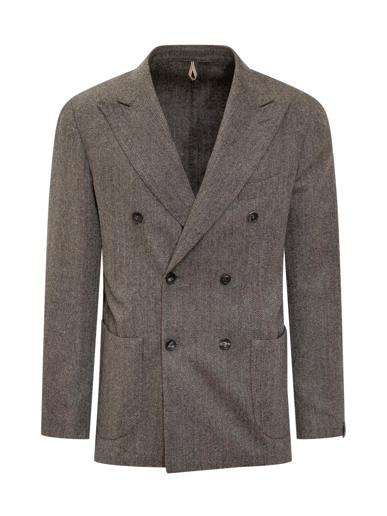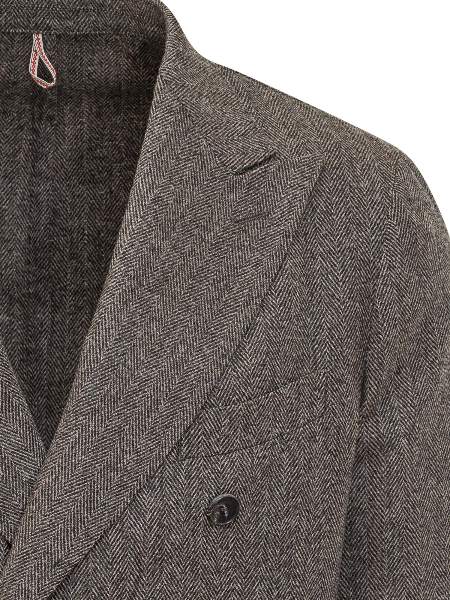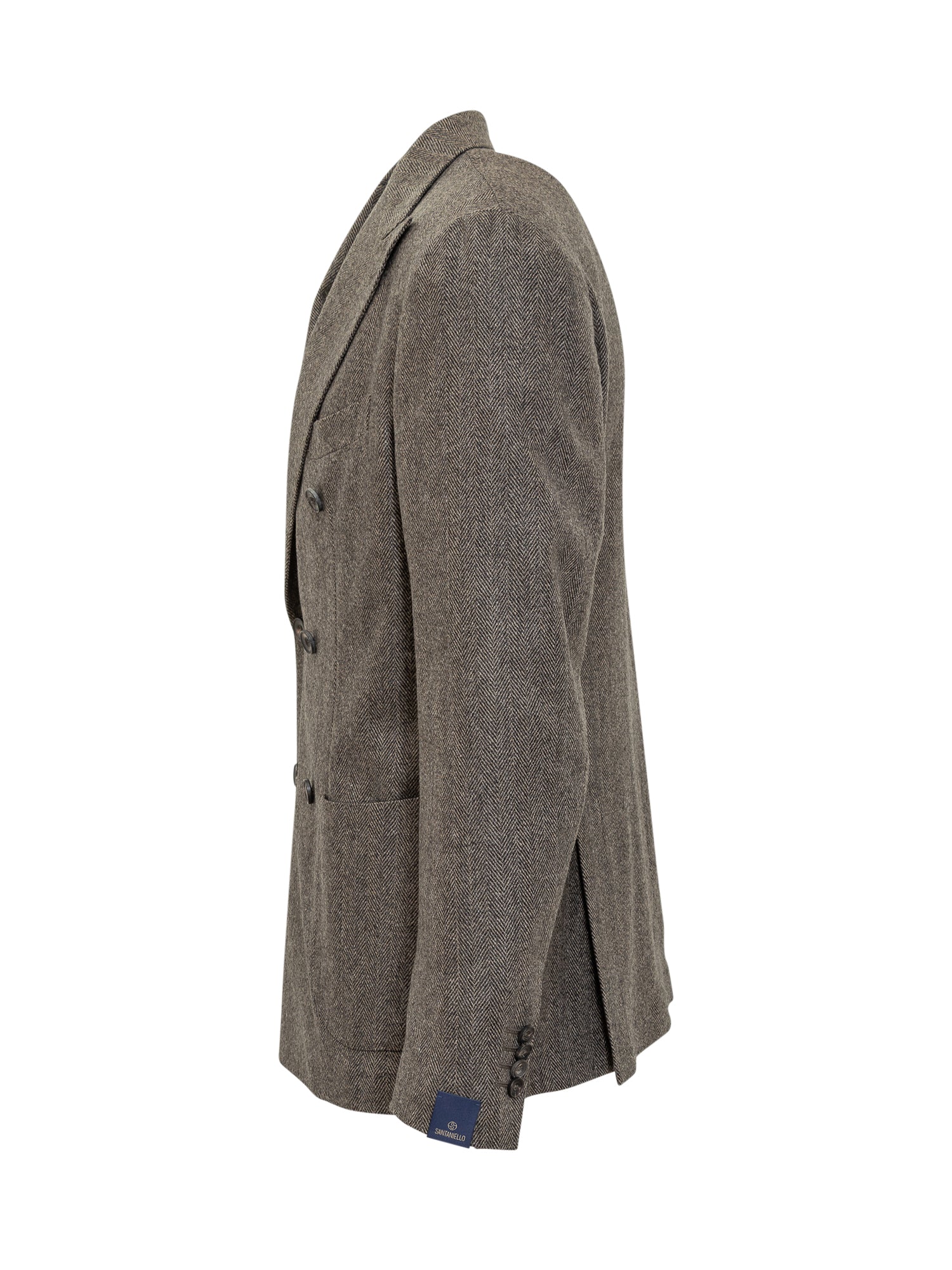 Giacca Santaniello doppiopetto in lana con motivo a spina di pesce marrone.