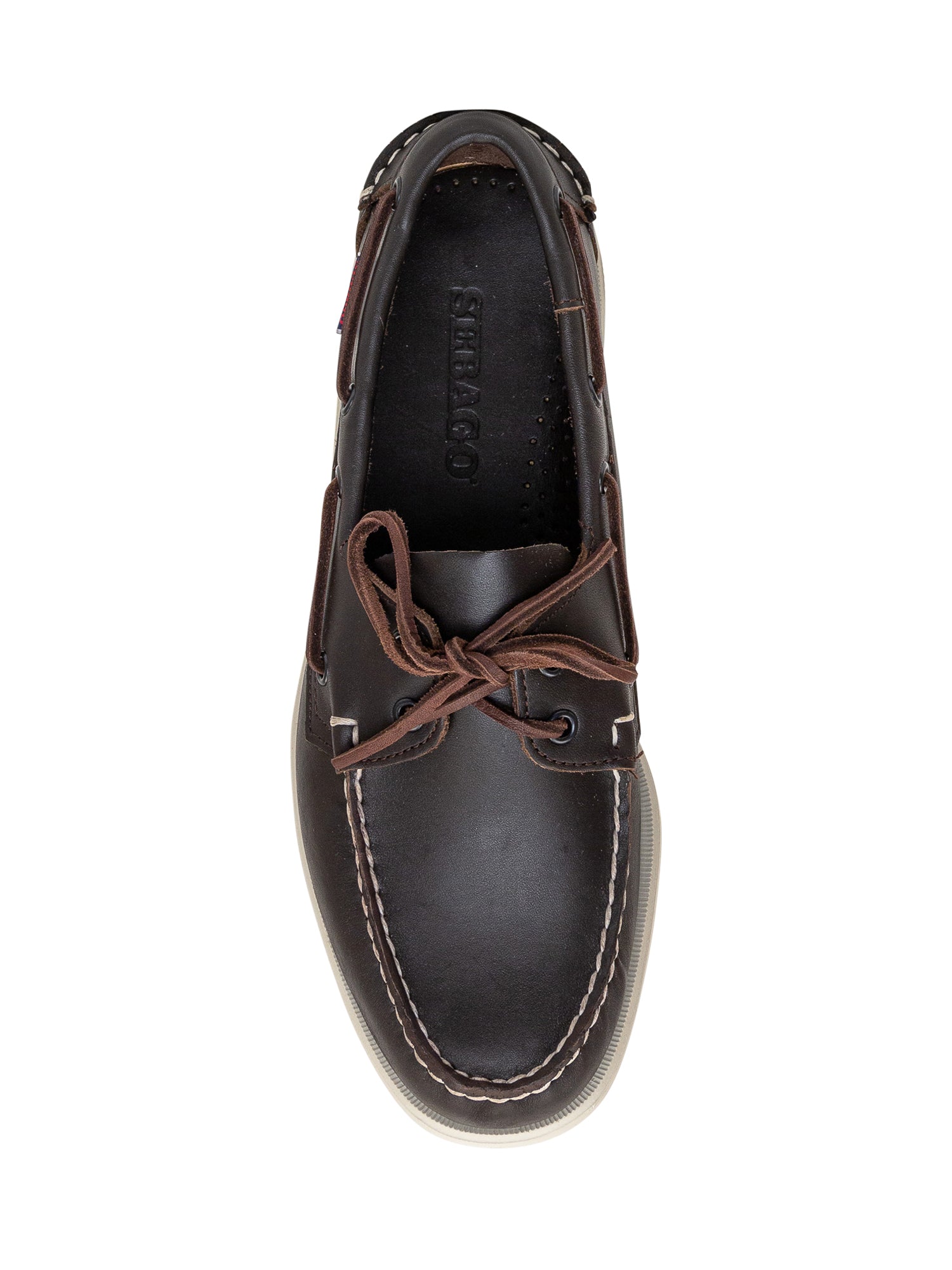 Mocassino in pelle lucida. Lacci in pelle. Cuciture in vista.