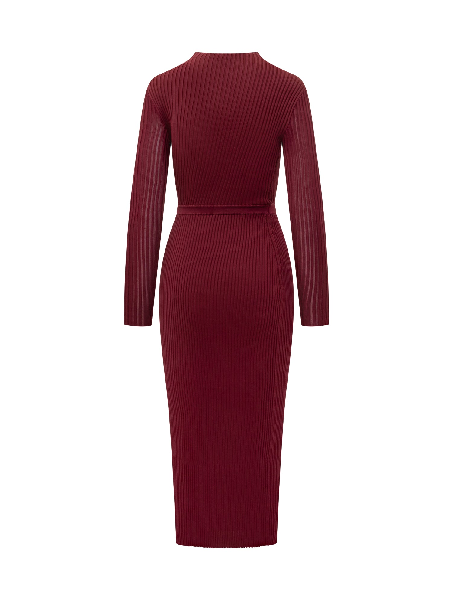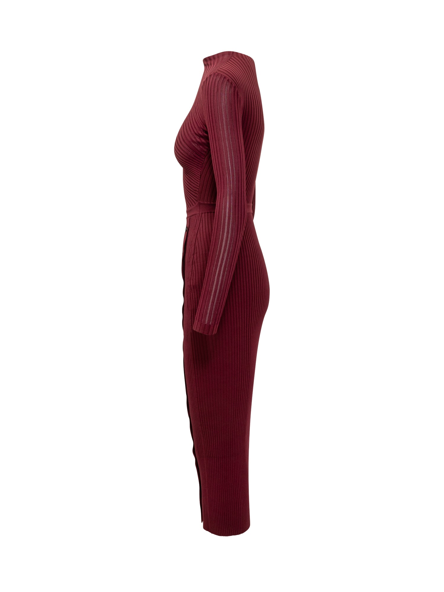 Abito midi Self-Portrait in maglia bordeaux, con dettaglio cut-out asimmetrico e chiusura a bottoni frontale.