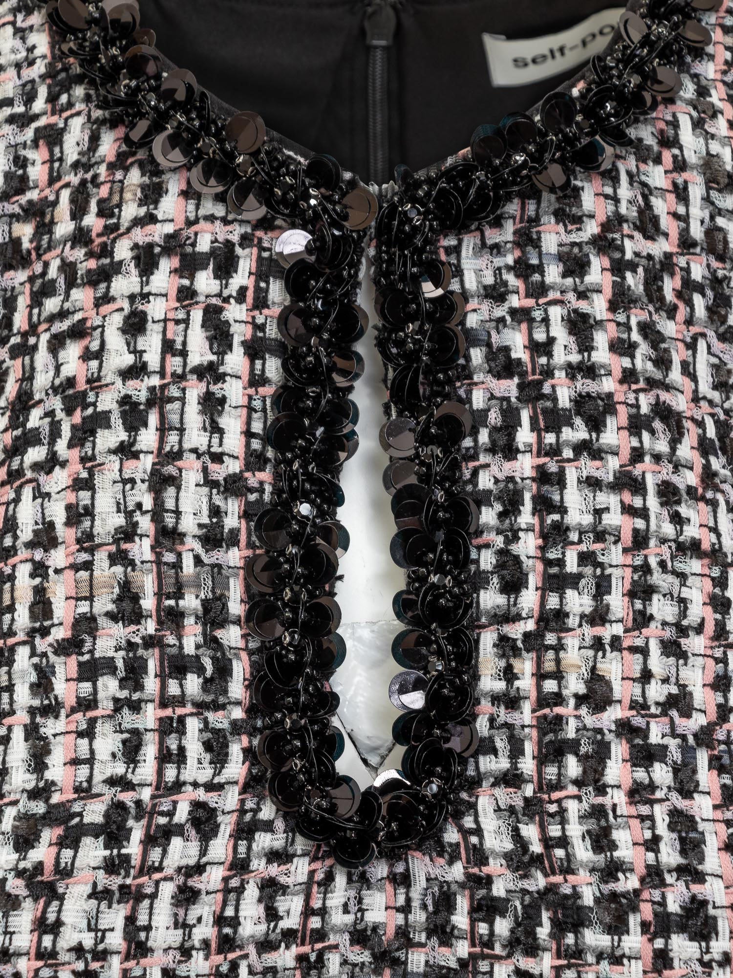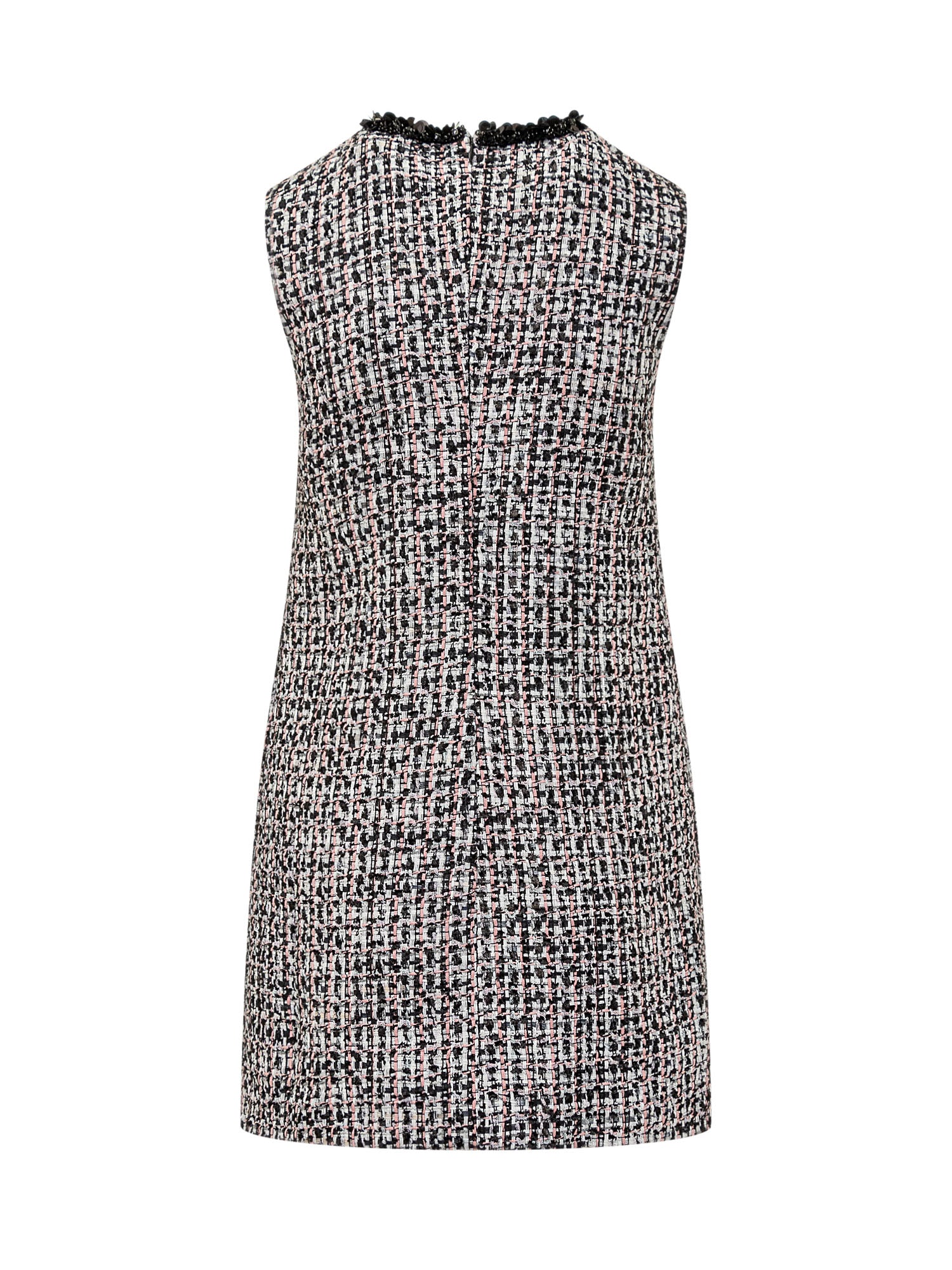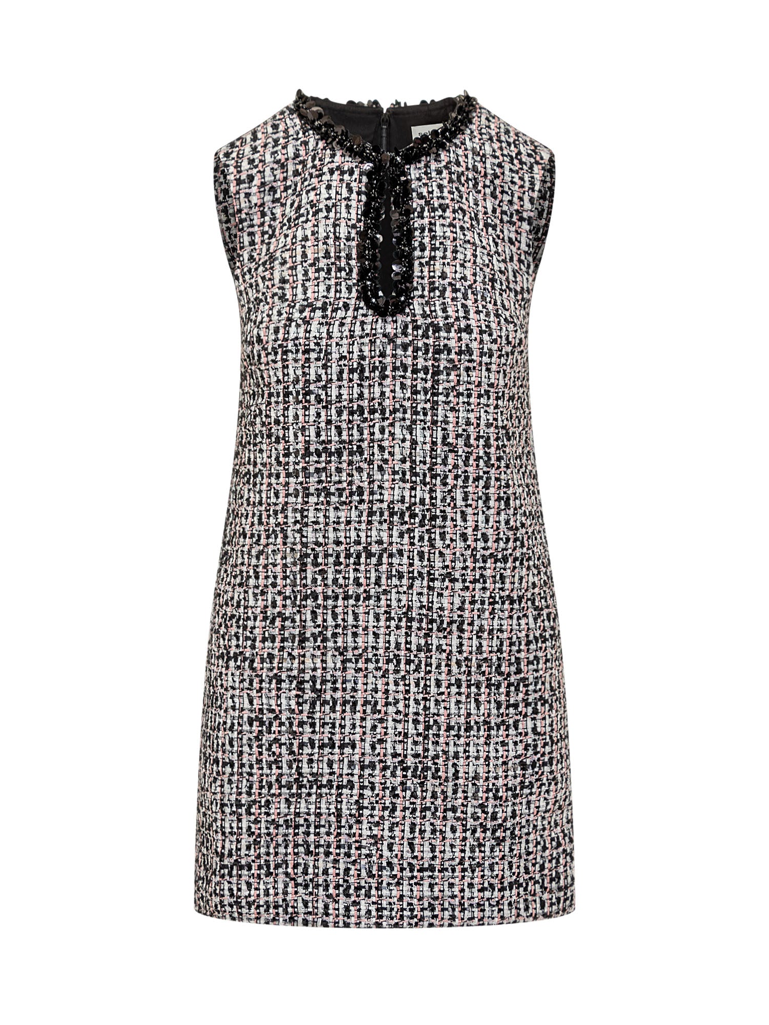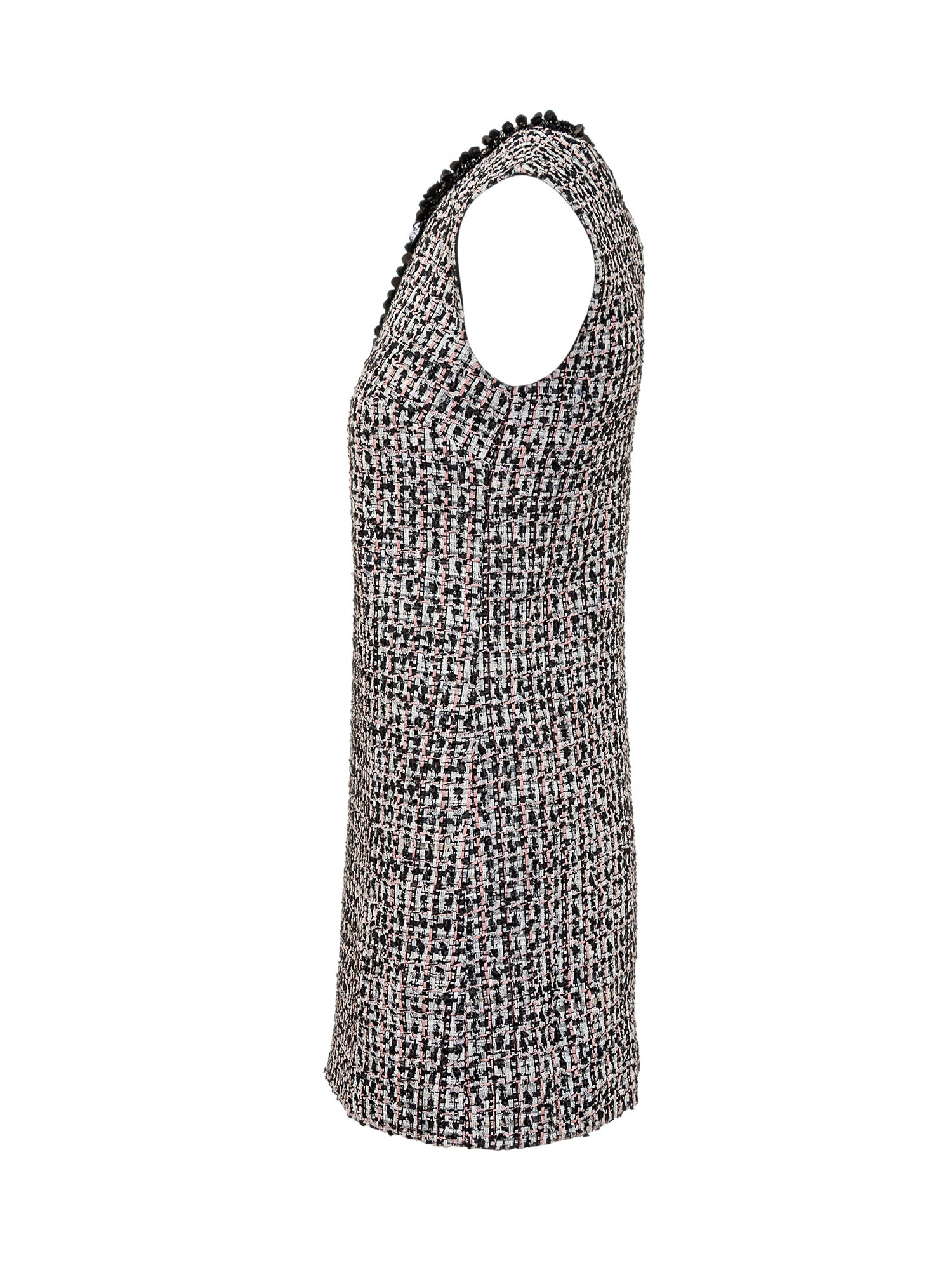 Abito mini smanicato. Girocollo. Cut-out sul davanti. Chiusura con zip sul retro. Lavorazione tessuto con motivo intrecciato di vari colori. Orlo con paillettes applicate.