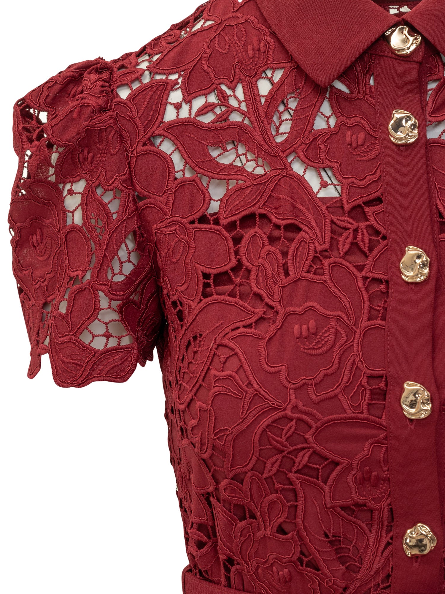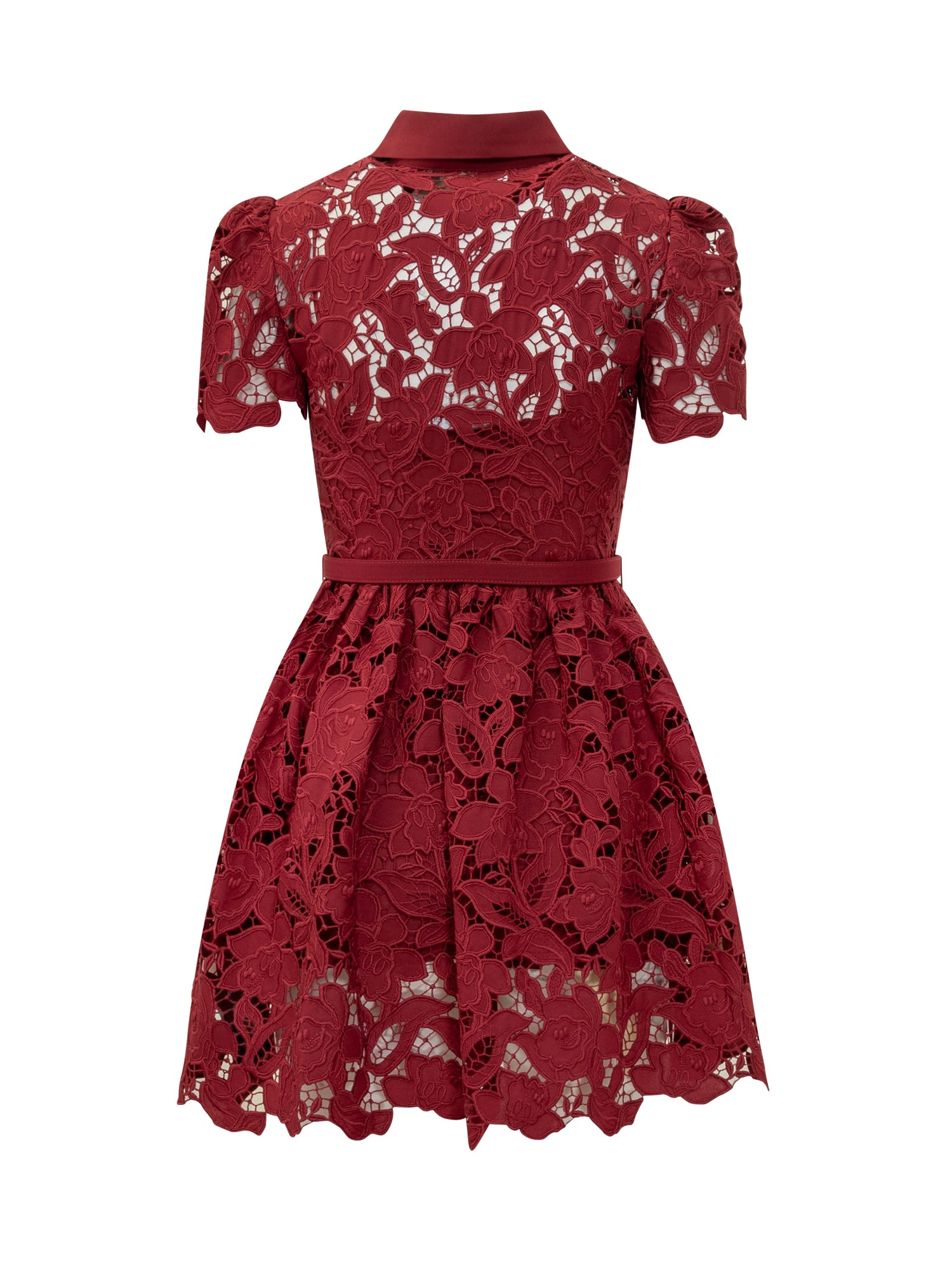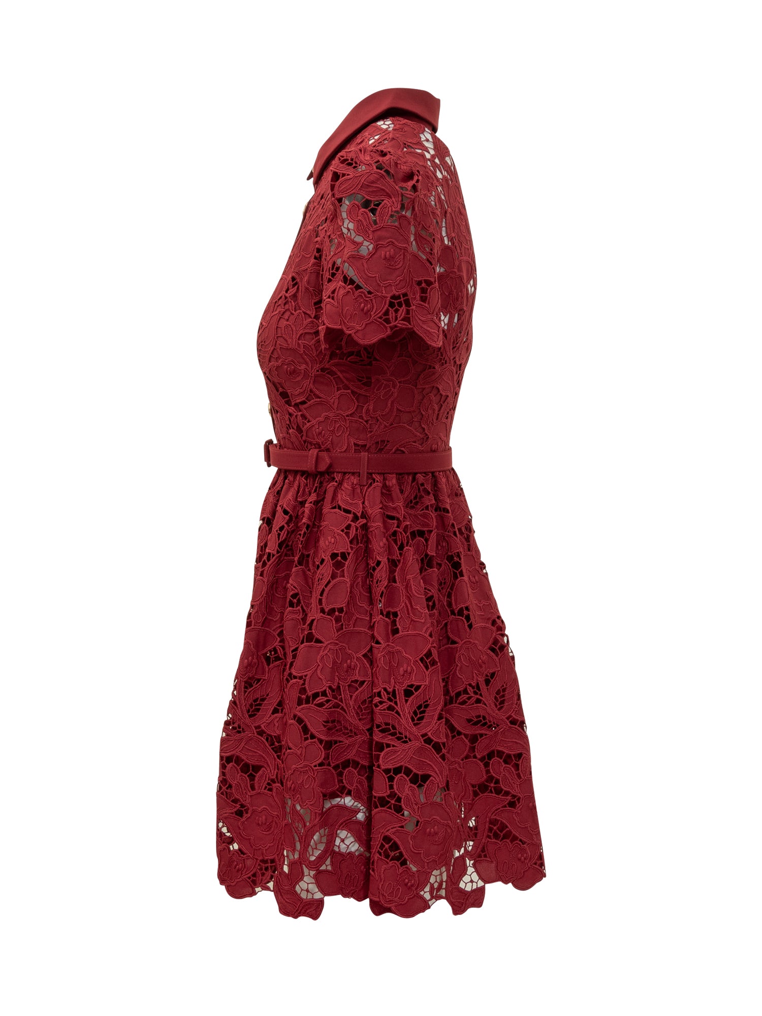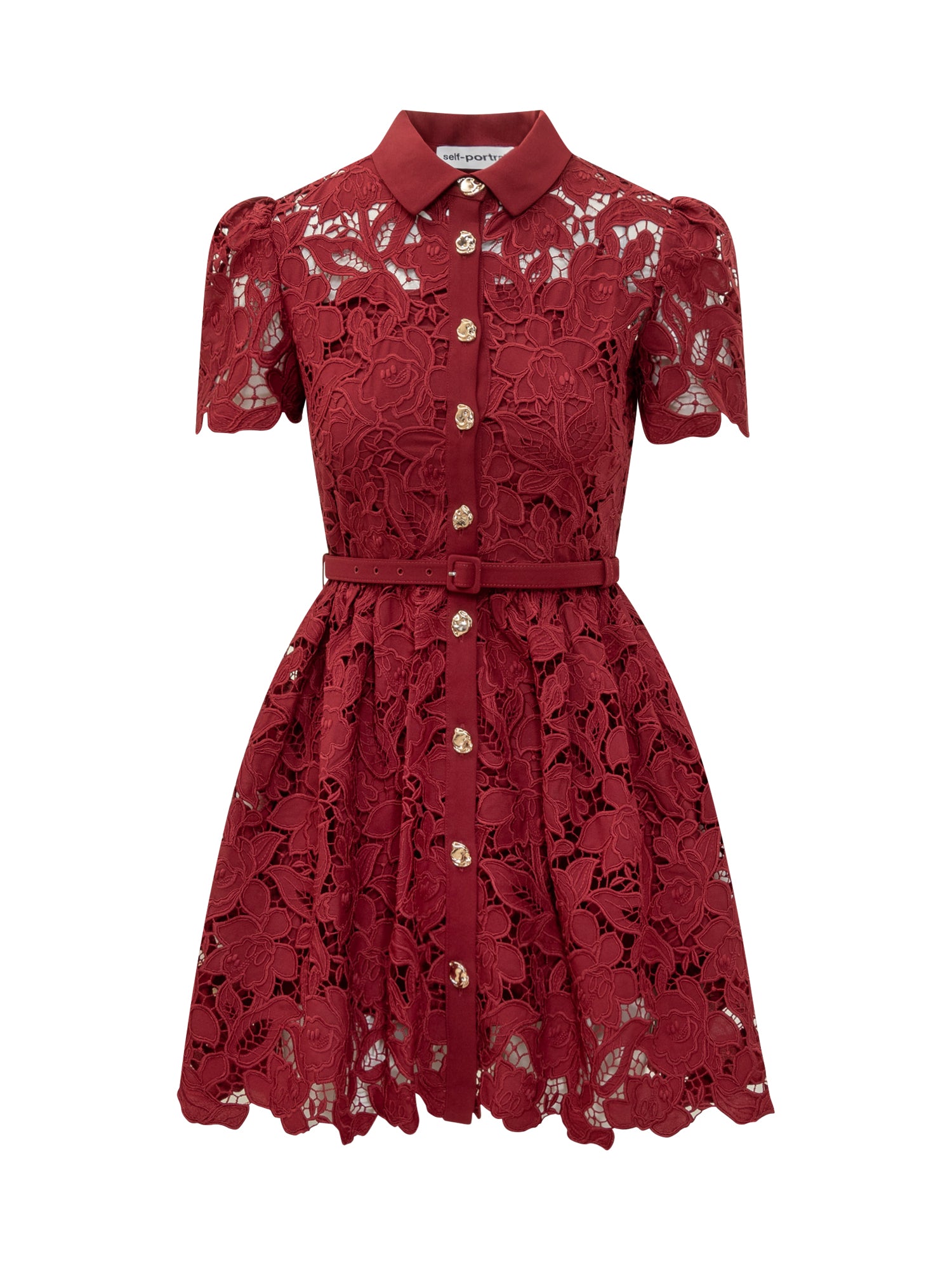 Mini abito in pizzo burgundy firmato Self-Portrait con colletto classico, bottoni gioiello e cintura coordinata.