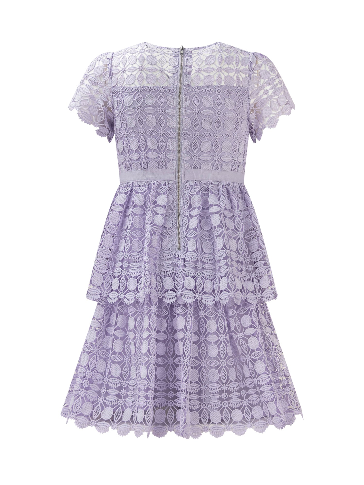 Abito con maniche corte. Zip sul retro. Motivo petali in pizzo all-over. Fiocco sul colletto.