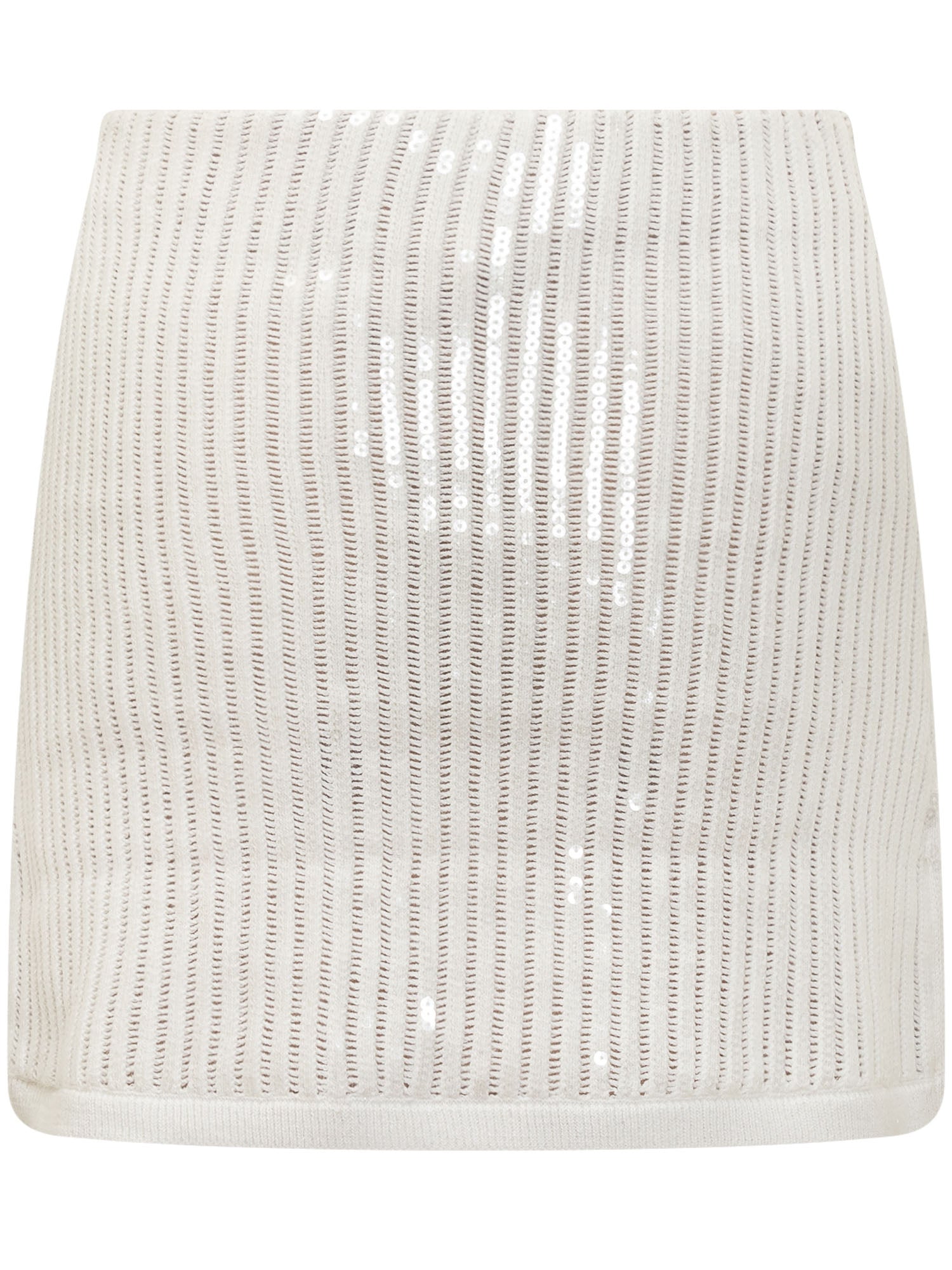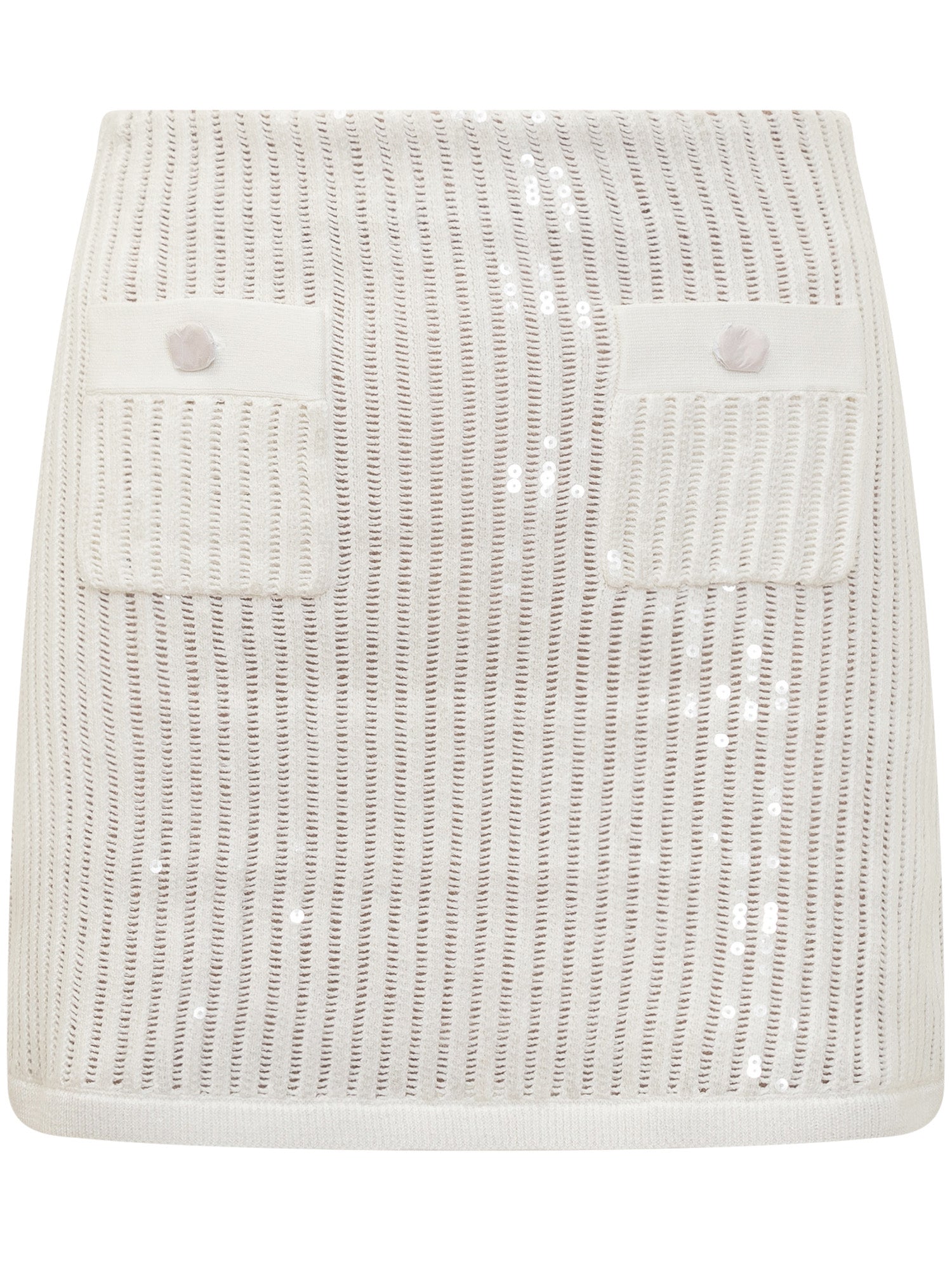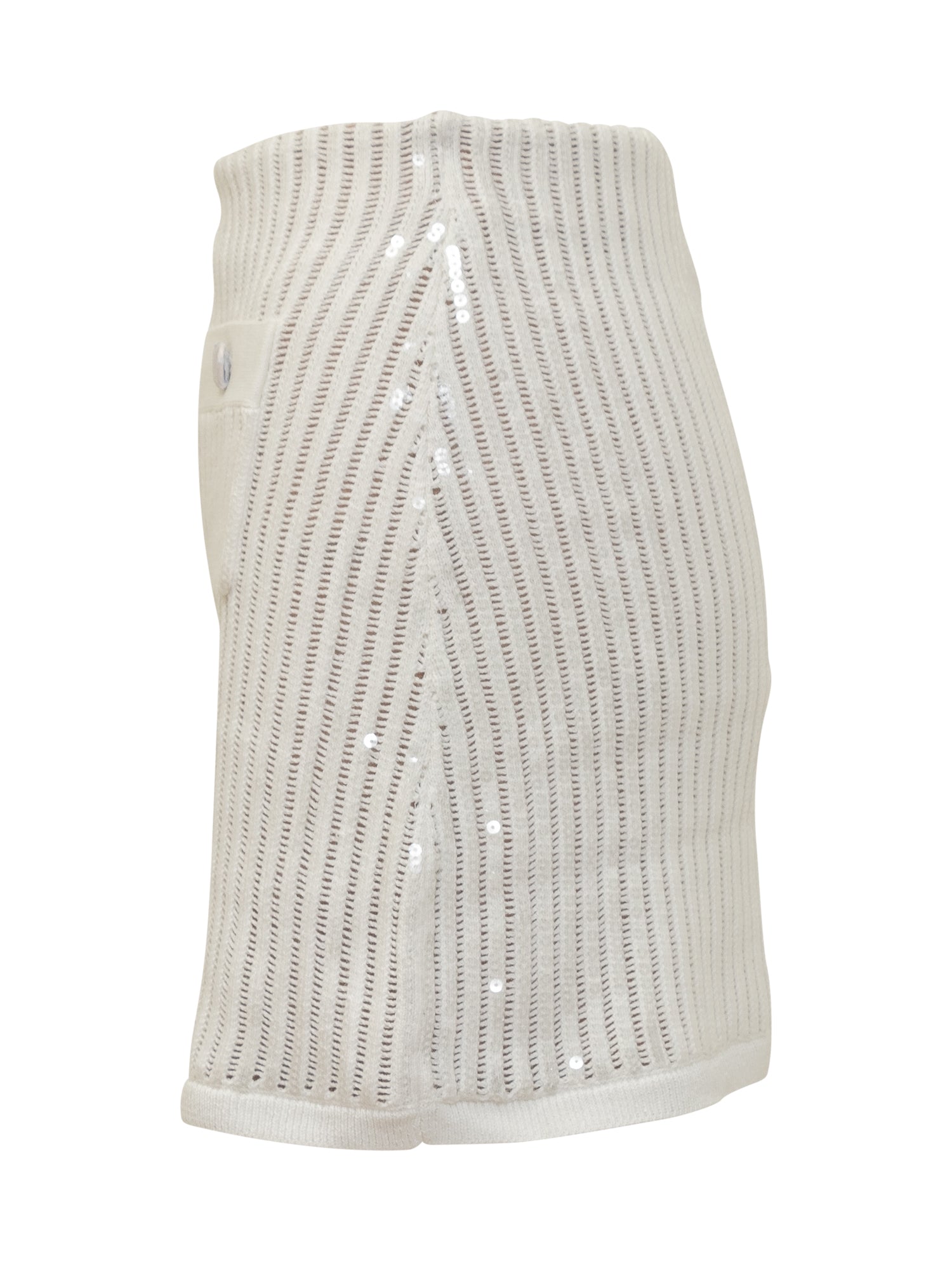 Fascia elastica in vita. Due tasche frontali. Bottoni ornamentali. Finiture in paillettes.