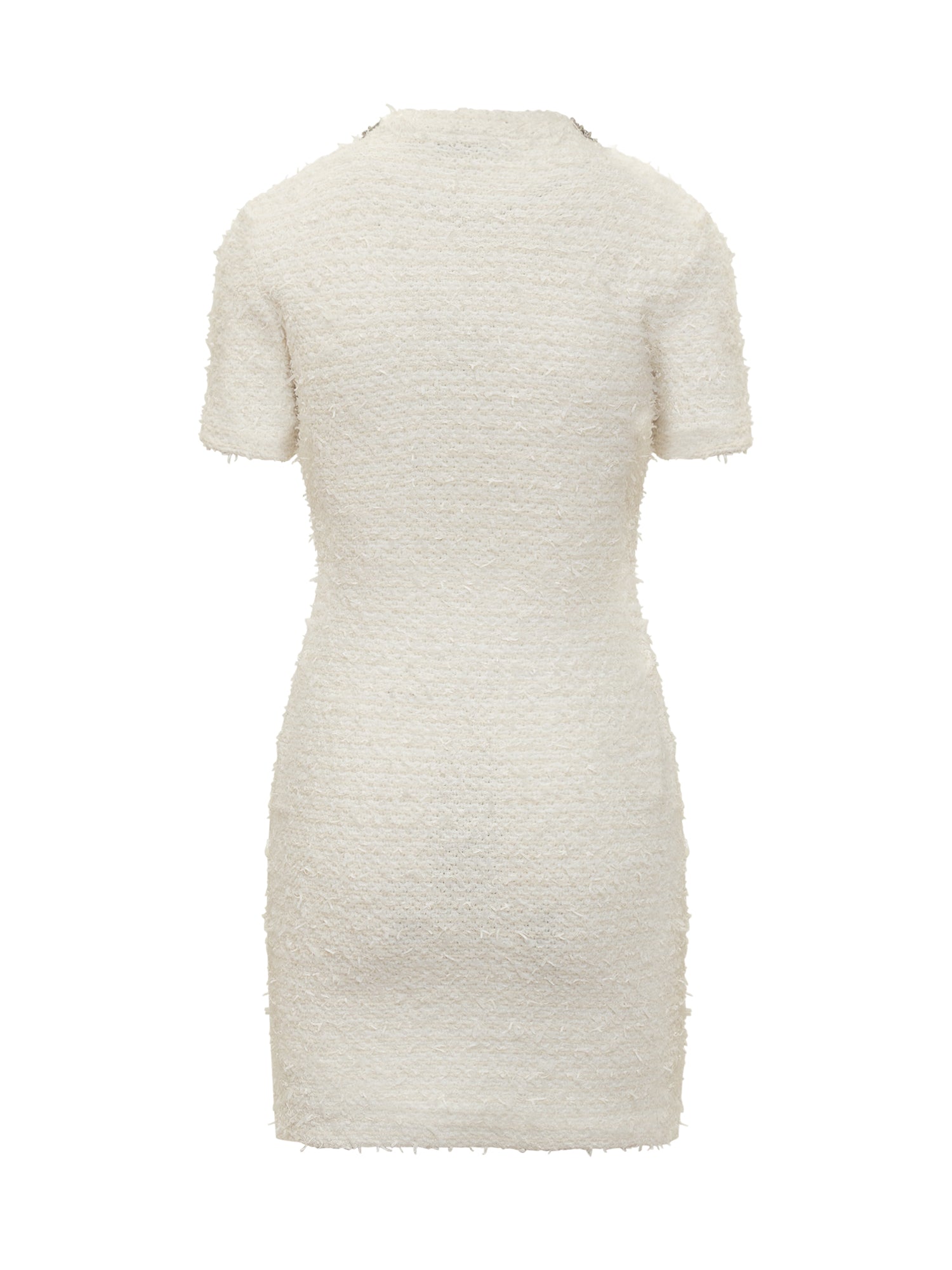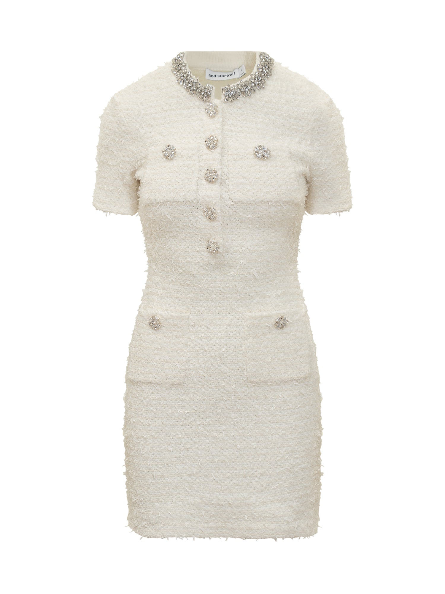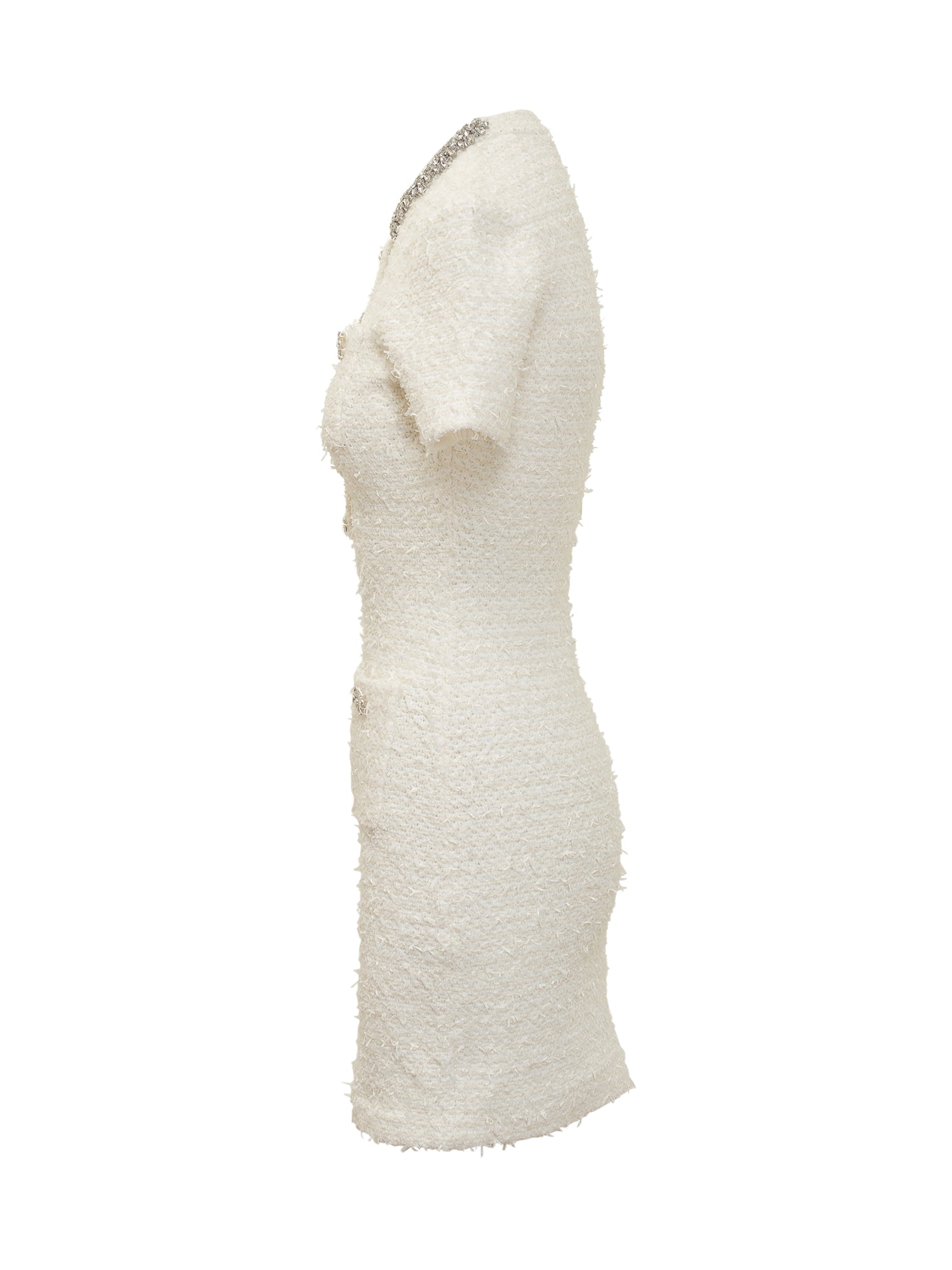 Abito corto in boucl\u00E9 avorio con maniche corte, bottoni gioiello e collo girocollo ornato di cristalli.