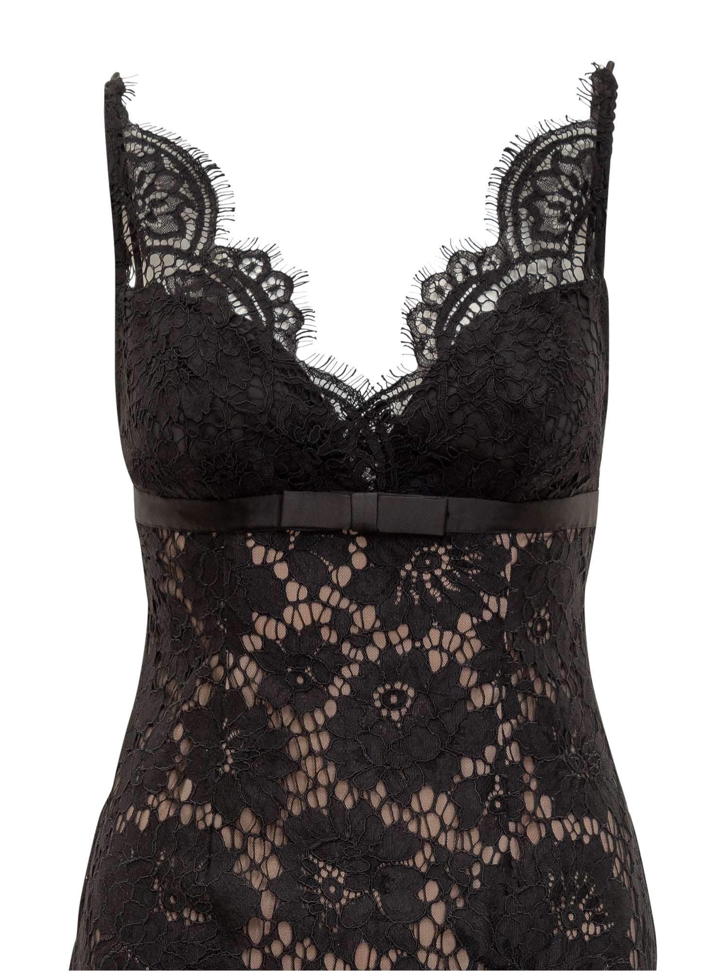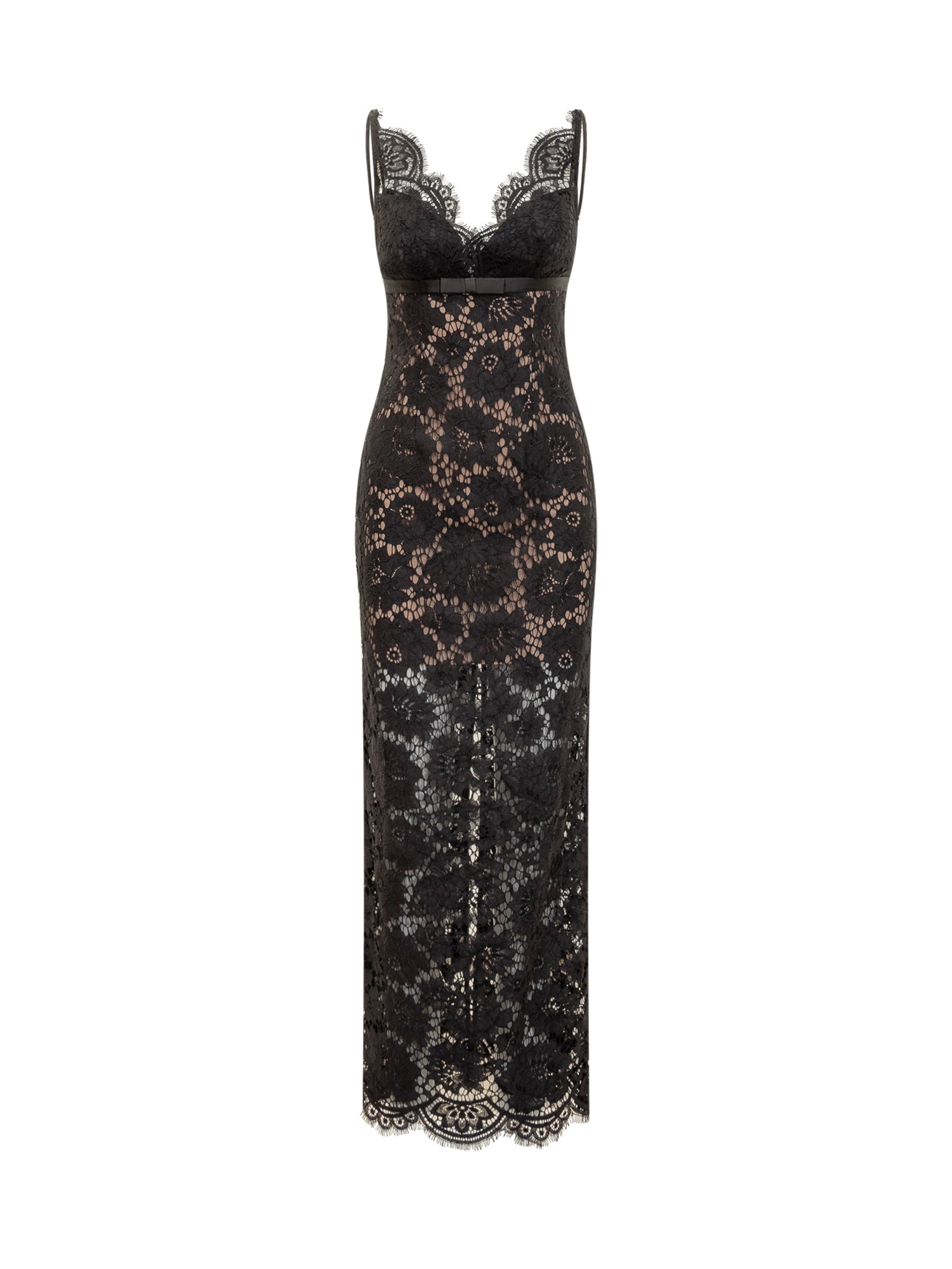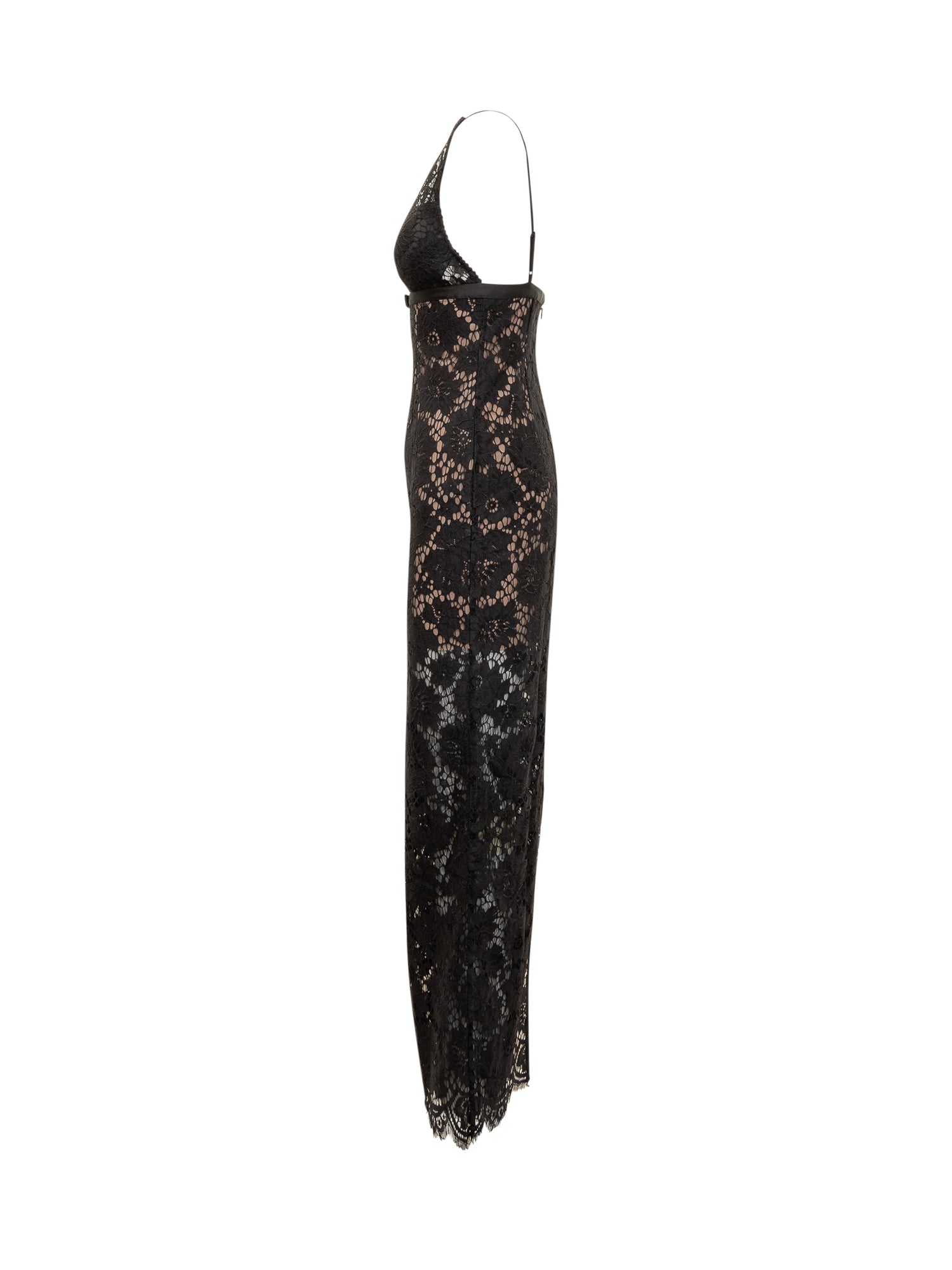 Abito lungo in pizzo nero con spalline sottili, bustier a cuore e fodera nude.